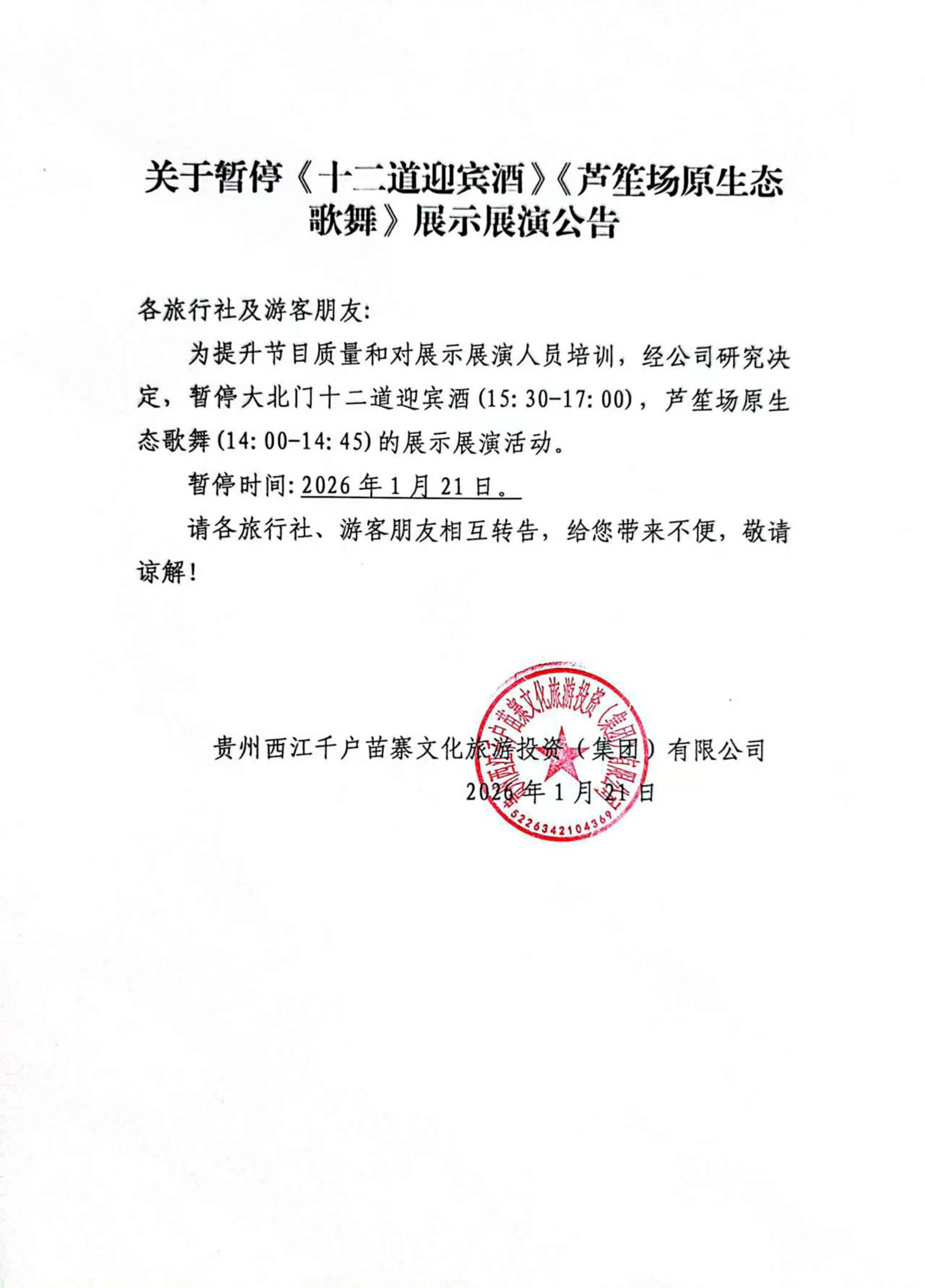关于暂停《十二道迎宾酒》《芦笙场原生态歌舞》展示展演公告