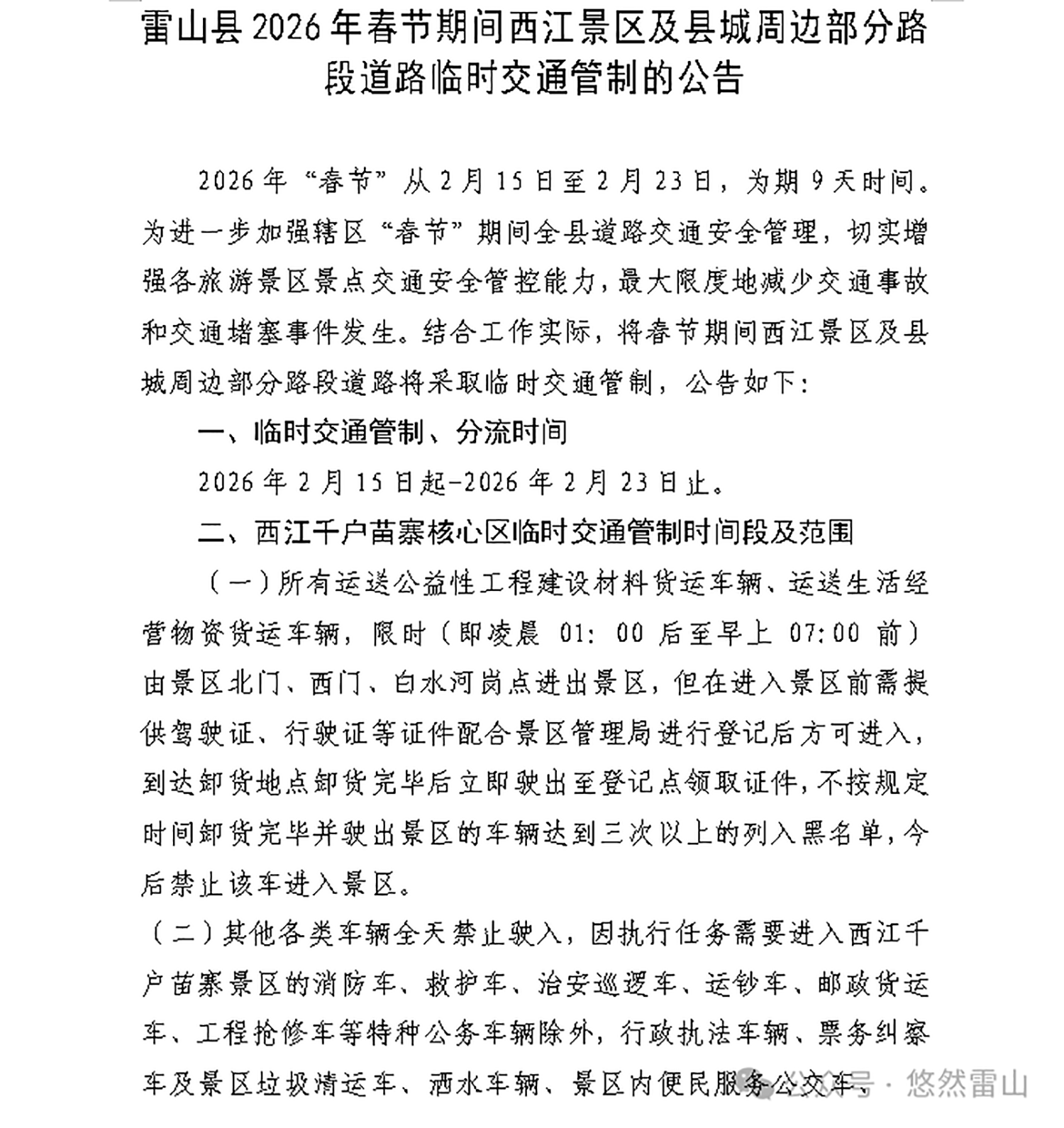 关于雷山县2026年春节期间西江景区及县城周边部分路段道路临时交通管制的公告