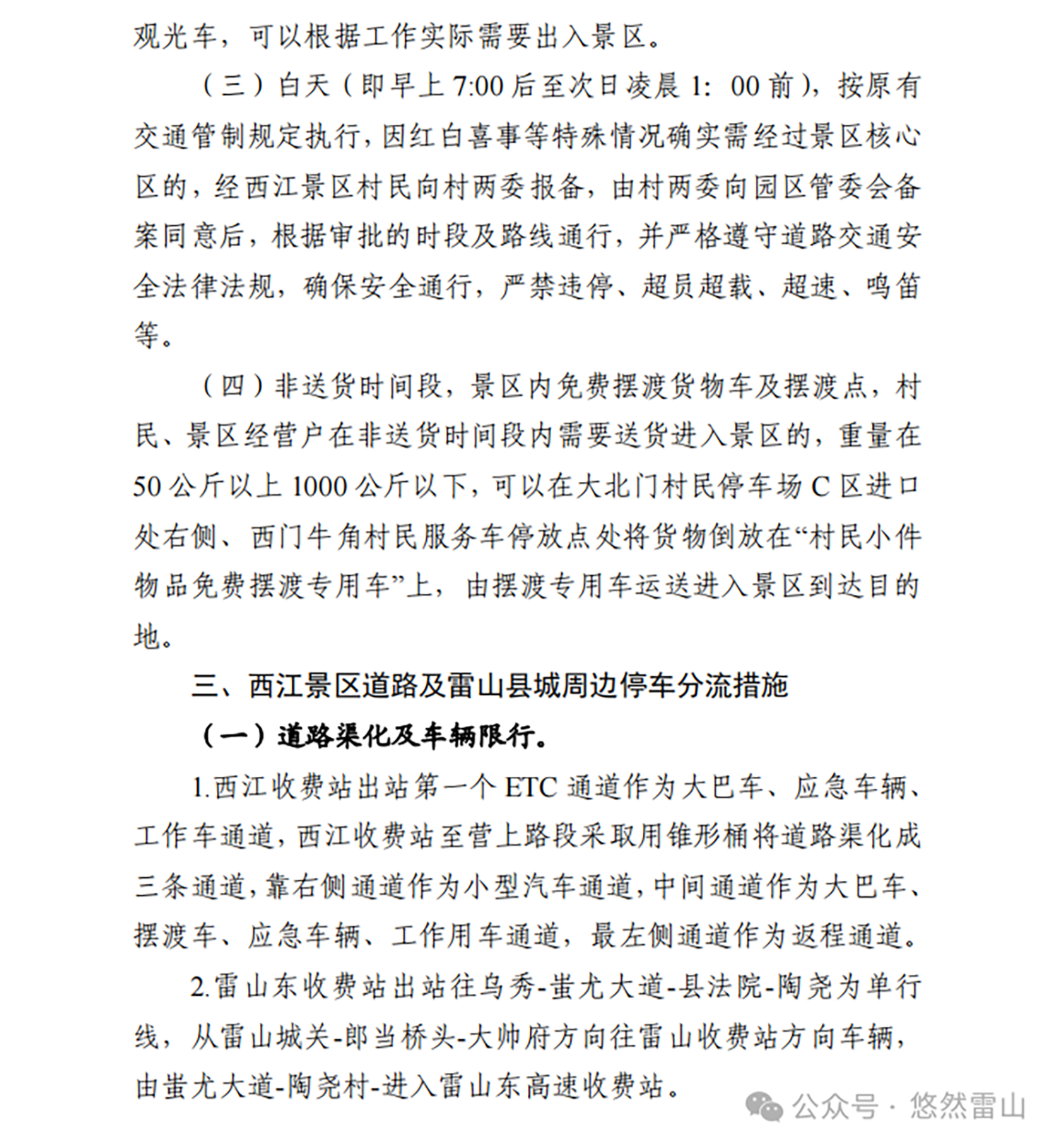 (三)白天(即早上07:00 后至次日凌晨 01:00 前),按原有交通管制规定执行,因红白喜事等特殊情况确实需经过景区核心区的,经西江景区村民向村两委报备,由村两委向园区管委会备案同意后,根据审批的时段及路线通行,并严格遵守道路交通安全法律法规,确保安全通行,严禁违停、超员超载、超速、鸣笛等。