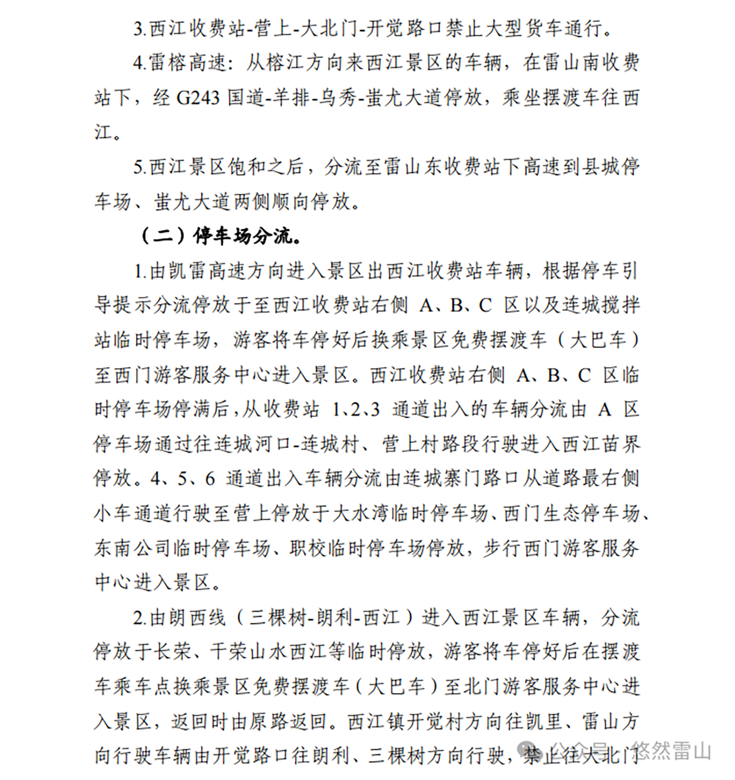 3.凯雷高速因车流量较大反堵到西江匝道或景区达到饱和发布预警通告时,对西江匝道进行管控,将由凯雷高速往西江车辆分流至雷山东收费站。由雷山东收费站分流至乌秀、蚩尤大道方向,引导游客车辆前往郎德、大塘等景区游玩。其他拟进入西江景区车辆停放于蚩尤大道道路两侧、思源中学校门口路段、罗浪洲地、大广场附近路段临时停车场停放,游客将车停好后,可在陶尧桥头、治安1号、2号风雨桥、郎当桥头换乘景区免费摆渡车(大巴车)至西门游客服务中心进入景区。