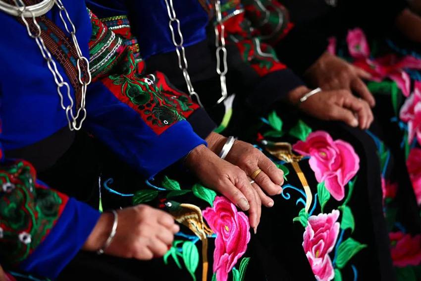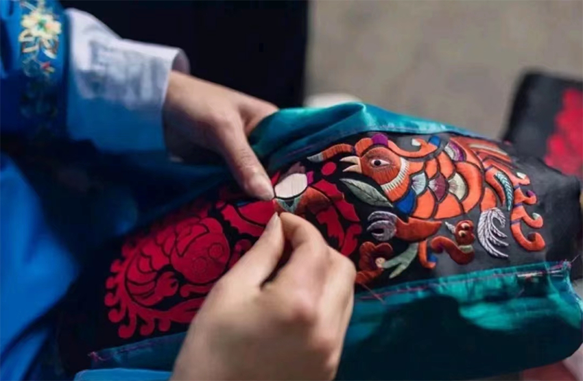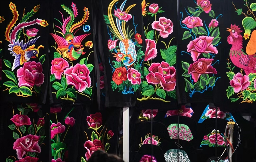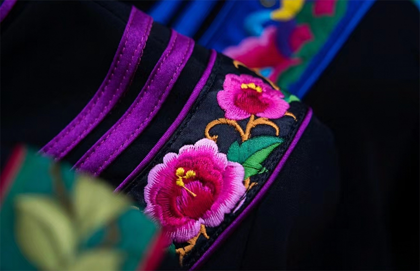 进门不远处,就能看到苗绣制作工艺。苗族有句谚语:“母亲手巧儿穿好,父亲勤奋儿吃饱”。苗族刺绣都是无图作业,艺从心生,种类多,工艺精,而且想象丰富、色彩艳丽、造型奇特。
