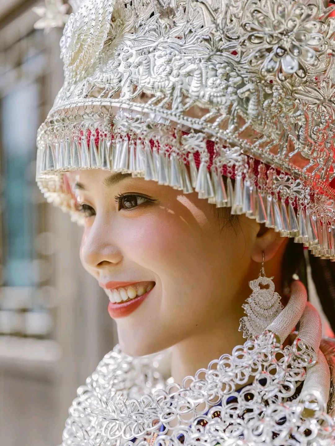 苗族男女都喜欢戴银饰,其中以妇女最为常见。苗族女性盛装,全身银饰数量达50多件,重7-10公斤。头戴银冠、颈饰项圈、身着银衣、腰系银链、手配银镯是每一个苗族女孩的银饰标配,因而有“无银不成苗姑娘”的说法。