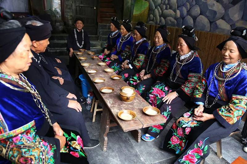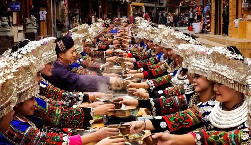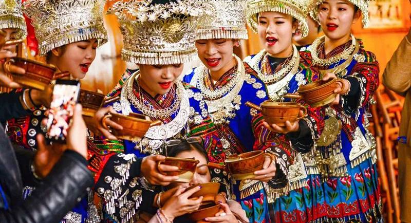 苗族最热情的苗族敬酒礼。西江千户苗寨以山为友,以山为伴,大山给苗寨生存的一切,所以要像山一样对待每一位来客,为此用“高山流水”礼待客人,寓意热情像山一样高,友谊像水一样长。