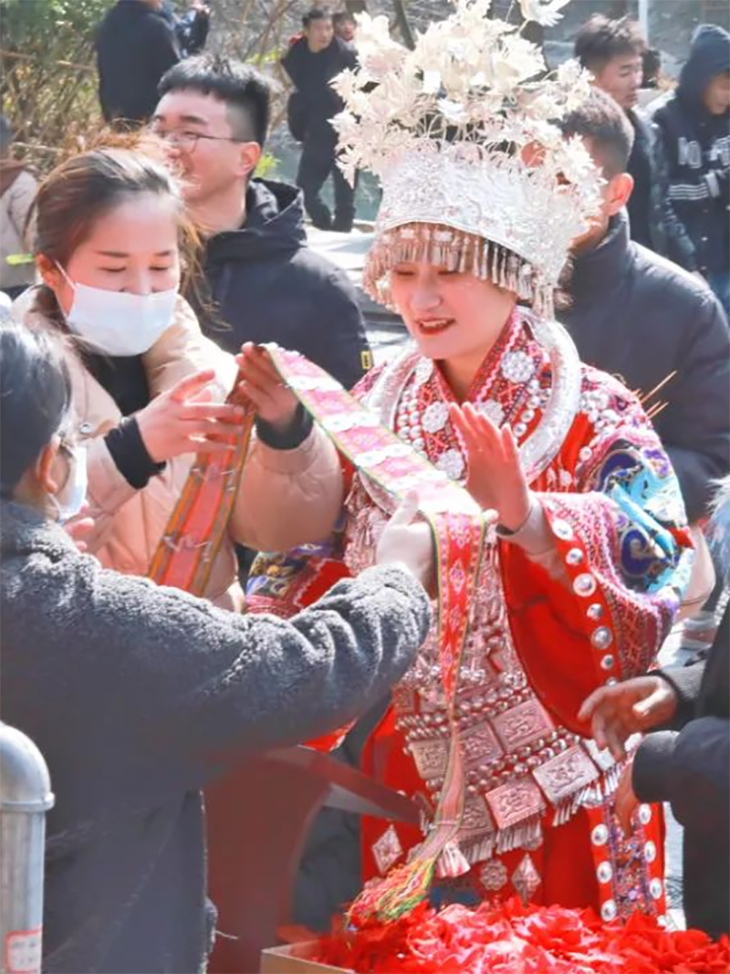 “讨花带”,是苗族青年男女公开谈情说爱、自由恋爱的一种活动。在各种节庆活动期间,各寨男女老少均穿着盛装欢聚芦笙场,可谓是“银山银海”。“讨花带”成为了青年男女第一次接触沟通的纽带,双方有了一面之缘,有意者便开始深交,最终缔结白首之约。讨花带这个习俗活动也被称为苗族相亲大会,其实就是给了年轻人们相互认识的机会,是否真的成功也要看后续两人的意愿。