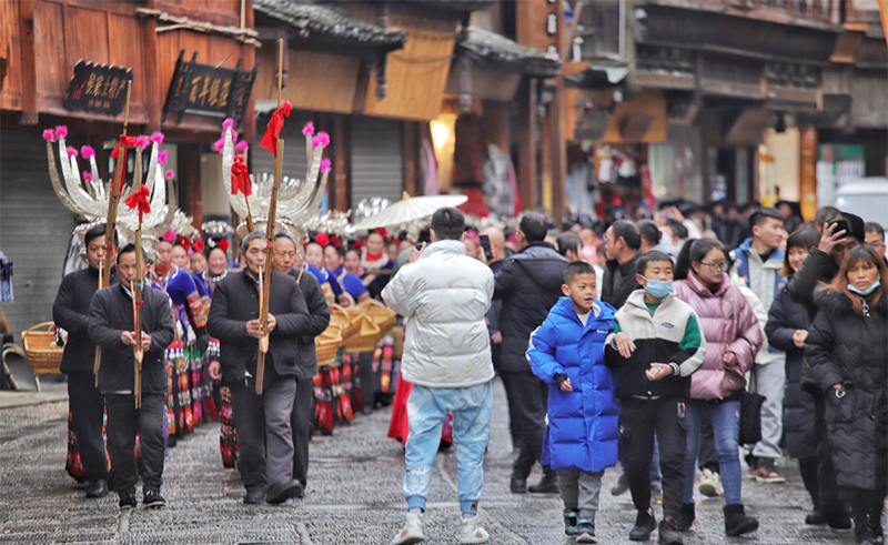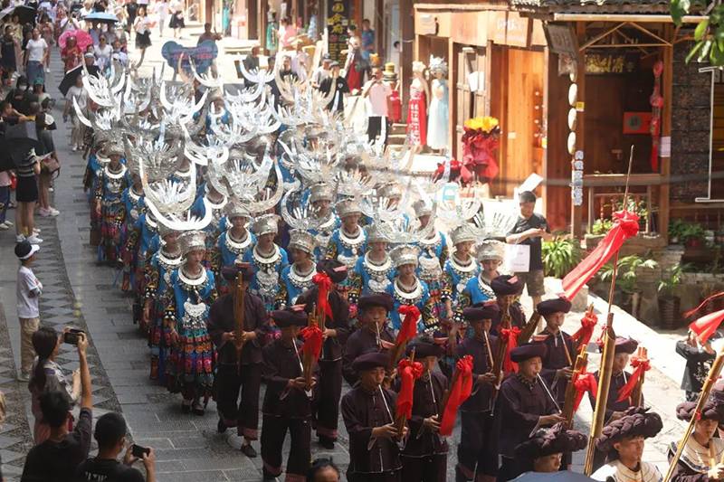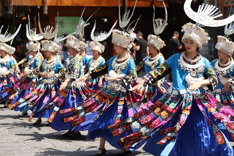苗族芦笙服饰大巡游展演,苗族同胞们身穿华丽的苗族服饰、吹着悠扬空灵的芦笙曲调、热情洋溢的苗家舞姿…既展示了苗族妇女们文化智慧的结晶,也体现苗族“穿在身上的史书”的文化意义。