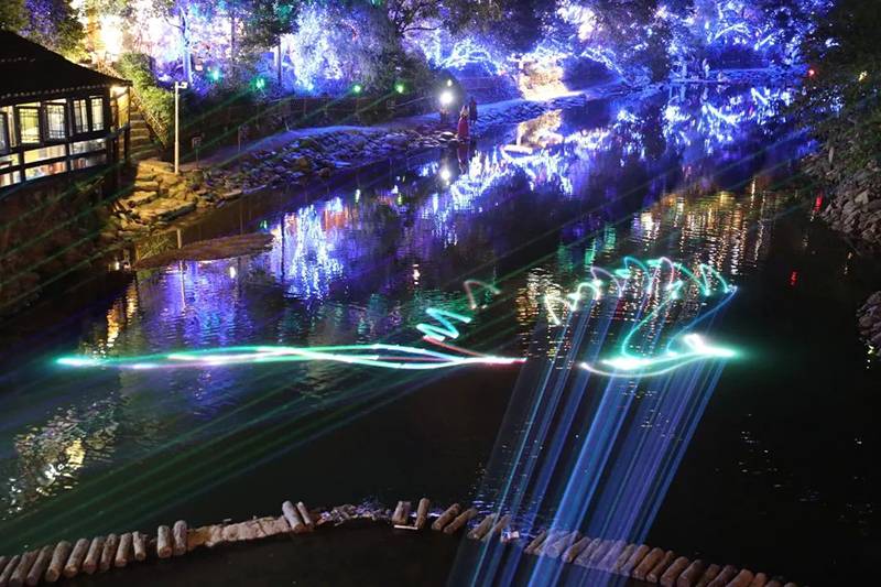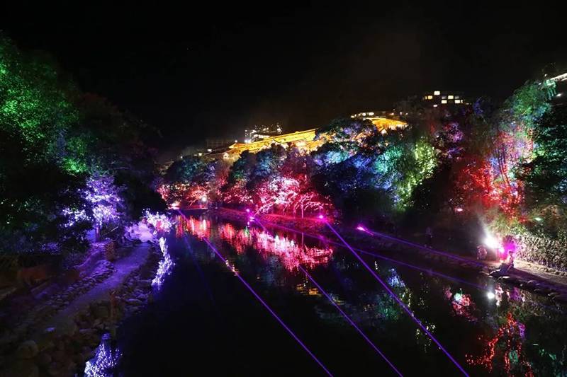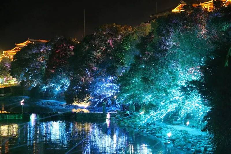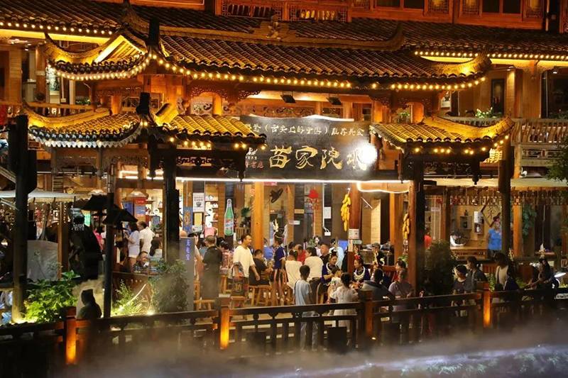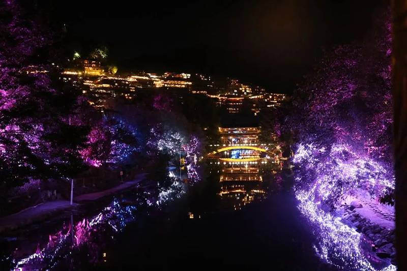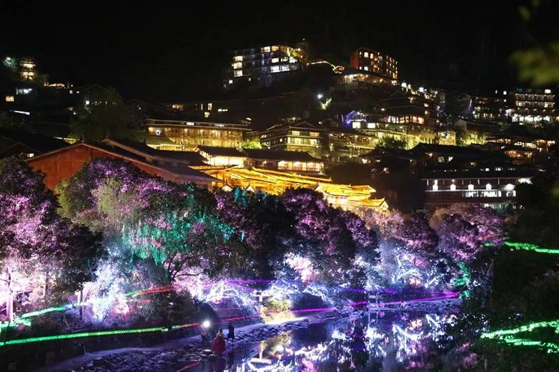 苗寨夜间灯光秀,巧妙运用蓝、白、黄、绿、紫等各色灯光,结合各条道路、景区、建筑特点,针对行道、河道等不同功能定位,使用投光灯、挂树灯、造型灯、灯光秀等各类照明设施突显不同特色,打造沉浸式、交互式、可持续的夜经济品牌。