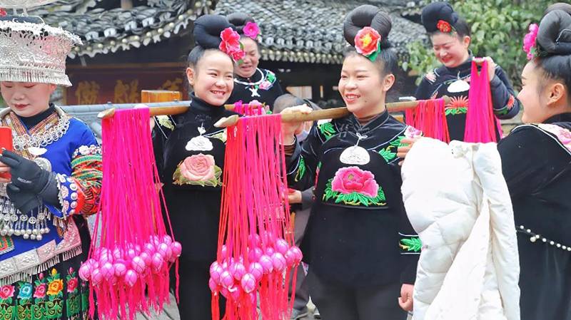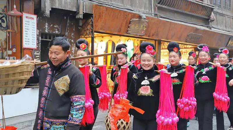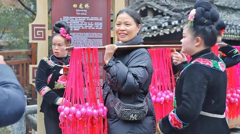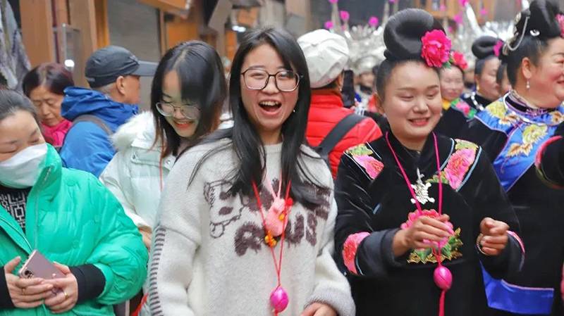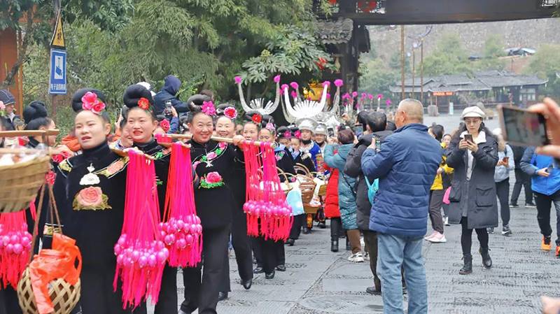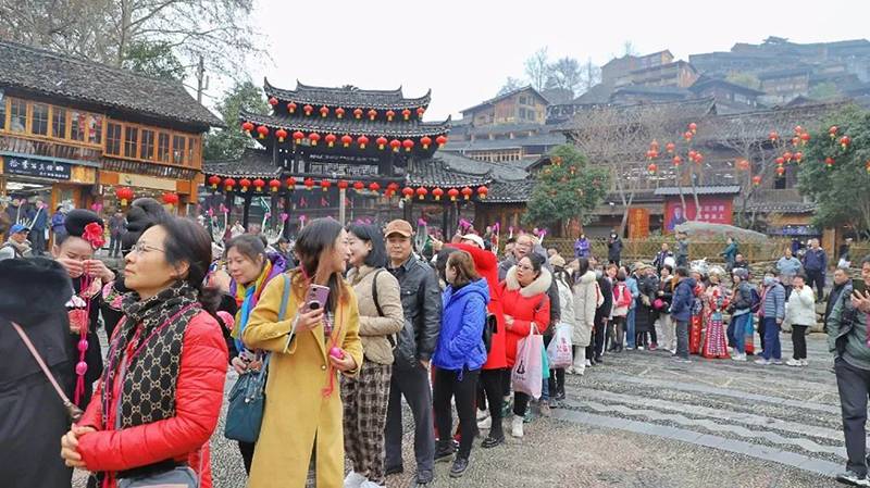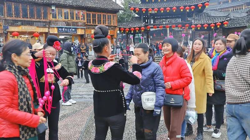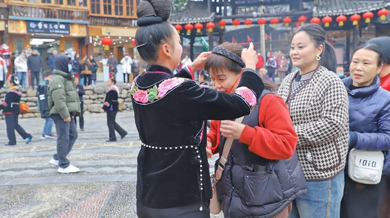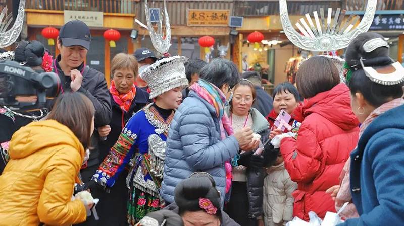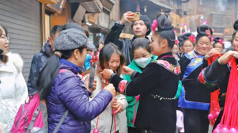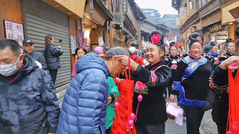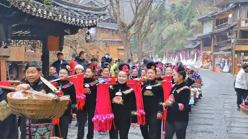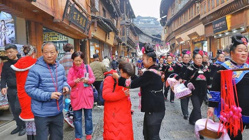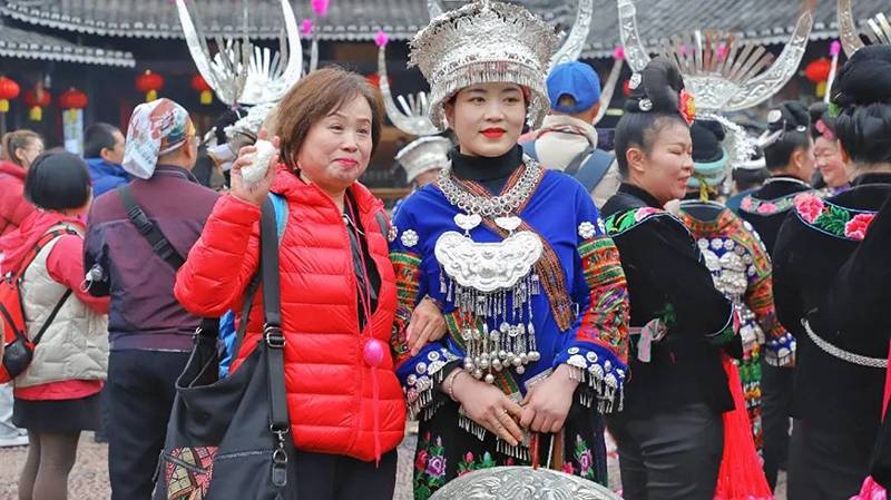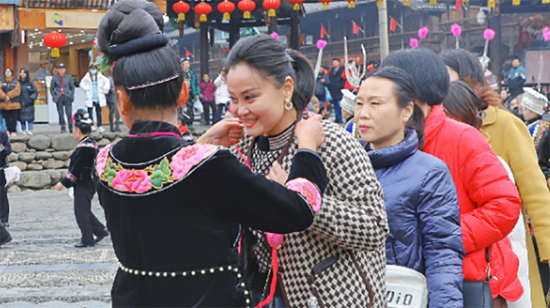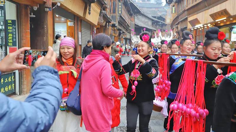 为传承中华优秀传统文化和民族民间文化,促进文化旅游融合发展,推动大文化大旅游,2023年2月21日(农历二月初二),西江千户苗寨景区开展“走进西江家园·体验祭桥文化”民俗文化主题活动。活动现场,村民们身着节日盛装,吹芦笙、挂彩蛋、挑糯米饭,吸引广大游客的围观点赞并参与。