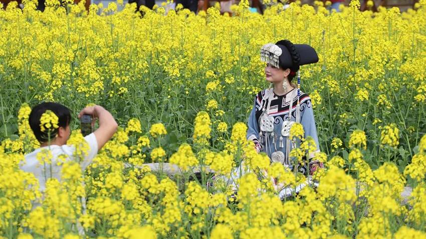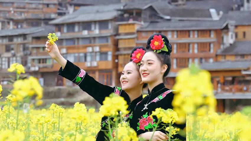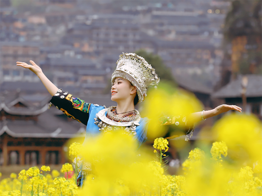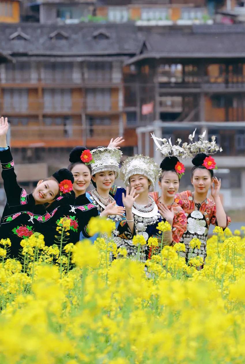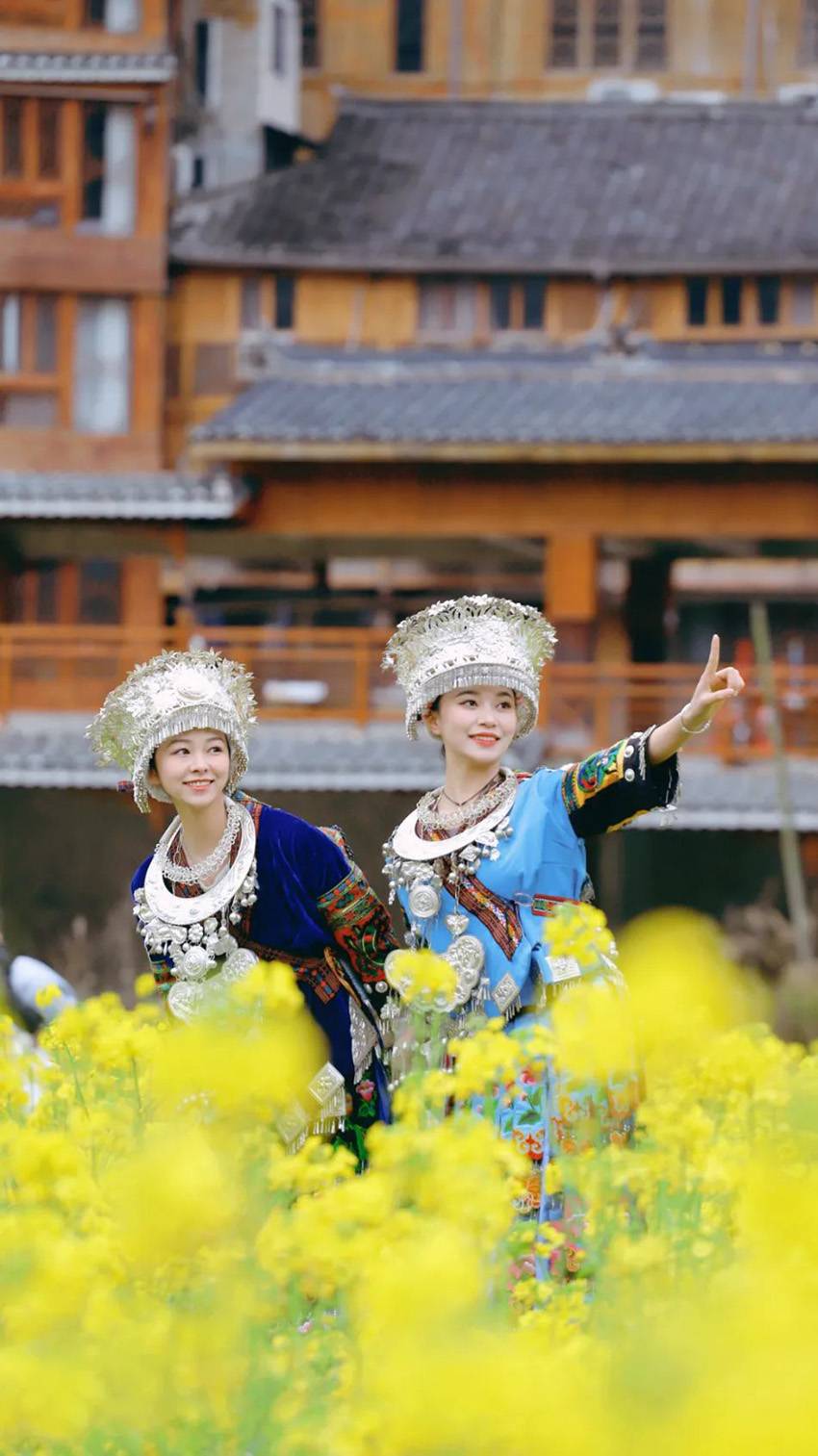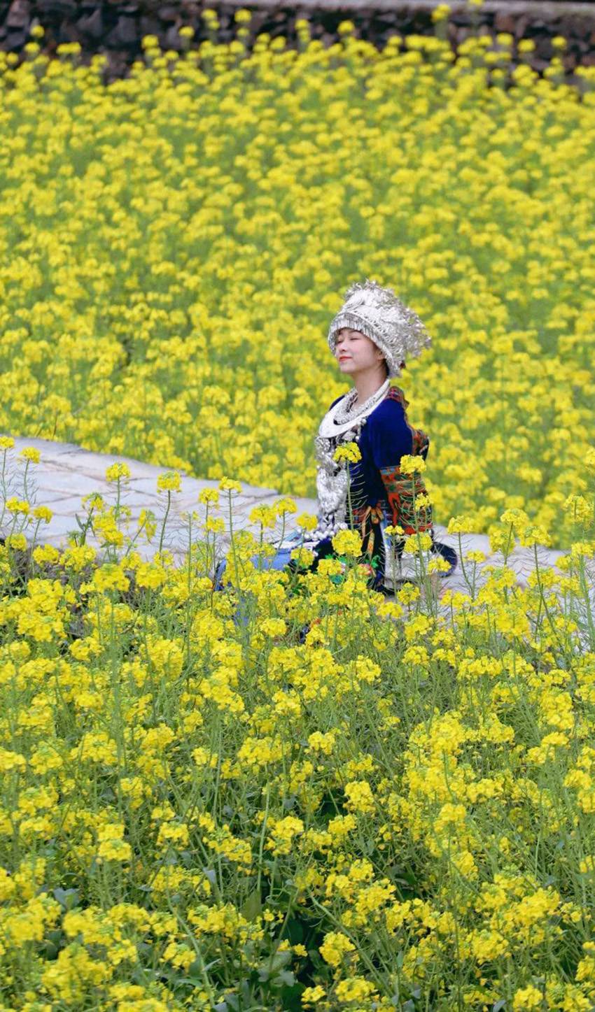 西江千户苗寨:“颜值”爆表!油菜花开春意浓,苗家姑娘入画中