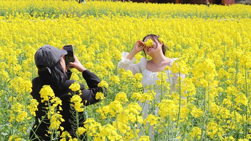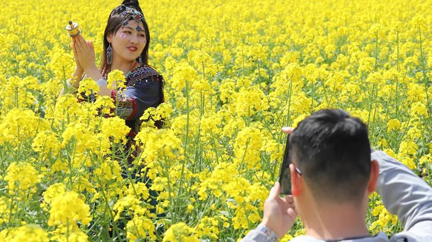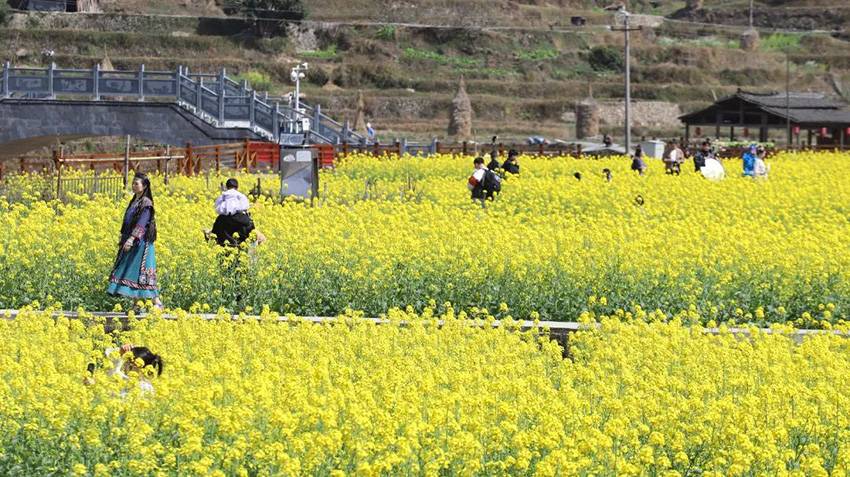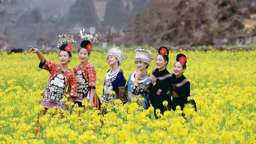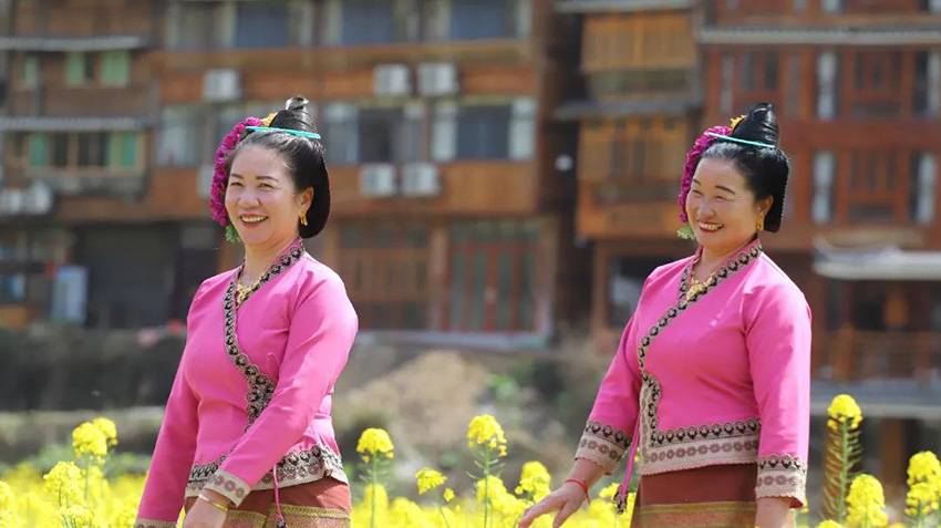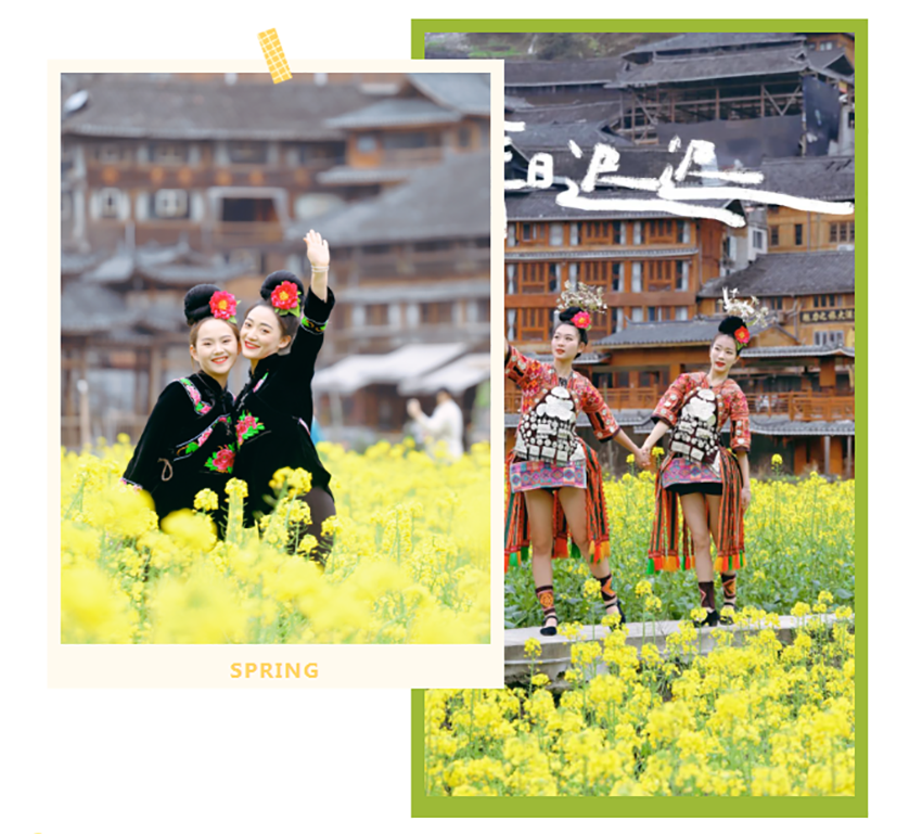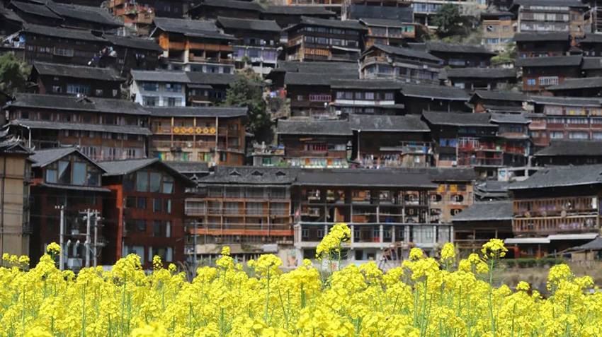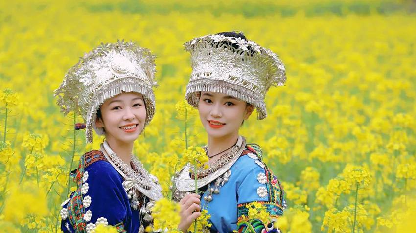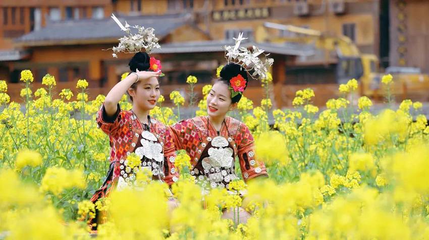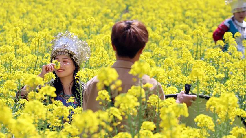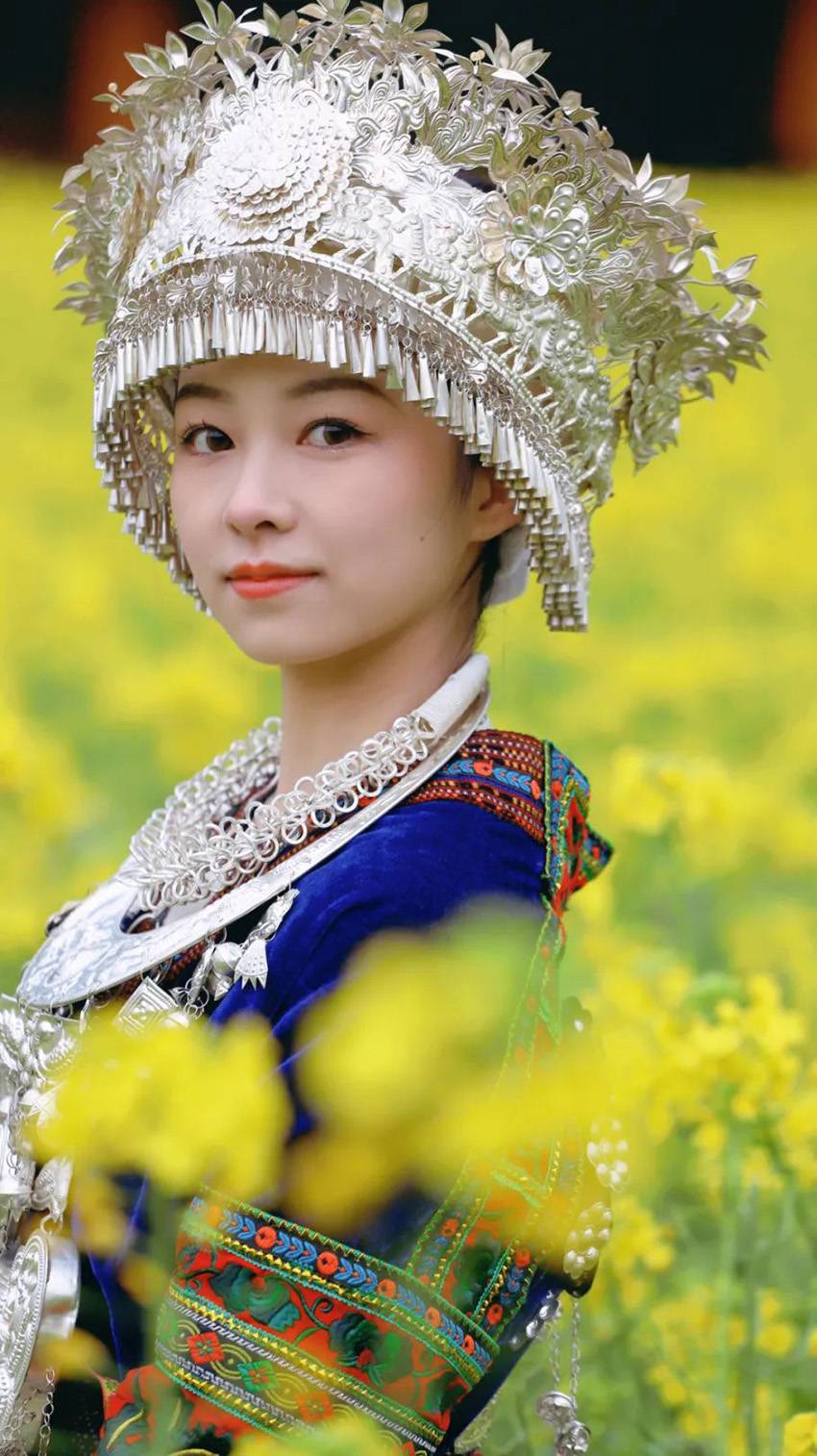 西江千户苗寨:“颜值”爆表!油菜花开春意浓,苗家姑娘入画中