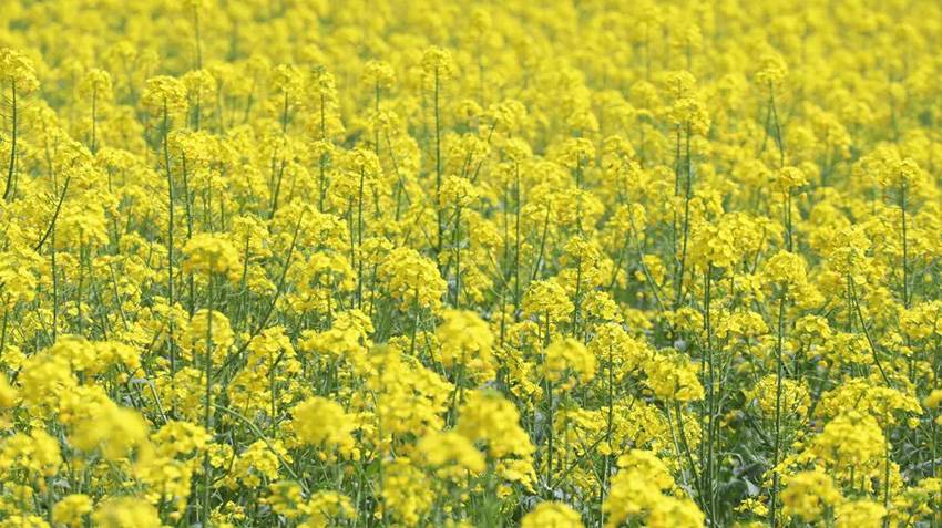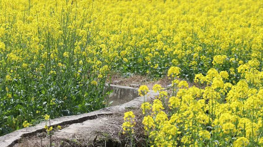 麦苗堆绿菜花黄,一簇人家古道傍。春风吹拂,苗寨的油菜花也随之层层起伏,在风中摇曳起舞,蔚然成海。