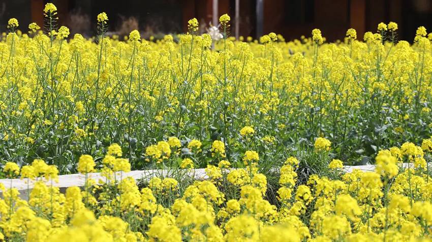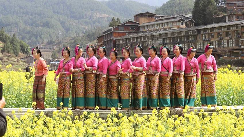 冬去犹存千岭绿,春来又是万坡黄。一片片金灿灿的油菜花田与错落有致的苗家吊脚楼建筑交相辉映,形成了一幅美不胜收的天然画卷。几位充满韵味的苗族姑娘们言笑晏晏,信步于油菜花绽放的小径上,裙摆摇曳,她们沉浸于春天的诗情画意之中,殊不知自己也是一道靓丽的风景。