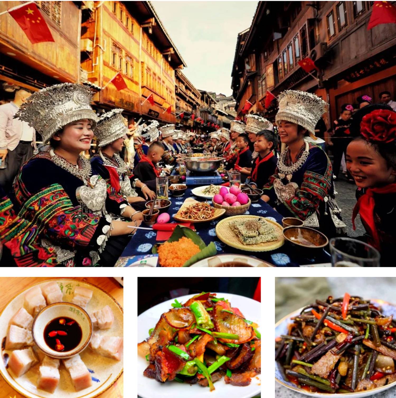 长桌宴是最为隆重的苗族宴席,号称为“千年不散的宴席”。独具特色的苗家酸汤鱼、鼓藏肉、腊肉香肠及各种农户家的绿色蔬菜小炒,配以悠扬的芦笙曲、敬酒歌,再喝上碗里醇香的米酒,这才真正的感受到苗族平日的生活。