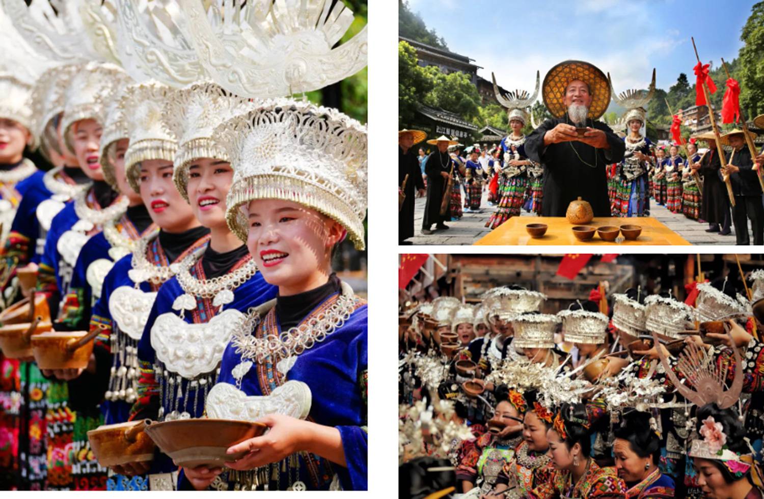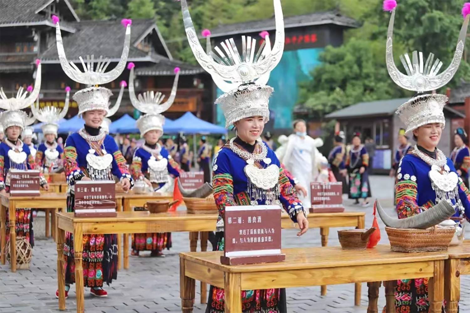 来过西江的人都知道,“十二道拦门酒”和“高山流水酒”是必不可少的两个环节,也是苗族人迎宾待客的最高礼仪,以此迎接远方尊贵的客人,表达苗家人最真诚的敬意。