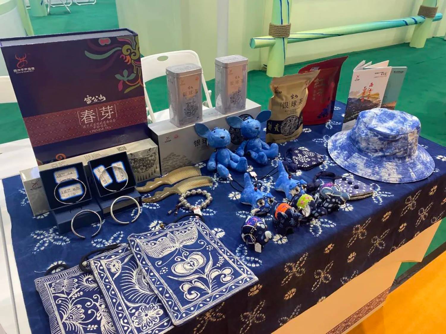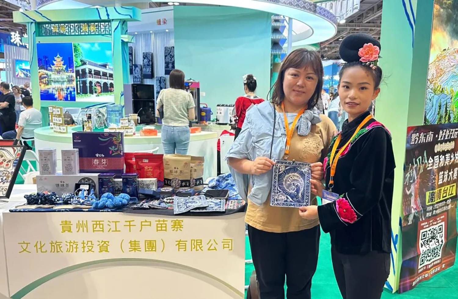 在旅博会现场,西江千户苗寨展区通过发放宣传册、展示银饰、苗绣、茶叶、蜡染文创品等独具特色的贵州旅游商品和旅游产品的方式,向参观展览的观众们介绍了西江千户苗寨的丰富的自然资源,独特民族文化,精美的苗族工艺等。