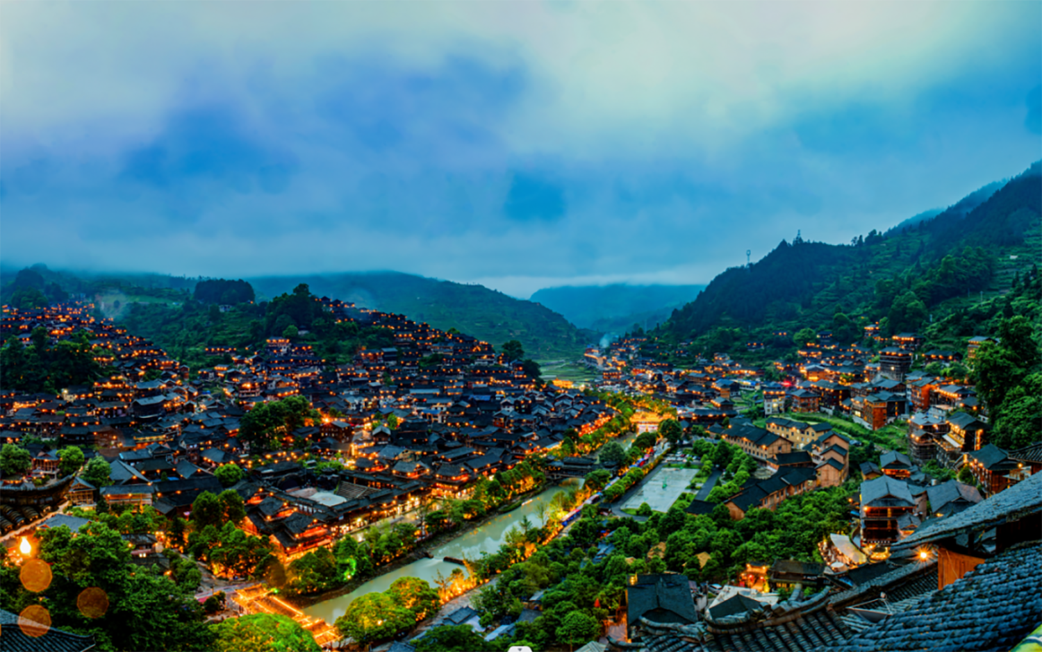 夜晚的苗寨繁星点点、灯火辉煌