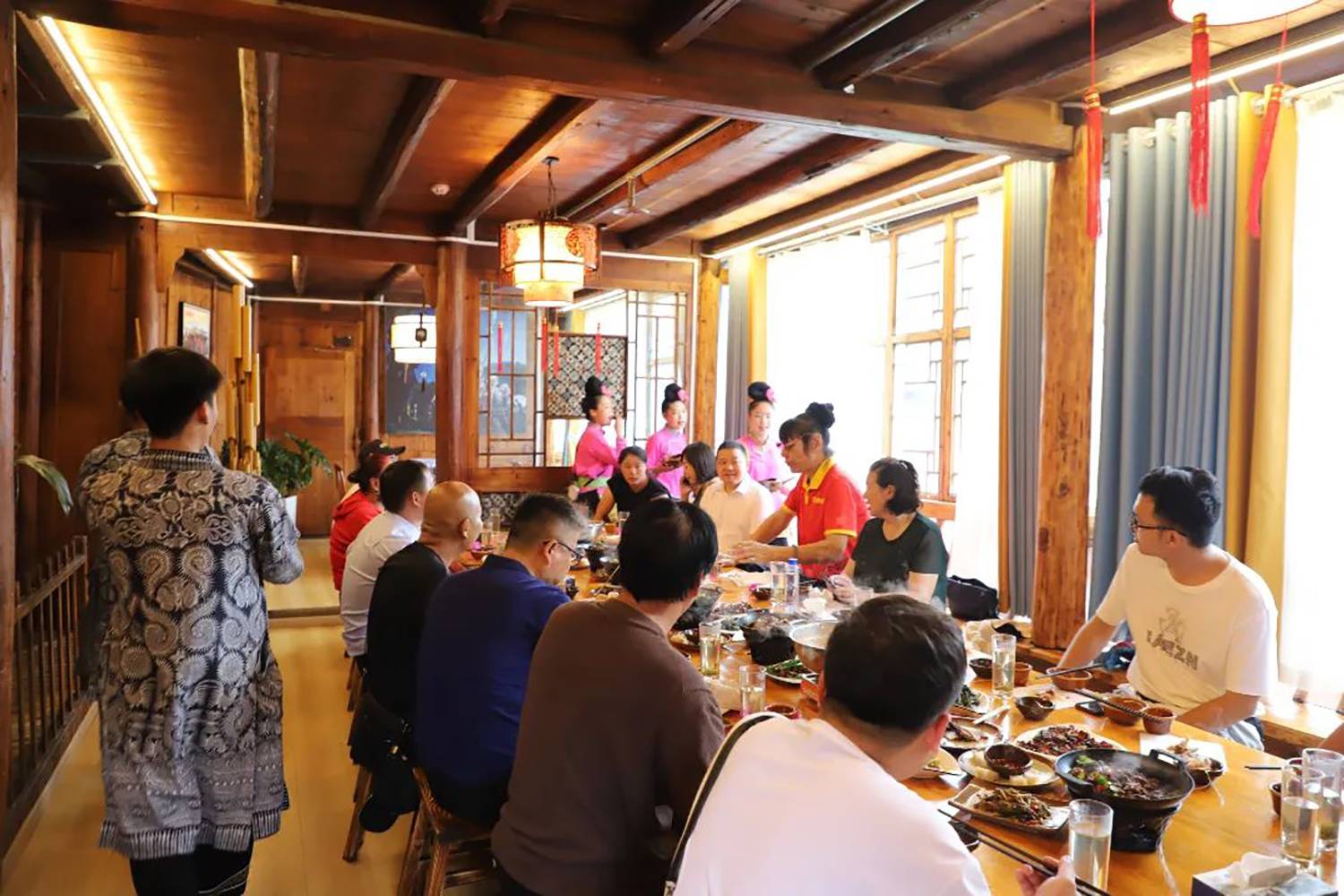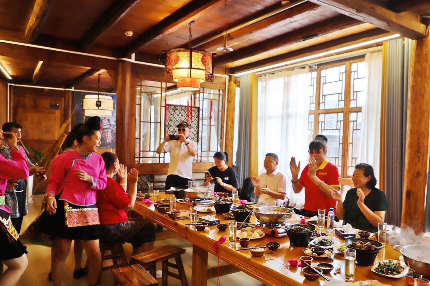 随后,郑海霞老师一行体验了具有传统特色的苗家长桌宴。“你喜欢也要喝,不喜欢也要喝,管你喜欢不喜欢都要喝……”在苗族小伙悠扬的芦笙伴奏下,几位苗族姑娘拿着酒具酒碗款款走来,为郑海霞老师一行献上似流水般动听的敬酒歌和香甜的苗家米酒,在欢快的氛围里众人也情不自禁鼓起掌来,将气氛推向新的高潮。