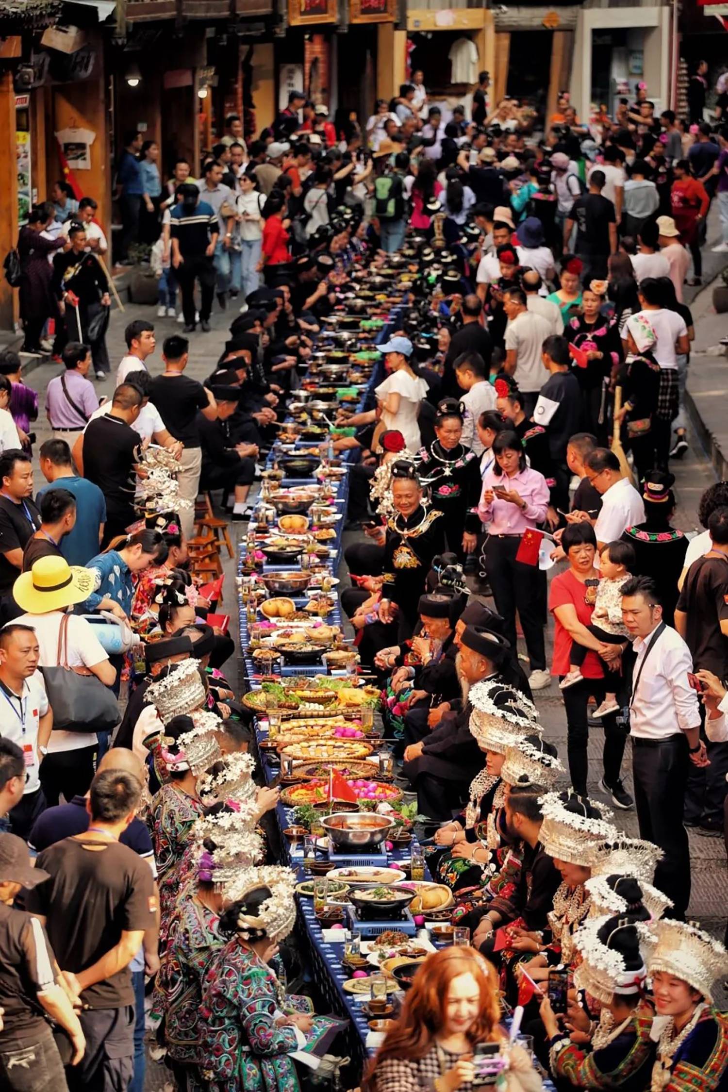 长桌宴号称为“千年不散的宴席”具有浓厚的气氛与苗寨风俗特色,包括苗家酸汤鱼、鼓藏肉等美味食物,再喝上醇香的米酒,在微醺中感受“舌尖上的苗味”。