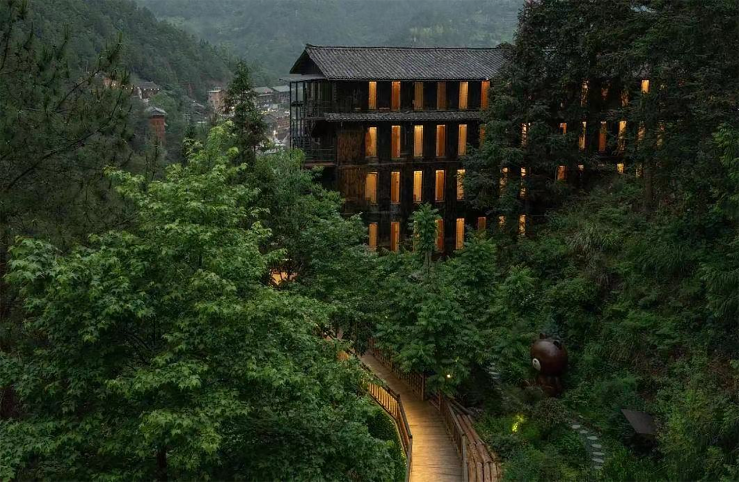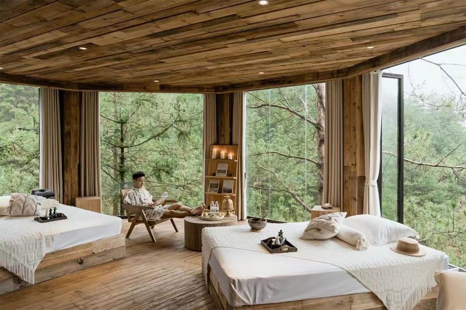 三春里·季酒店房间配有茶室、浴缸、花园、阳台、帐篷等特色体验板块,满足不同心境、身份的游客的个性度假享受。采用苗寨传统木质吊脚楼建筑工艺,携手国内民宿行业设计大师精心打造,将充满生机的绿植融入原木色的建筑空间中,带来不可多得的精致美学度假氛围。