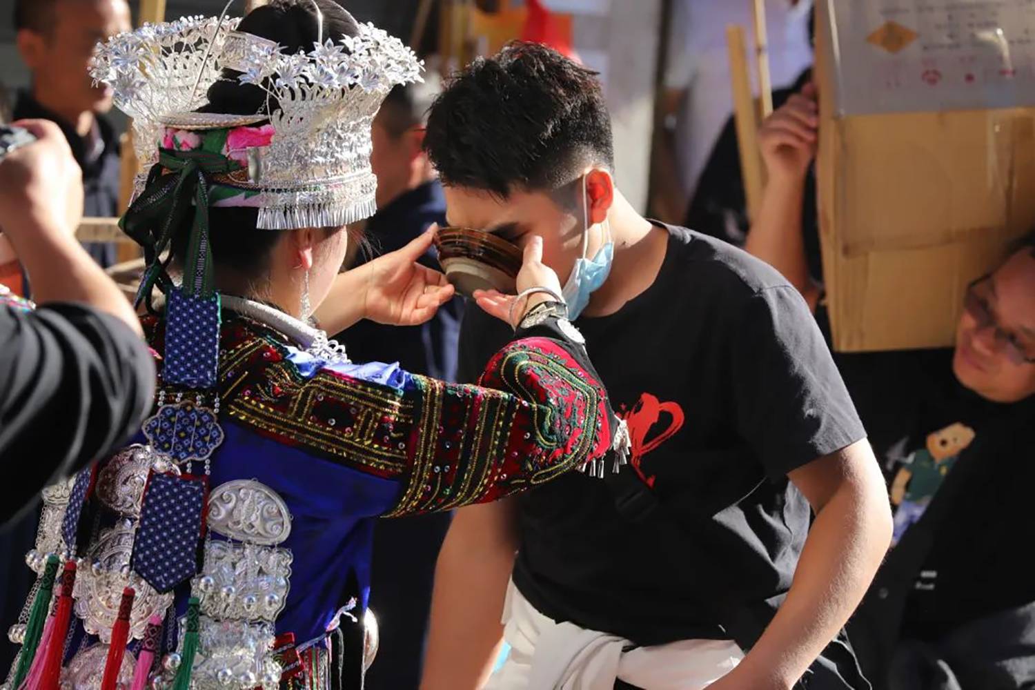 “十二道拦门酒”是雷公山地区苗族迎宾待客的最高礼仪。在苗族传统文化中,“十二”是一个大数,十二道拦门酒既表达了对远方来客的美好祝愿,也表达了苗族千百年来形成了传统价值观。鼓藏节前一日是迎客日,苗家儿女一大早便穿起盛装、拿出芦笙、在进寨路口摆起十二道拦门酒,喜迎八方来客。