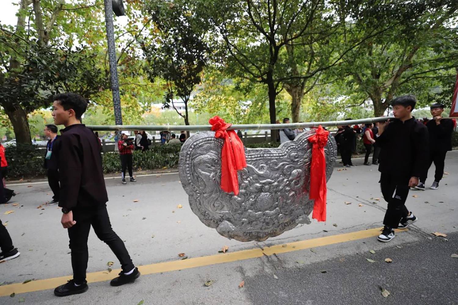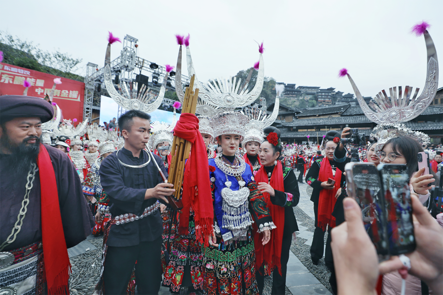 苗族银饰盛装展示大巡游,巡游队伍随着芦笙的节奏,跳起欢快的舞姿,现场气氛热烈。苗族银饰素以用料讲究 ,构图精巧,造型典雅,色彩艳丽,淳朴自然,技艺精湛而著称。在苗族古歌中:就有“运金运银,打住撑天,铸造日月”的说法。苗族服饰被誉为“无字史书”和穿在身上的“史书”,靠世代口传身授,将流传千年的故事融进服饰文化当中,一针一线绣进衣冠服饰,世代"穿"承,永不忘怀。