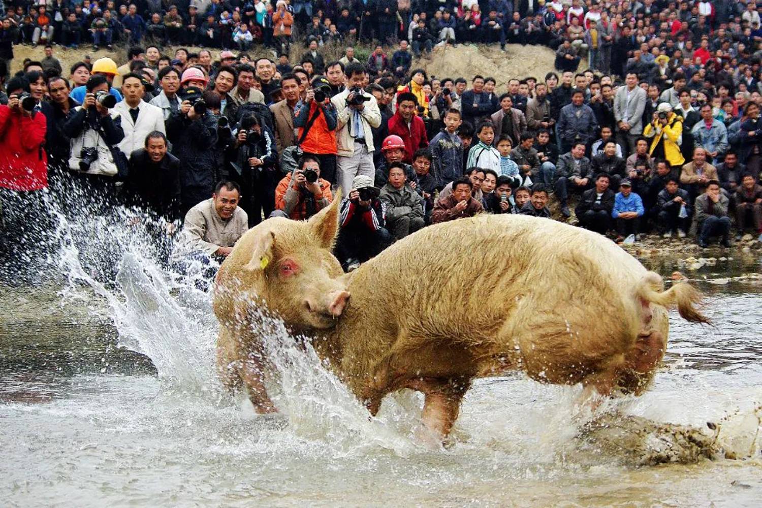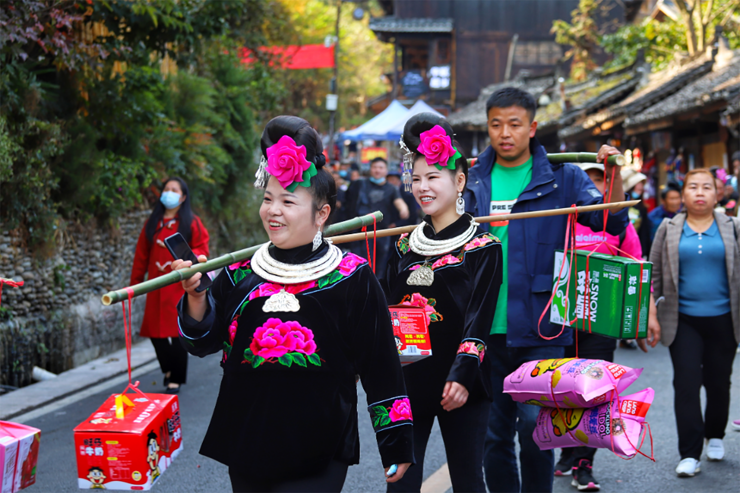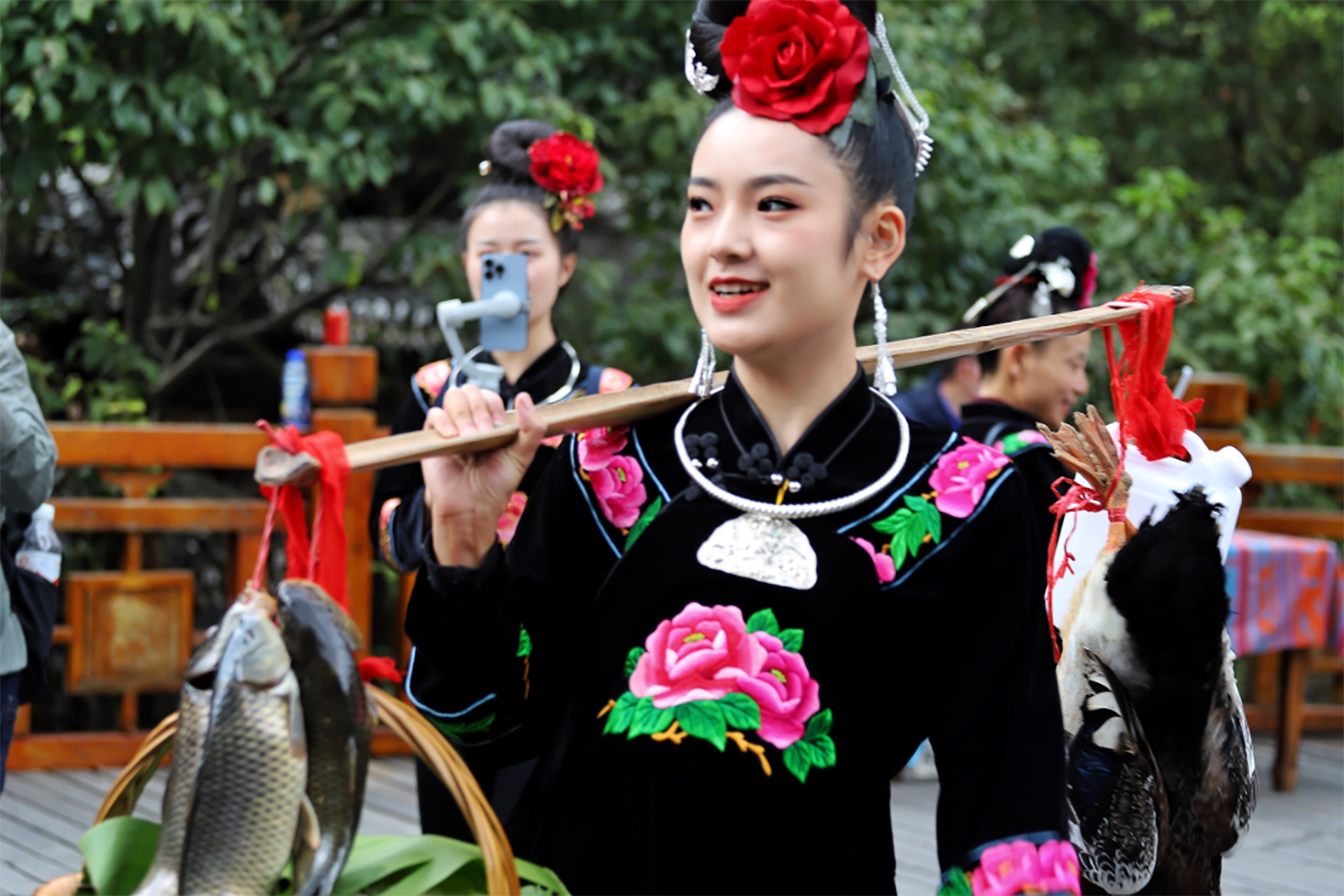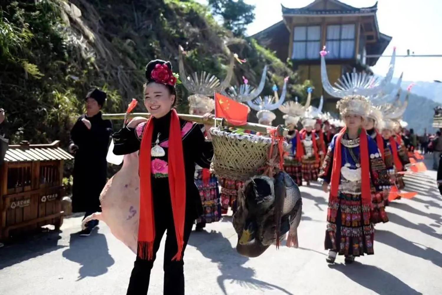 图为 苗族鼓藏节·进客礼节与抬猪腿习俗