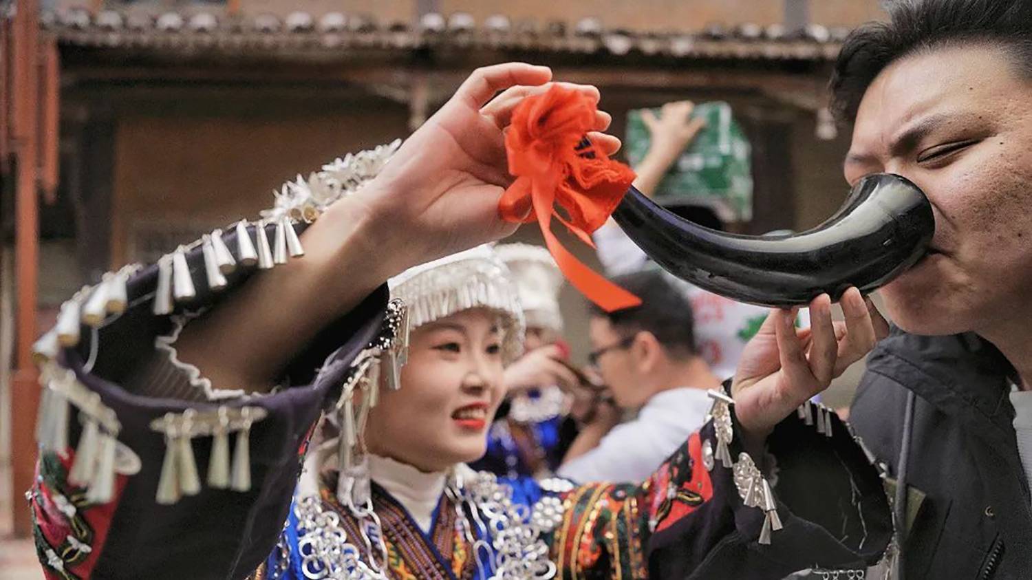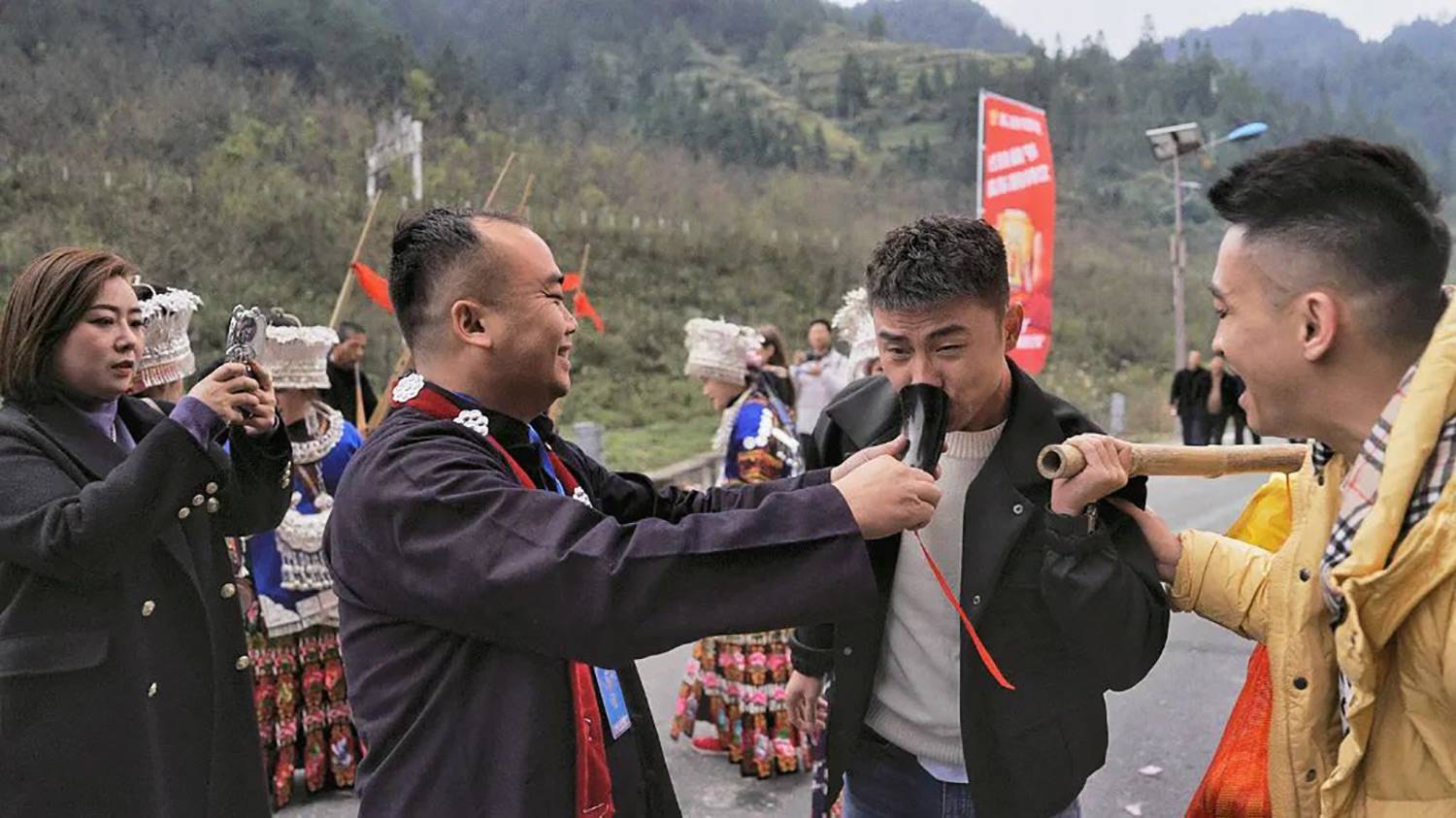 十二道拦门酒的每道都有丰富的文化内涵,既表达了对客人的美好祝愿,也表达了苗族千百年的传统价值观。鼓藏节进客日,苗家姑娘们唱着婉转动听的敬酒歌,端起桌上的牛角杯,为远道而来的客人献上香气扑鼻的自家酿米酒。拦门酒,表达了苗家人的心诚,像酒一样浓烈,像酒一样清纯。对于拦门酒,客人喝的越多,苗家人心里越是高兴!