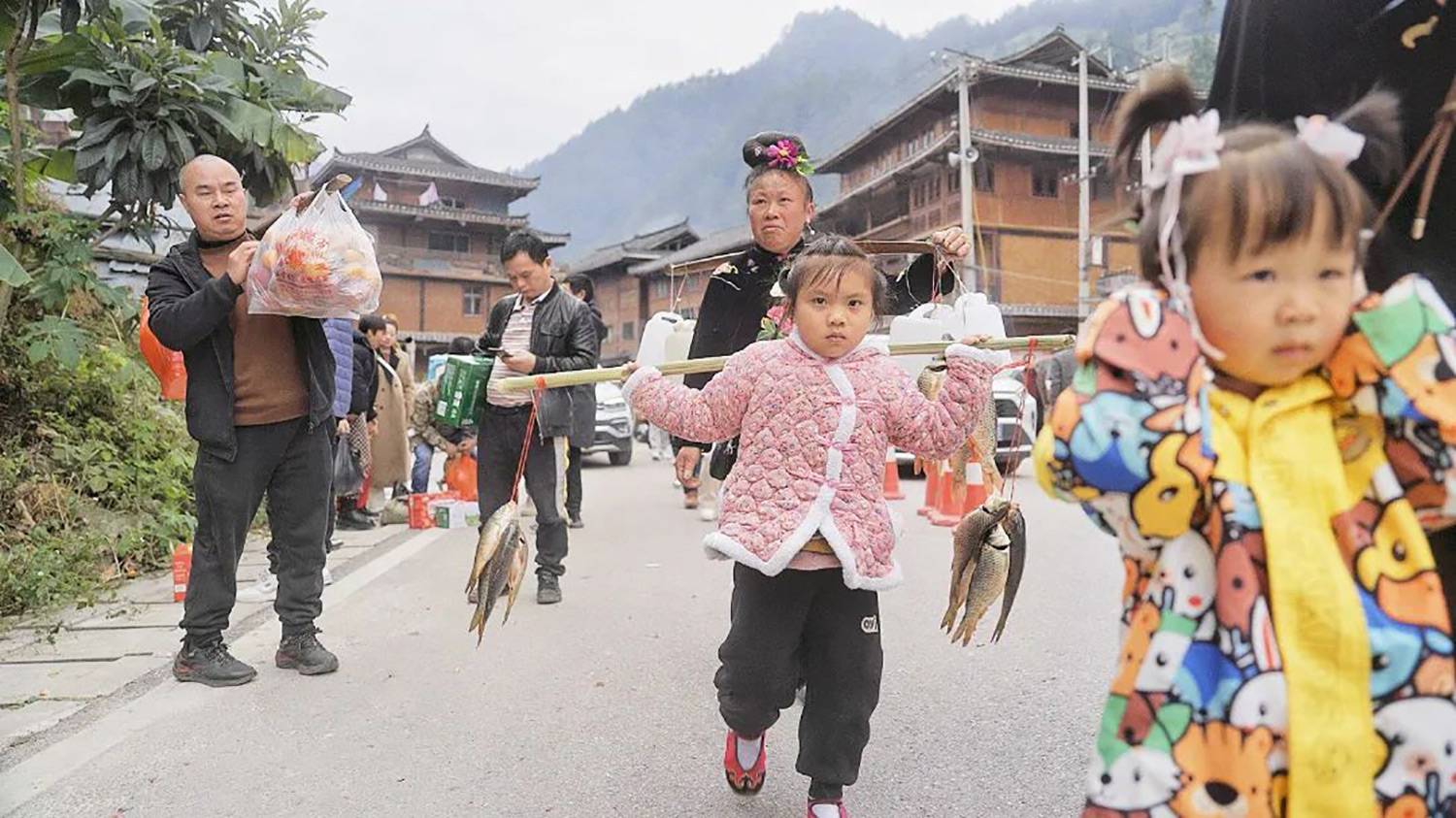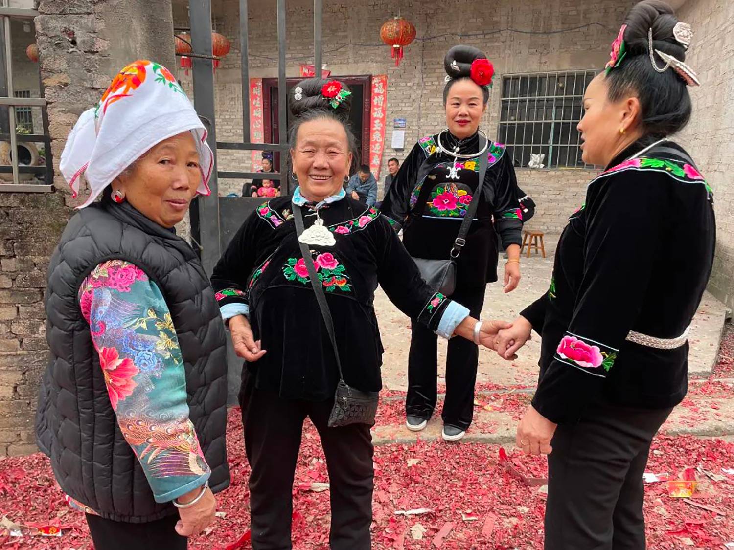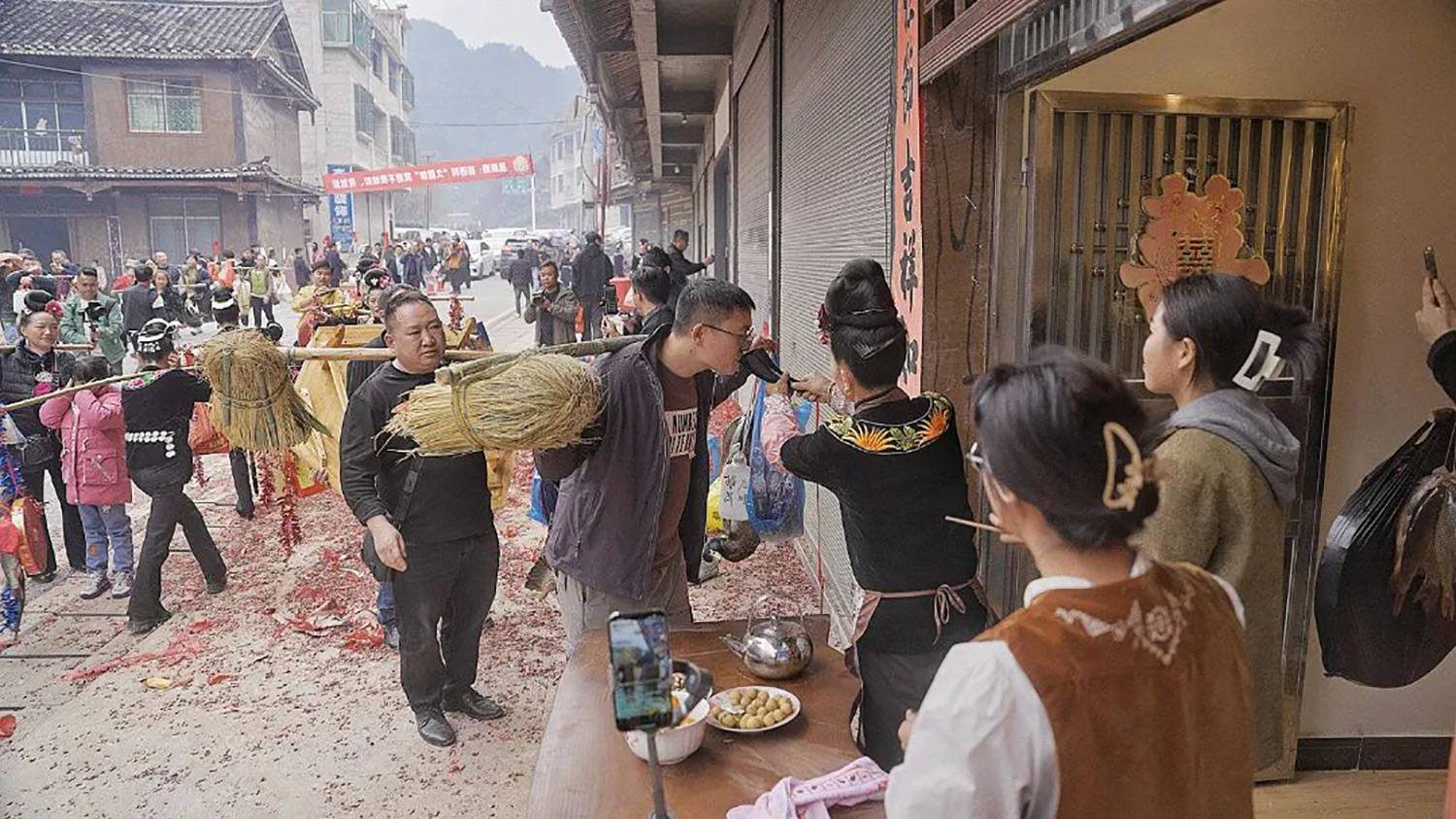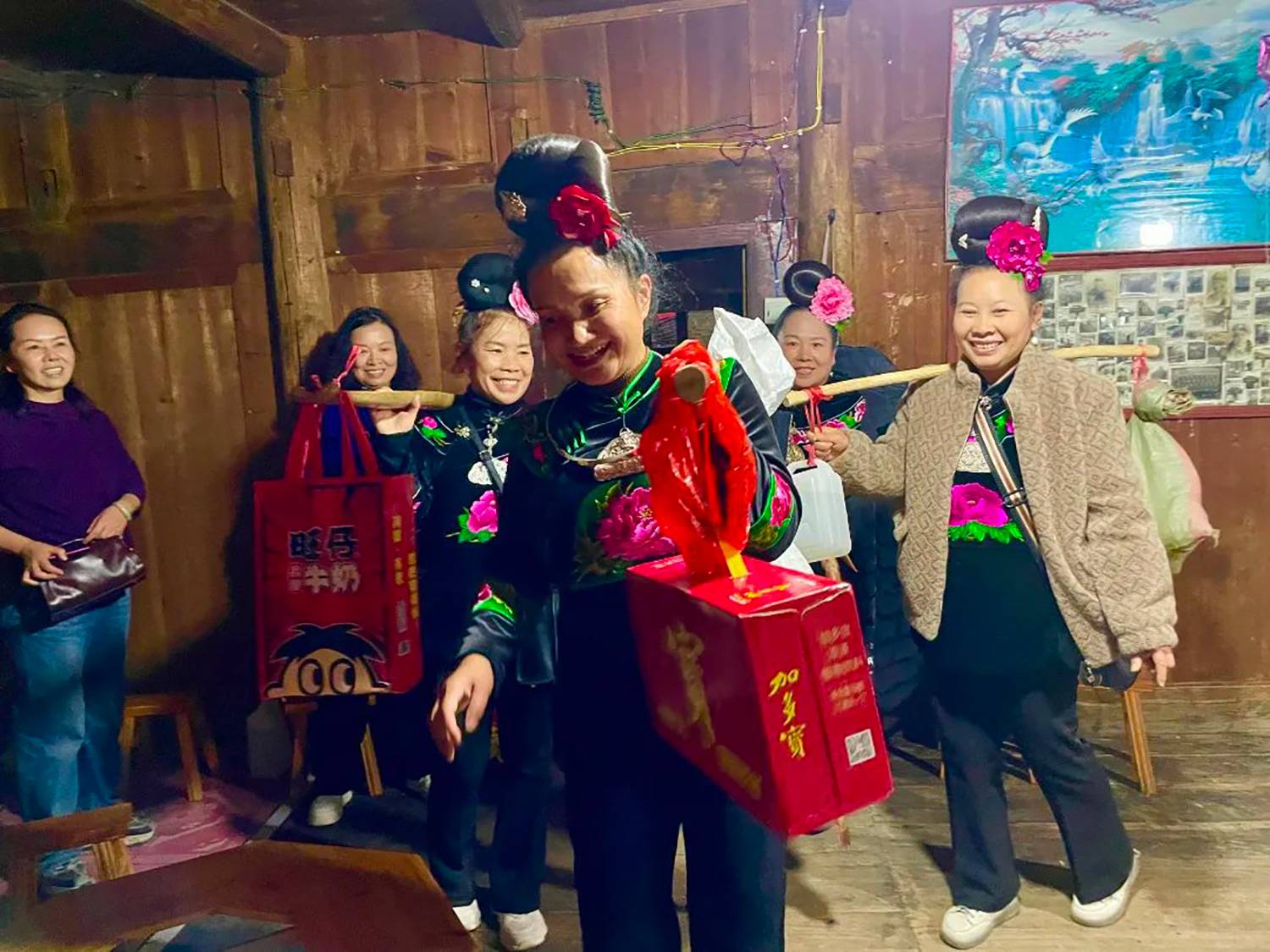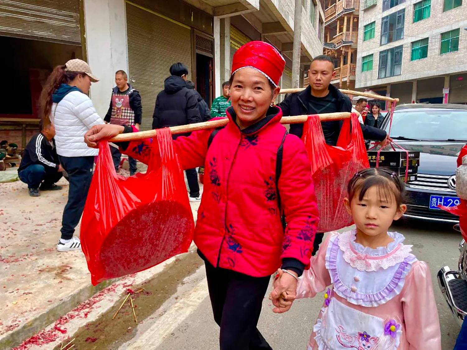 随着天色渐暗,主人家与前来做客的亲朋好友相聚一堂,共同享用苗家特色美食。过节期间,苗寨里欢声笑语不断,人人脸上满是掩饰不住的激动和兴奋。