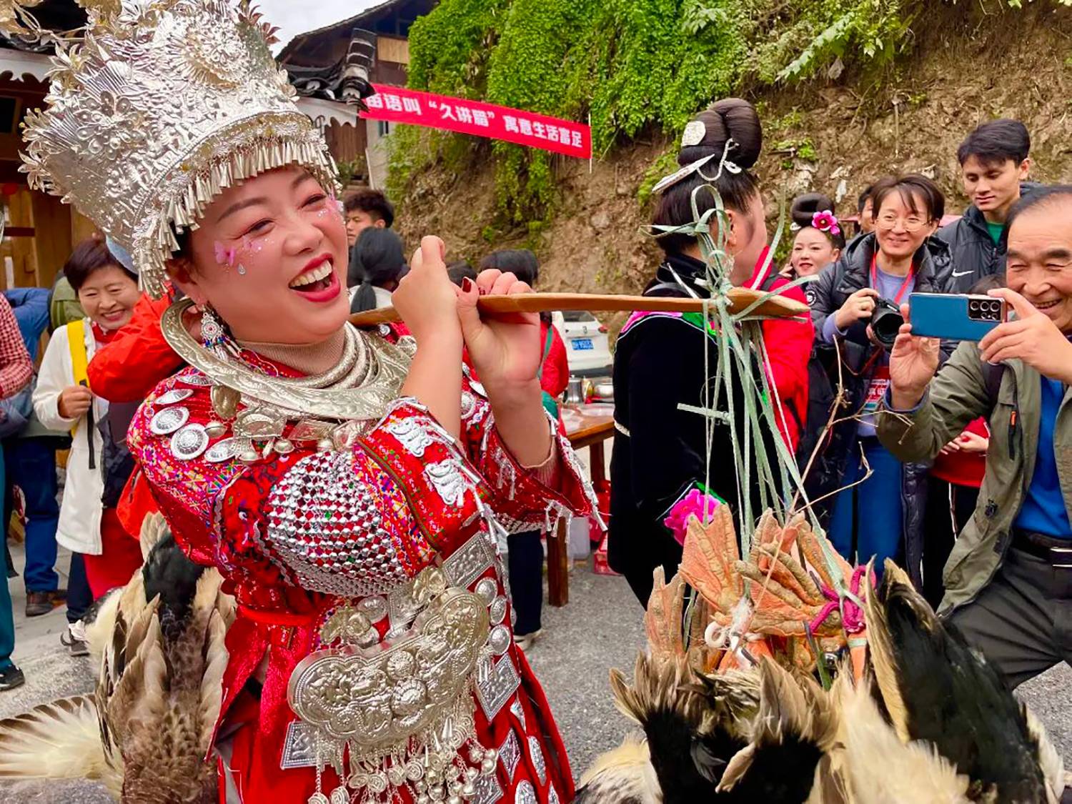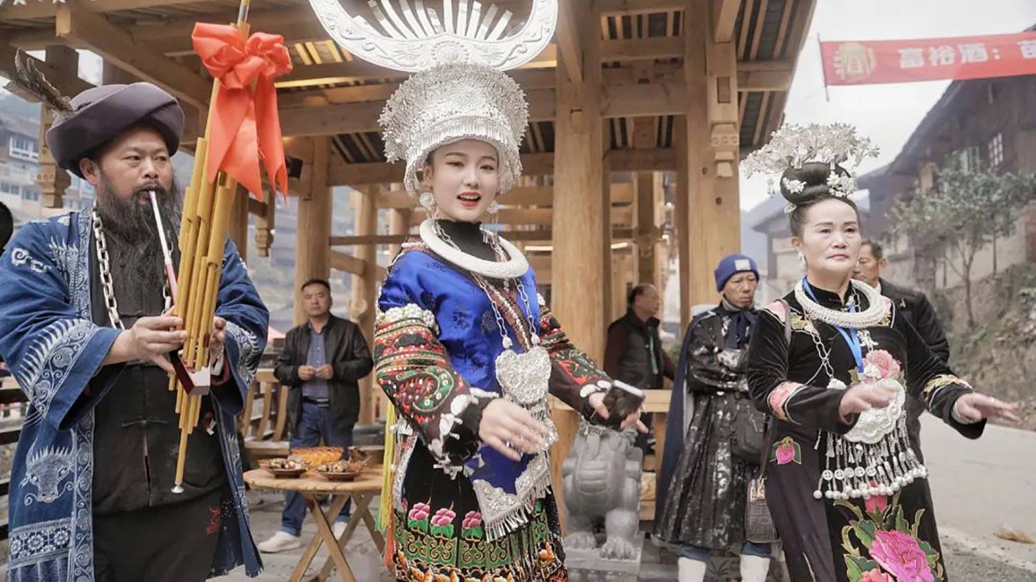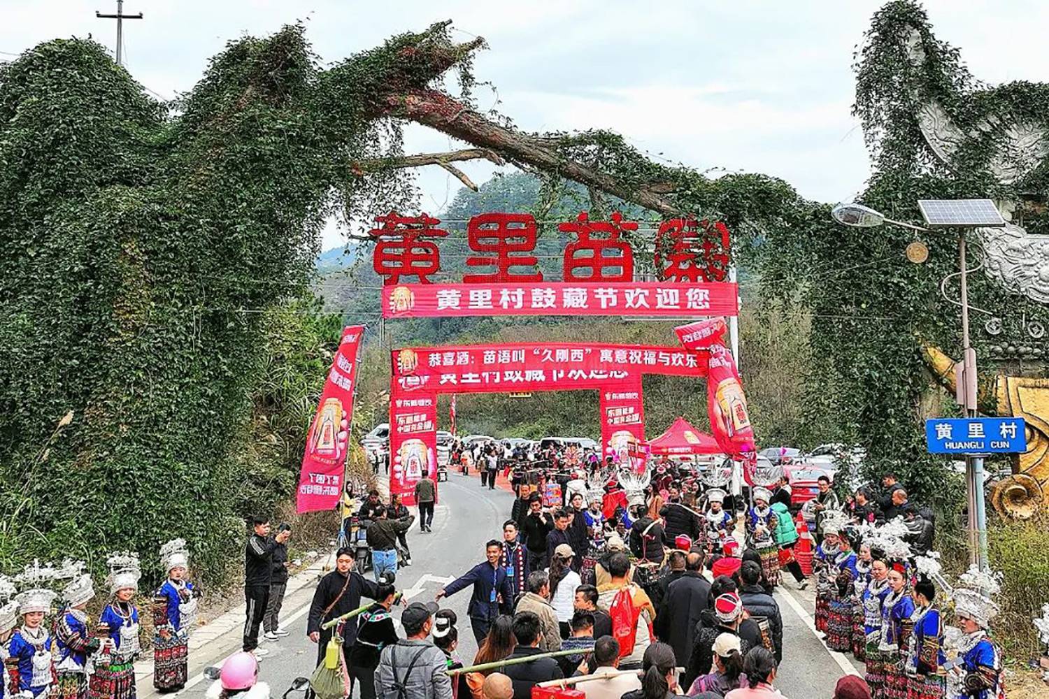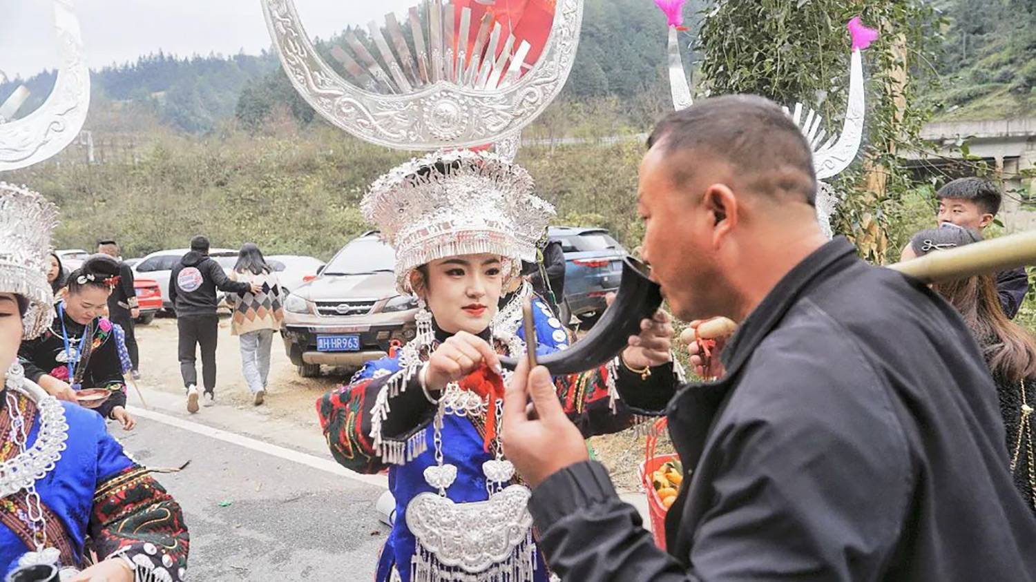 11月18日,西江镇黄里片区各苗寨的进寨路口集结了手持芦笙的苗族小伙们和身着盛装、精心装扮的苗家姑娘们,他们摆上十二道拦门酒,喜迎八方来客。灵秀的苗家姑娘与淳朴的苗家小伙热情洋溢,芦笙曲调悠扬,传递着绵绵不断的情谊,姑娘们舞动时身上精美的银饰随之碰撞出高高低低、层层叠叠的细碎声响,袅袅不绝。