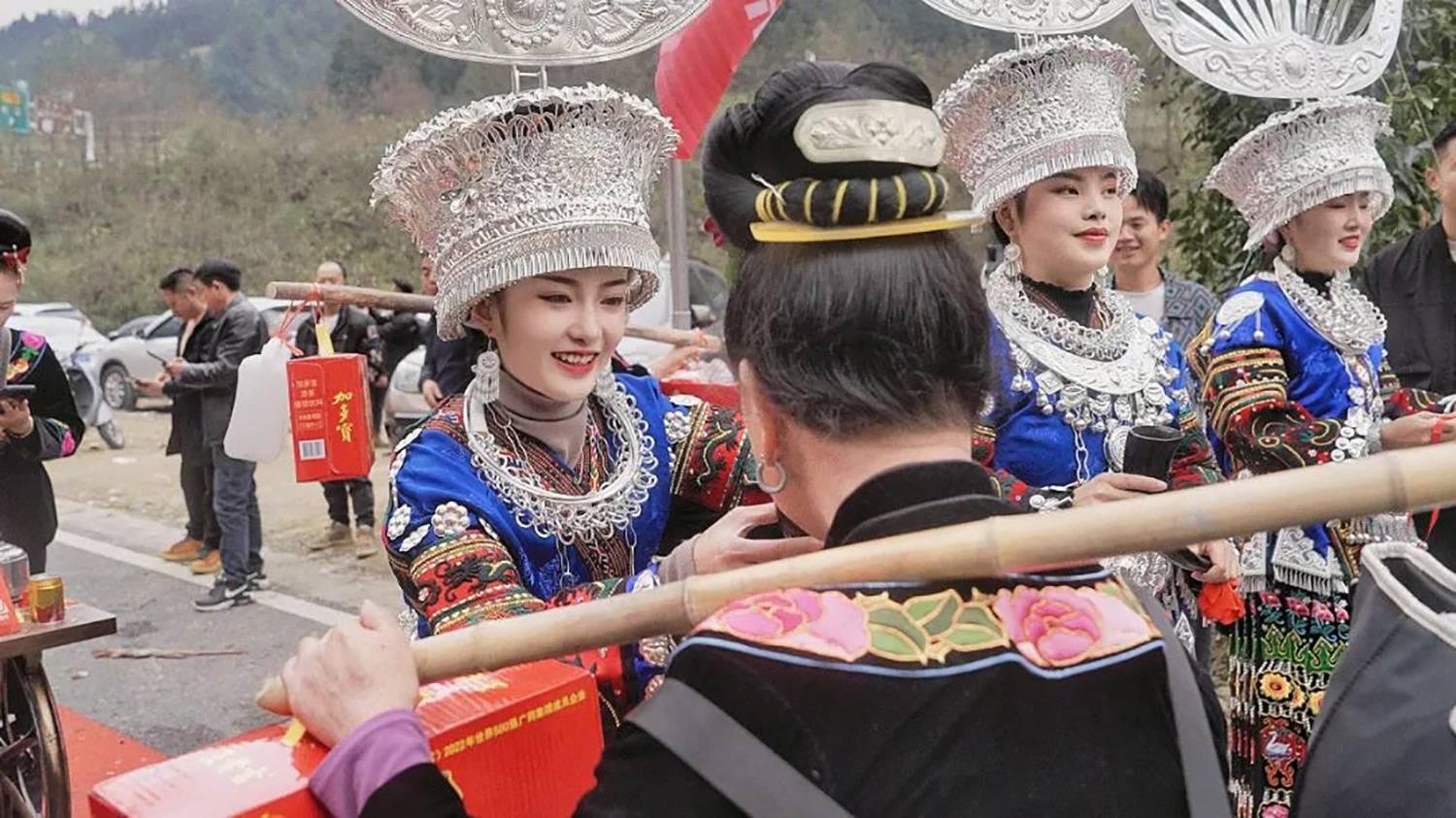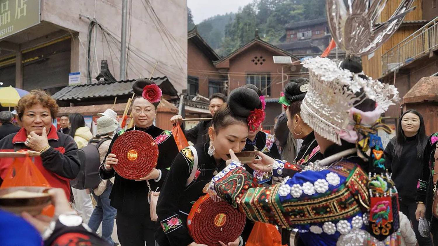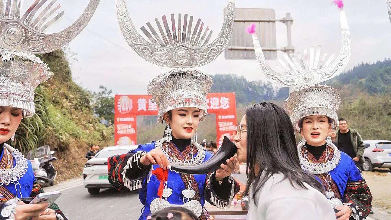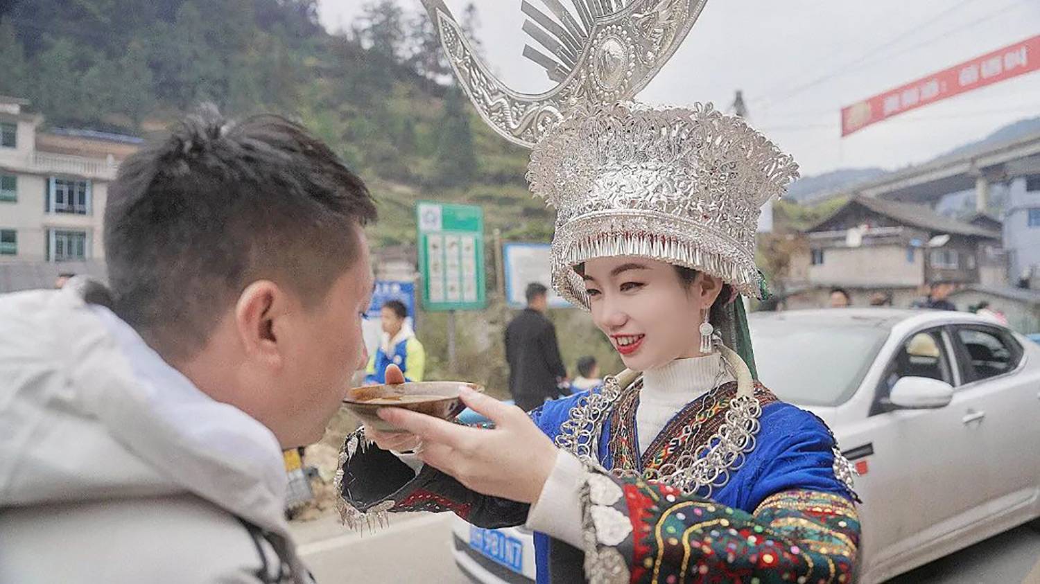 11月18日,西江镇黄里片区各苗寨的进寨路口集结了手持芦笙的苗族小伙们和身着盛装、精心装扮的苗家姑娘们,他们摆上十二道拦门酒,喜迎八方来客。灵秀的苗家姑娘与淳朴的苗家小伙热情洋溢,芦笙曲调悠扬,传递着绵绵不断的情谊,姑娘们舞动时身上精美的银饰随之碰撞出高高低低、层层叠叠的细碎声响,袅袅不绝。