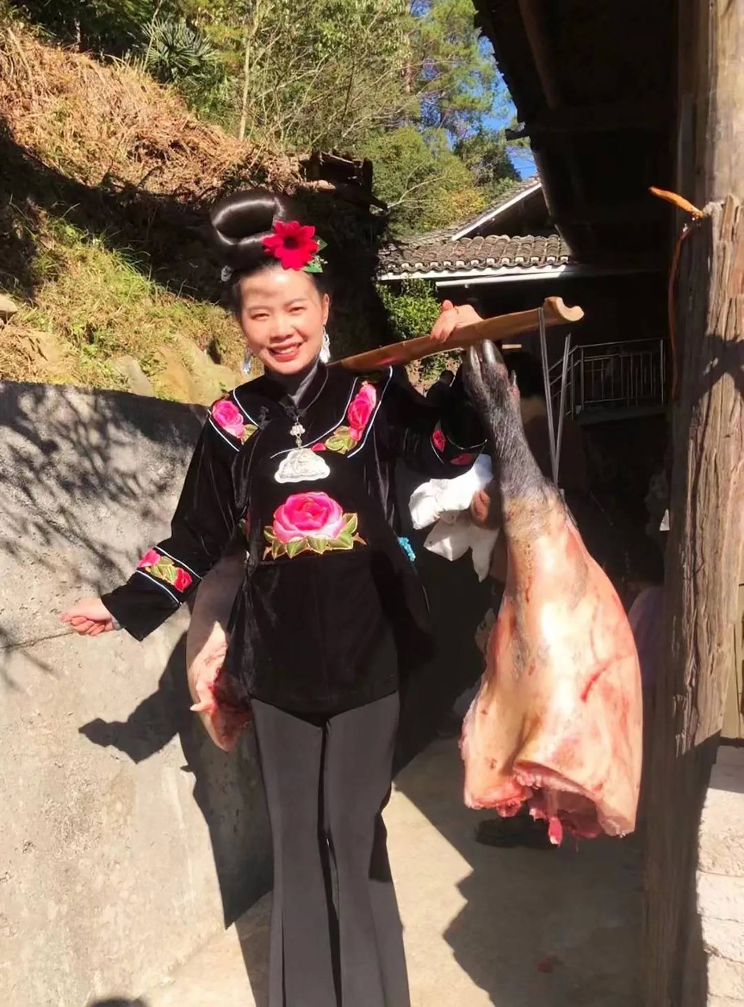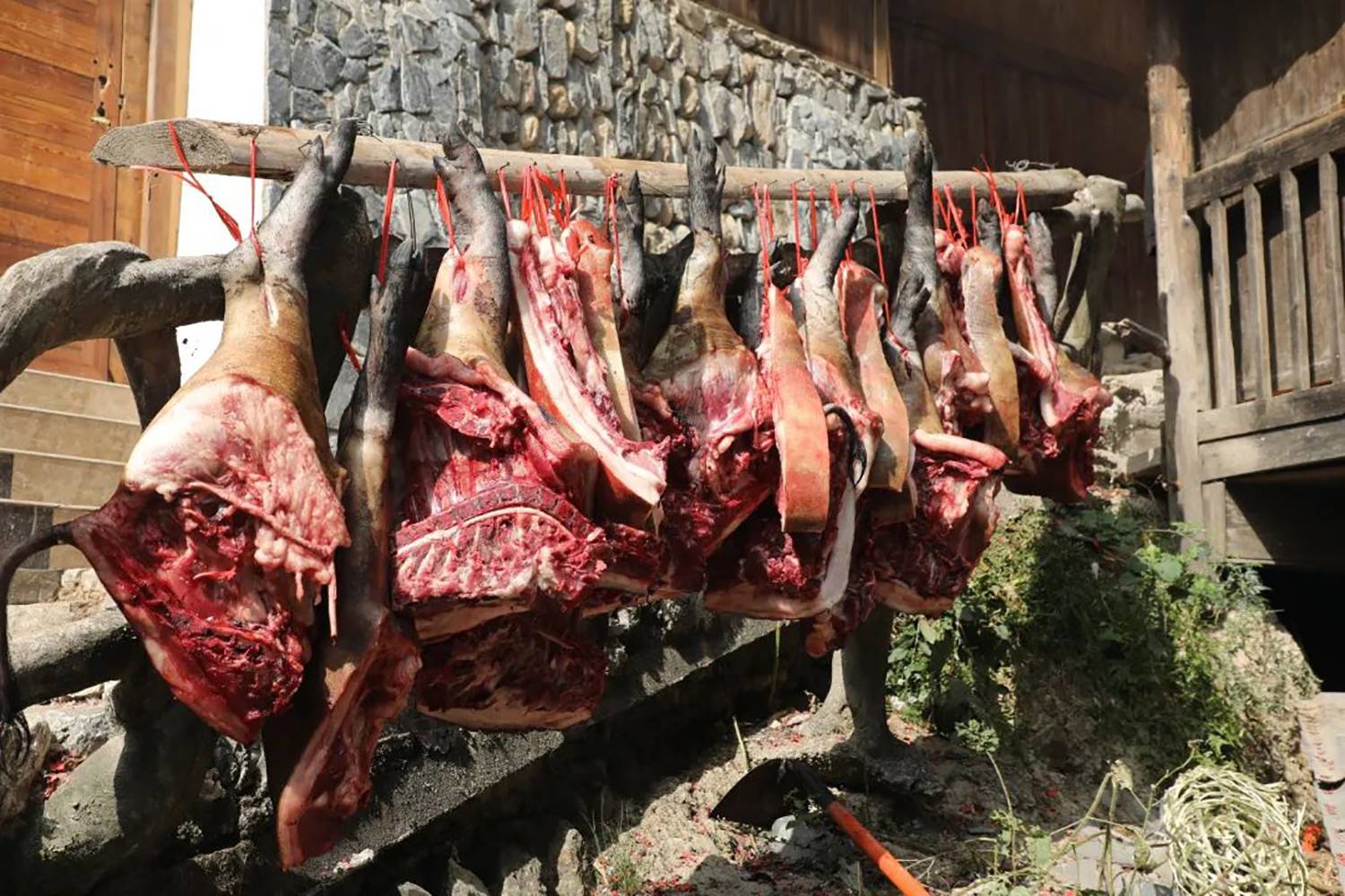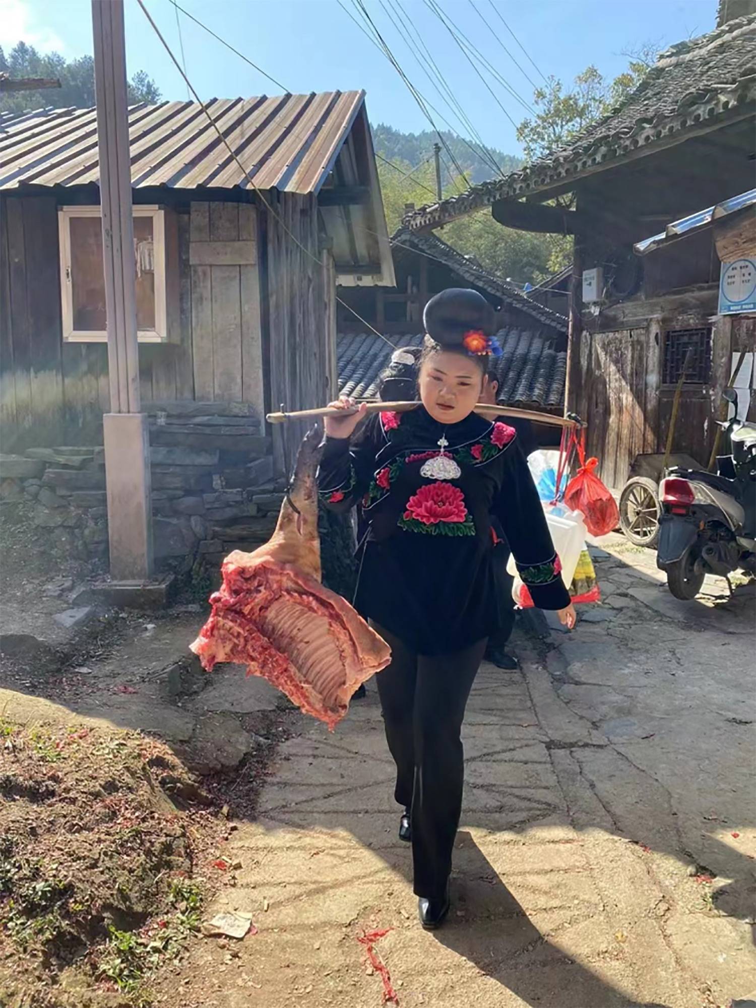 11月19日为西江镇黄里片区鼓藏节的送客日,这天主人家要送给客人回礼,而猪腿在这里则成为了凝聚亲戚情感的纽带,于是形成了鼓藏节“抬猪腿”的传统习俗。