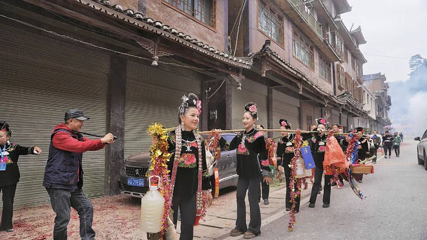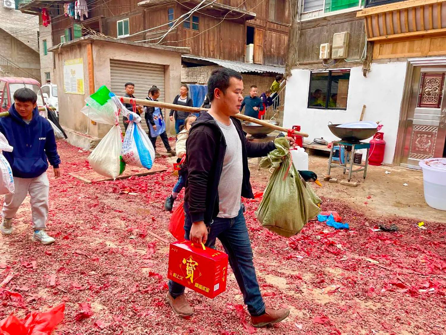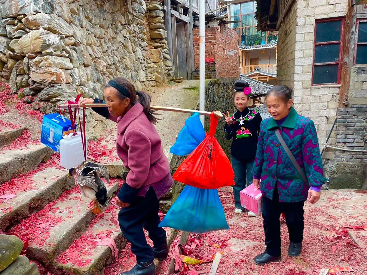 鼓藏节是亲朋好友相聚的好机会,在礼节上有一定讲究,也表示了客人对主人家的尊敬。亲友们挑着沉甸甸的礼物,穿行在苗寨小巷之中,待走到主人家门口时,会先放一饼鞭炮给主人家报信,燃放后的鞭炮铺下一层靓丽的“红毯”,主人家便来门口迎接客人,有的到了家门口还要喝上主人家准备的拦门酒方可进屋。