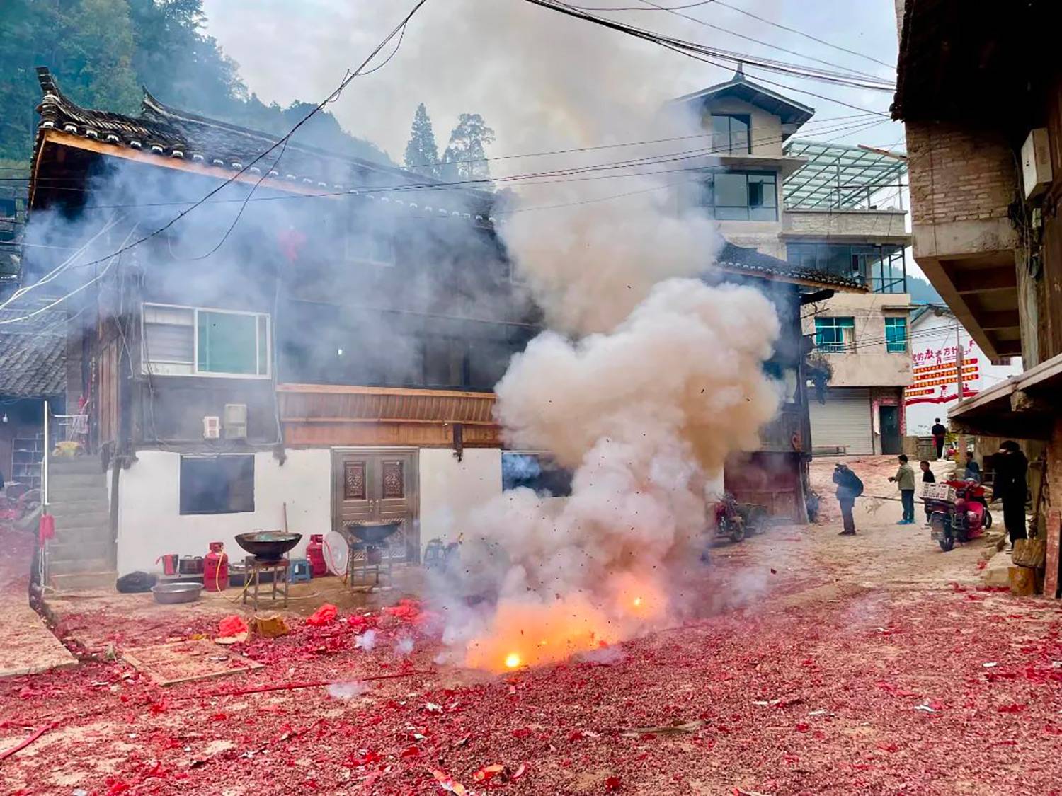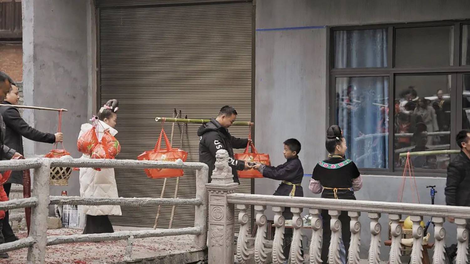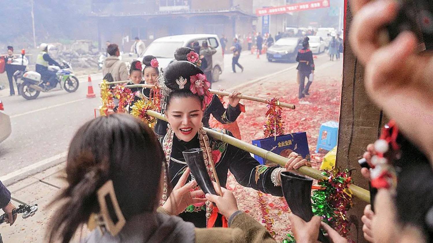 鼓藏节是亲朋好友相聚的好机会,在礼节上有一定讲究,也表示了客人对主人家的尊敬。亲友们挑着沉甸甸的礼物,穿行在苗寨小巷之中,待走到主人家门口时,会先放一饼鞭炮给主人家报信,燃放后的鞭炮铺下一层靓丽的“红毯”,主人家便来门口迎接客人,有的到了家门口还要喝上主人家准备的拦门酒方可进屋。