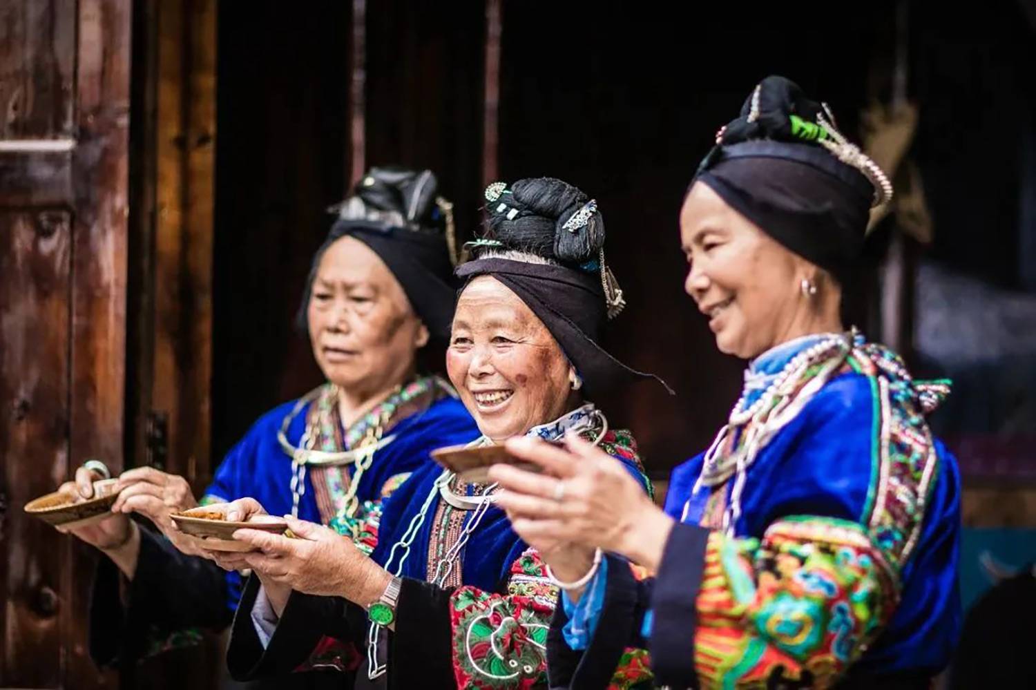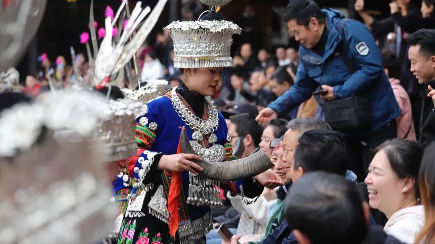 步入苗寨,十二道拦门酒展现了苗家人对待客人的真诚与热情,这种独特的饮酒仪式不仅是文化交流的方式,更是传承和传统的体现。西江千户苗寨有着丰富多彩的苗族民俗文化,体现了苗族人民对生活的热爱和追求,也展示了苗族独特的民族风情。苗族刺绣、银饰锻造、蜡染等非物质文化遗产技艺展示出苗族独特的审美观念和艺术魅力,你也可以在嘎歌古巷亲自体验传统技艺,感受苗族文化的传承与温暖。