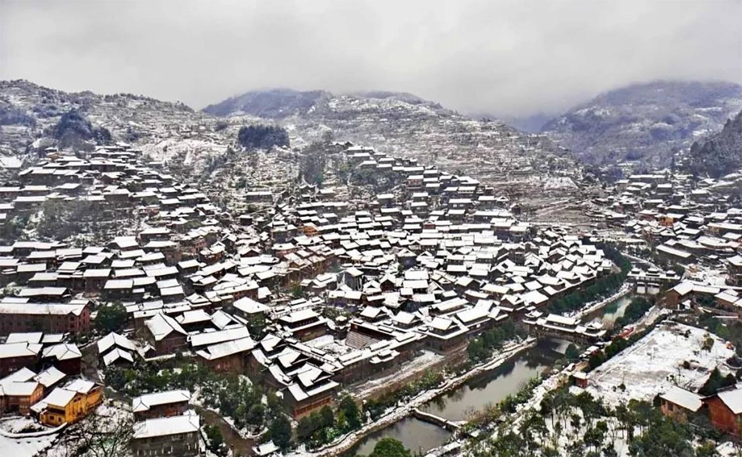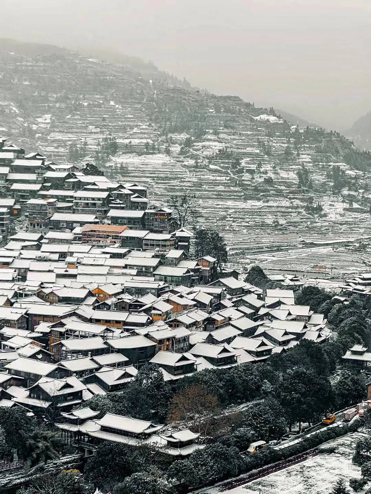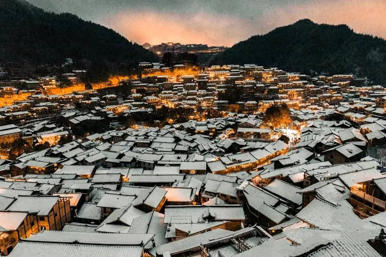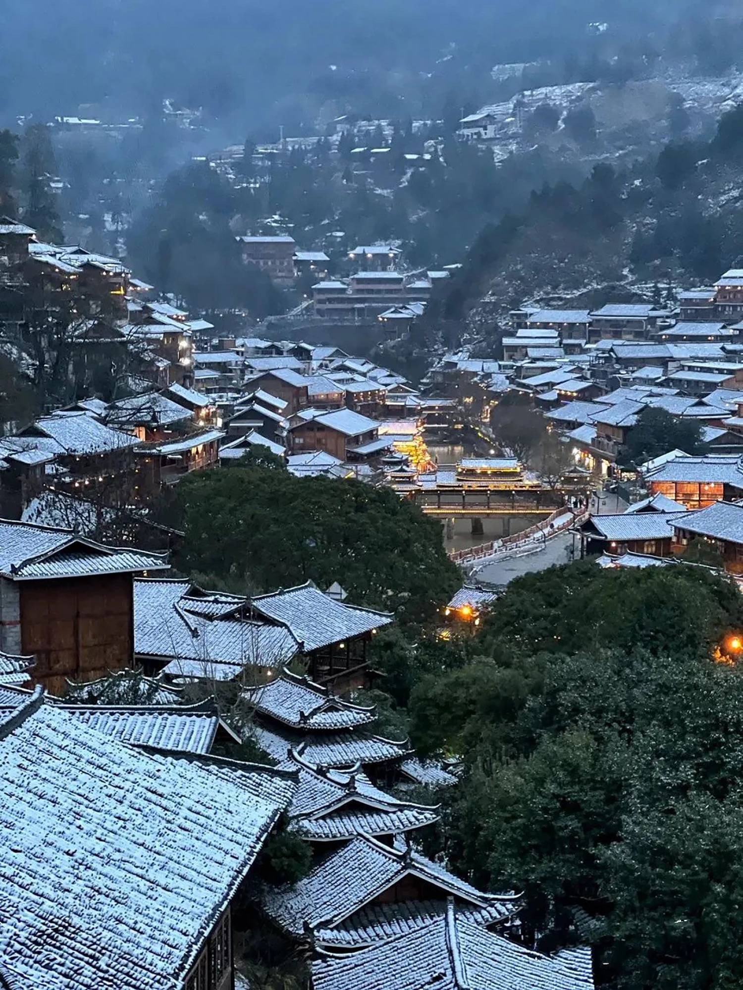 天气渐寒,听闻大雪将至,冬日的苗寨雪景将会是一幅更惊艳的绝美画卷。当白雪覆盖时,整个西江千户苗寨静谧而宁静,犹如一座银装素裹的童话世界。屋顶、树枝、大地上都铺满了洁白的雪,阳光的照射下,雪花闪烁着晶莹剔透的光芒。雪地上的寂静让人与自然更加亲近,让人心灵得到宁静。