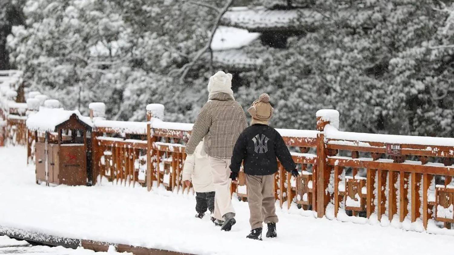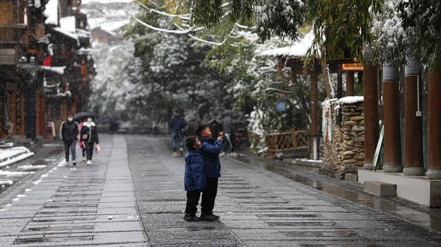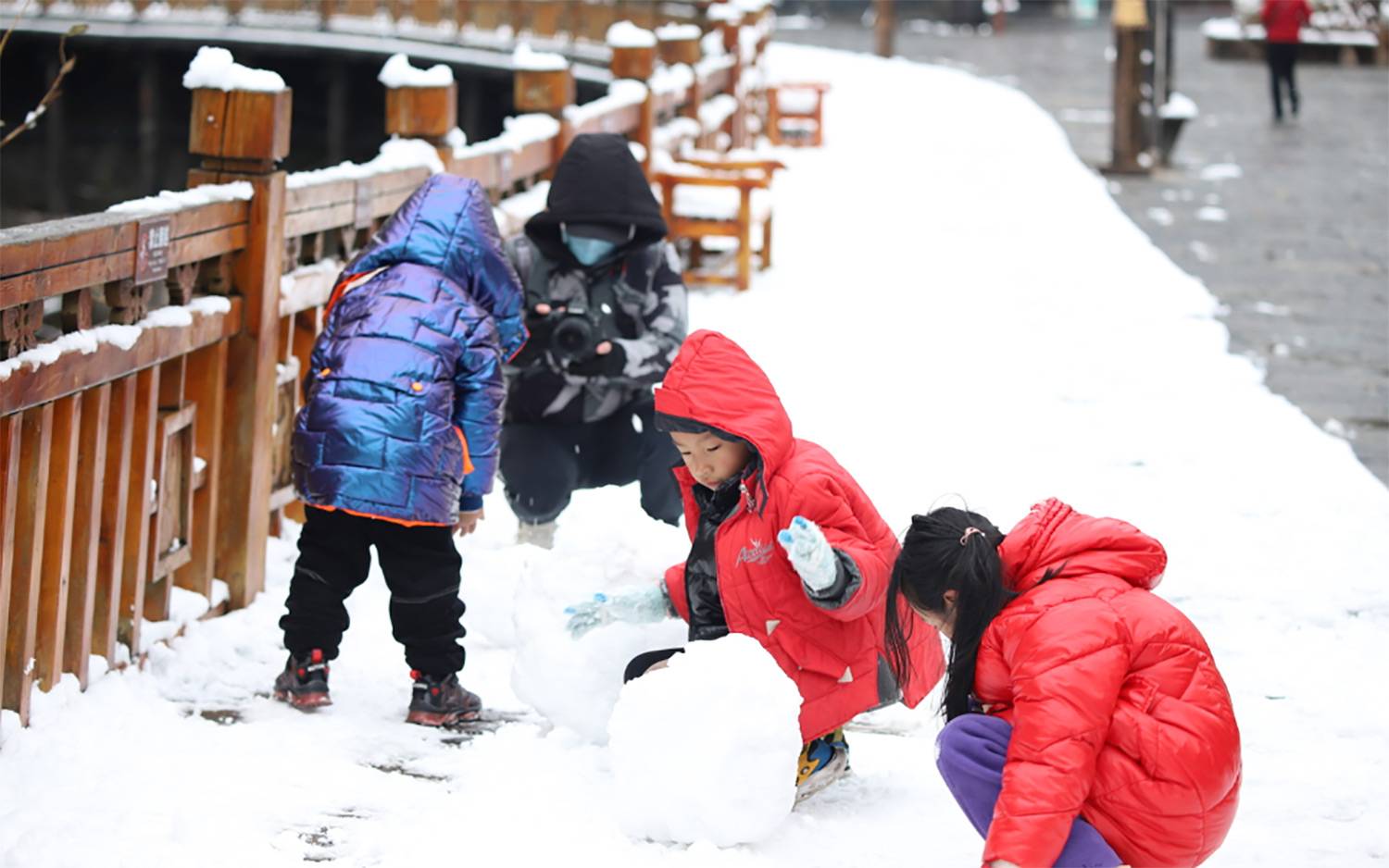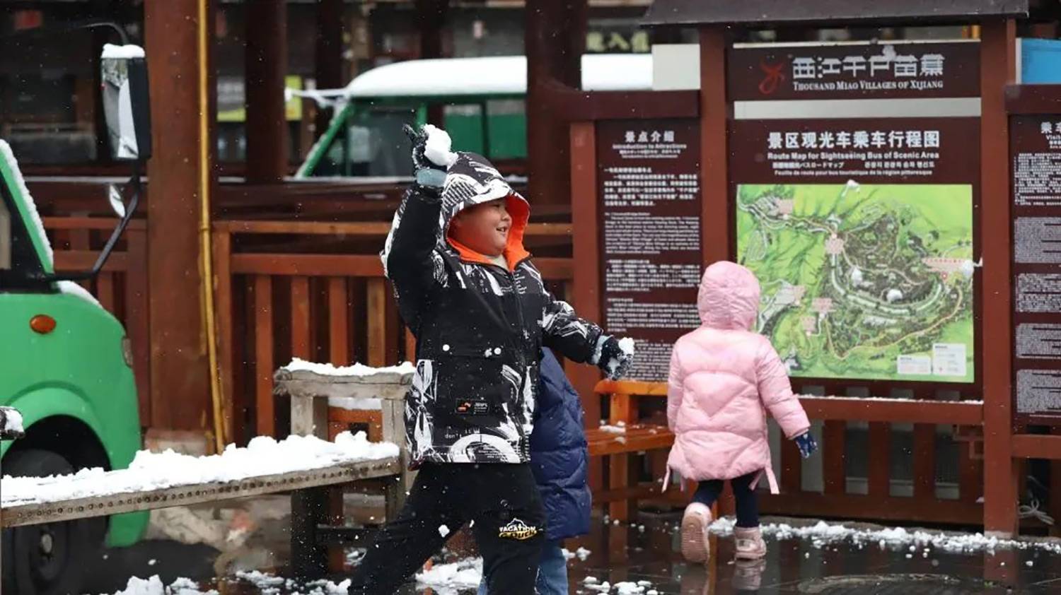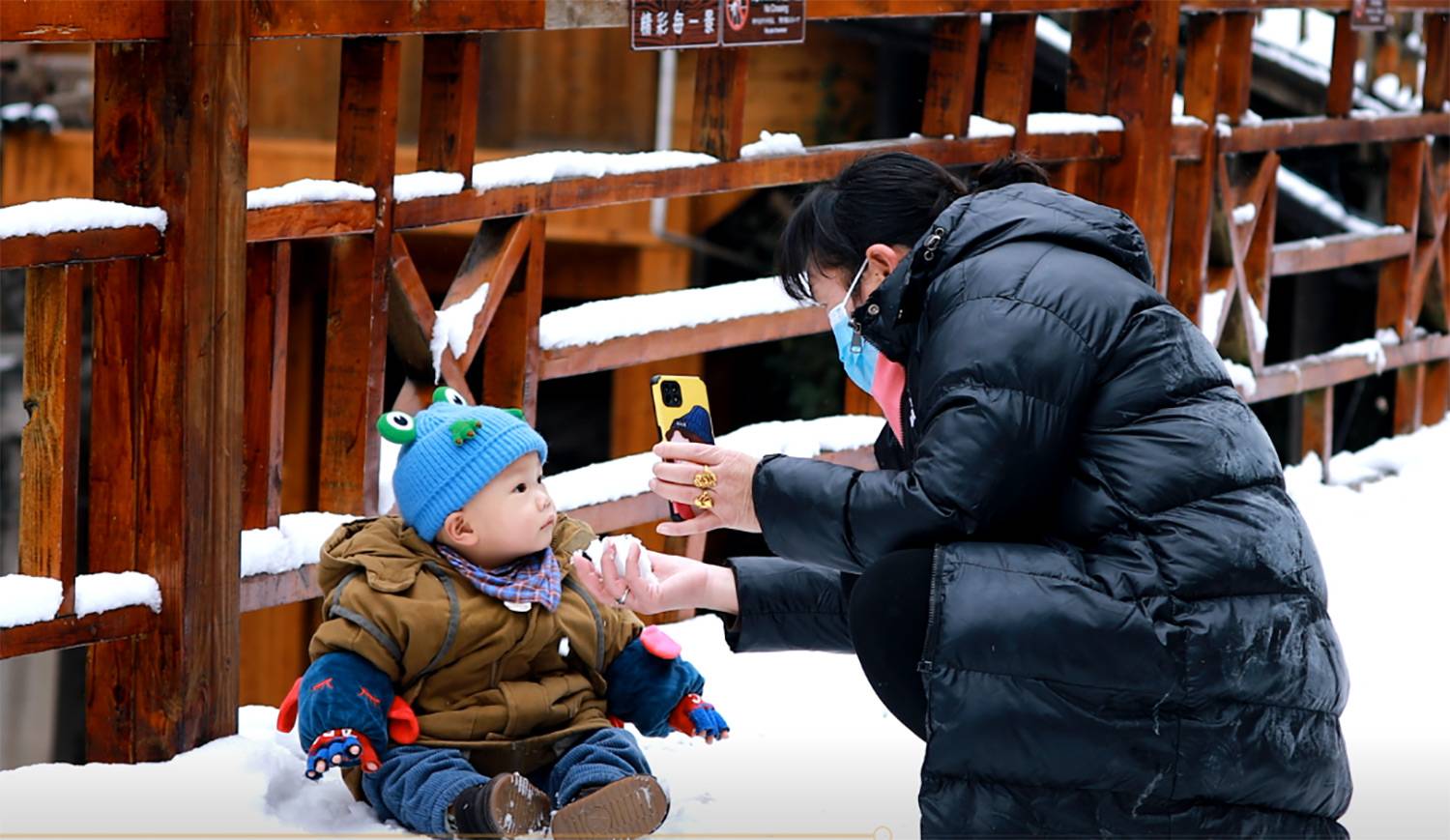 雪后,那白茫茫的大地上清晰可见大大小小的脚印,不少游客换上精美的苗族服饰开启了雪中旅拍,身上色彩斑斓的花纹图案在雪地中显得格外鲜艳美丽,而大人和孩子们兴奋地堆雪人、打雪仗,投入地享受着冬天带来的乐趣。