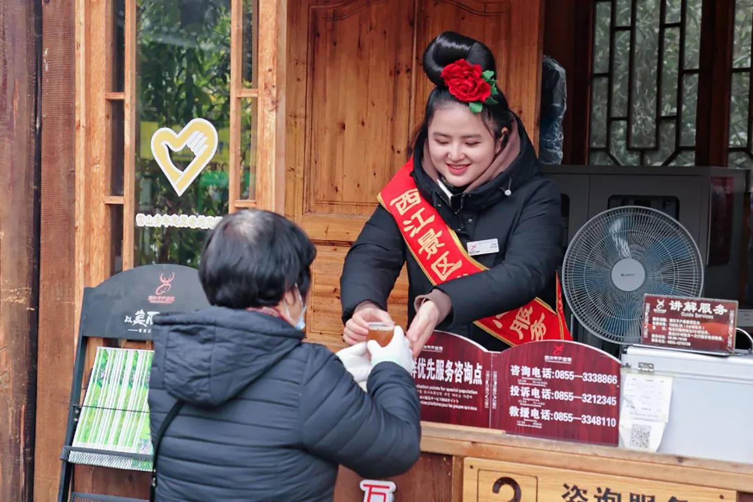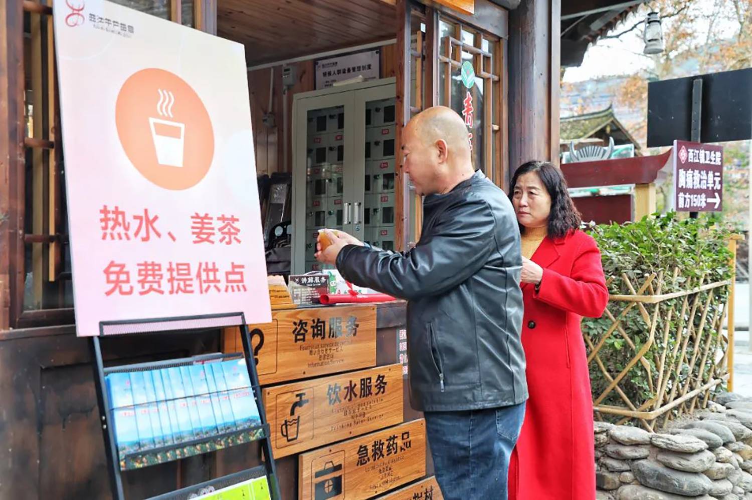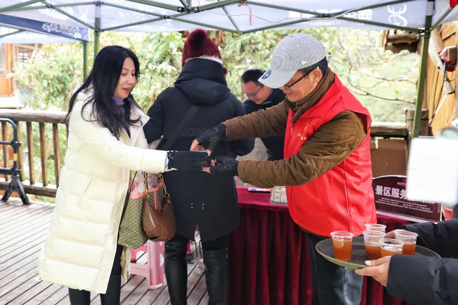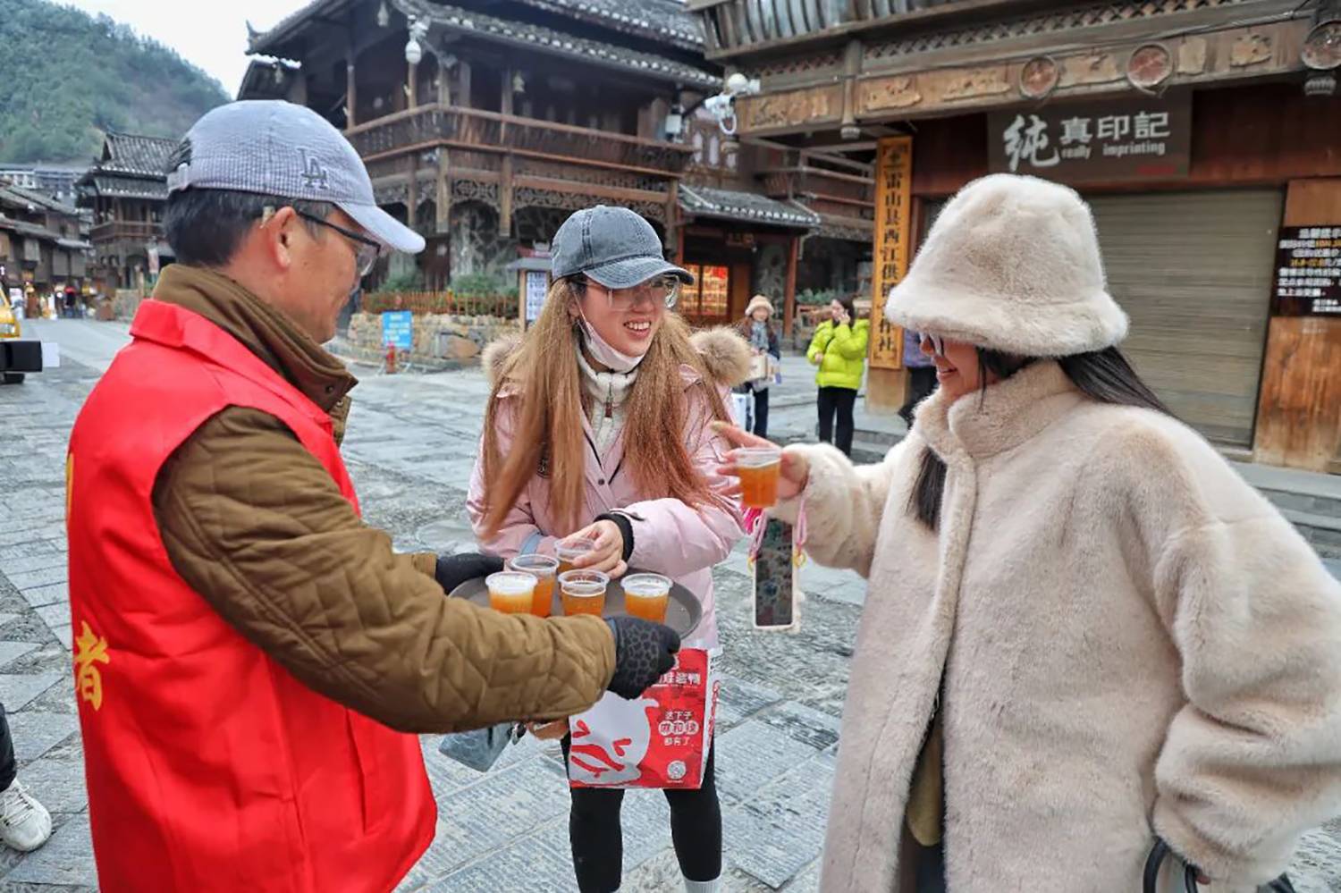 今年的冬天,气温总是“断崖式”下降,为保障游客出行安全,西江千户苗寨景区在游客服务中心、各咨询岗点及人流较多的地方设立了免费送热水、姜茶服务站,为游客免费送姜茶,给广大游客送去温暖,获得游客们的一致好评。