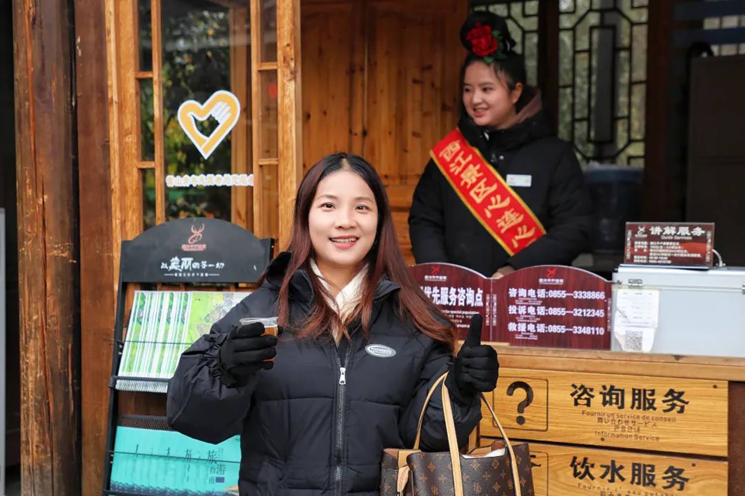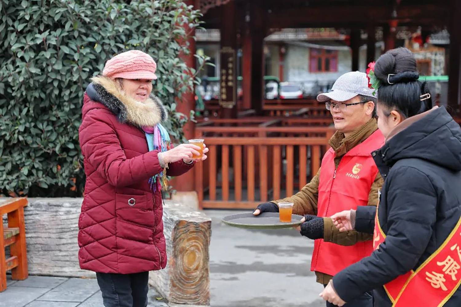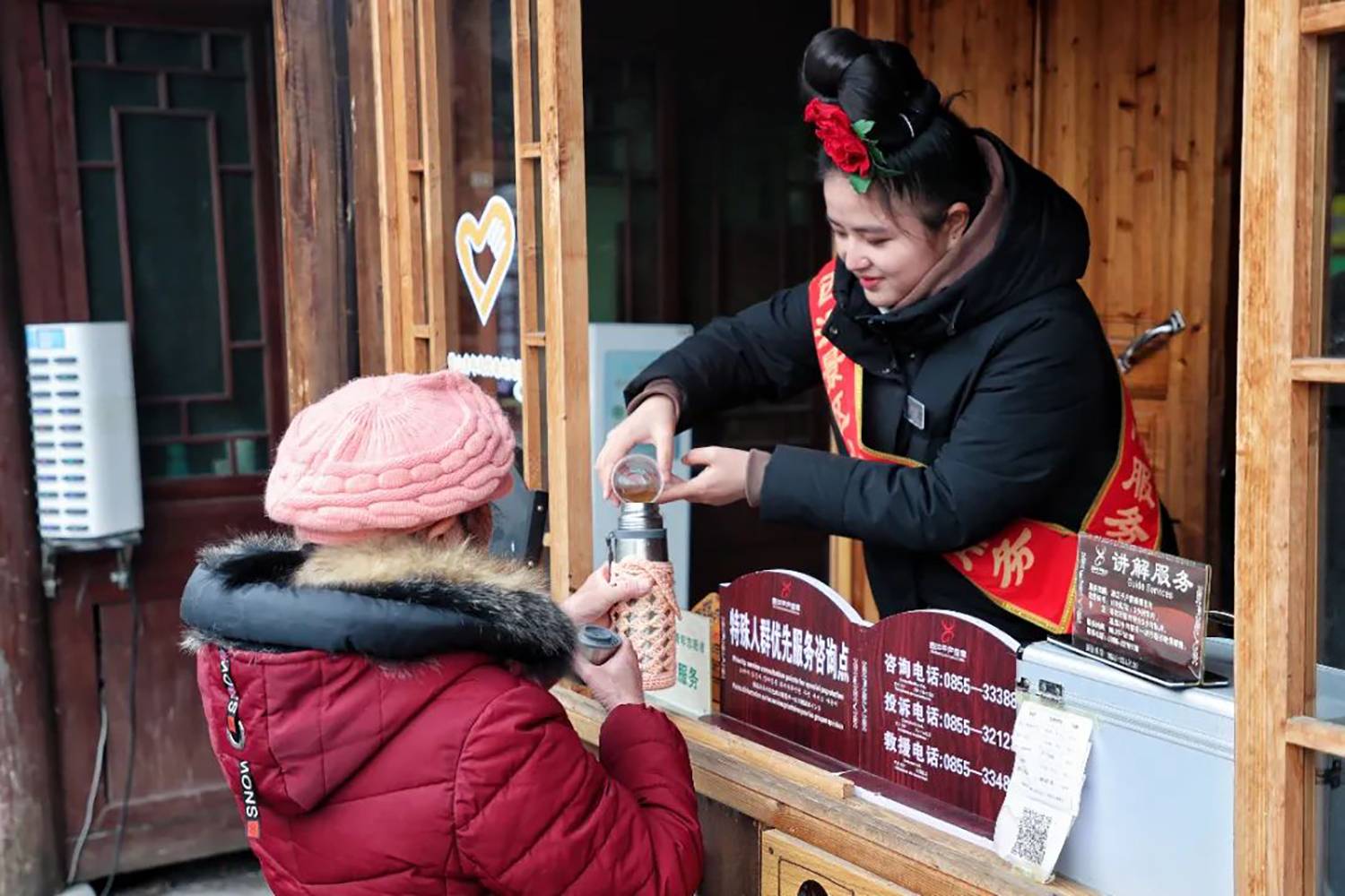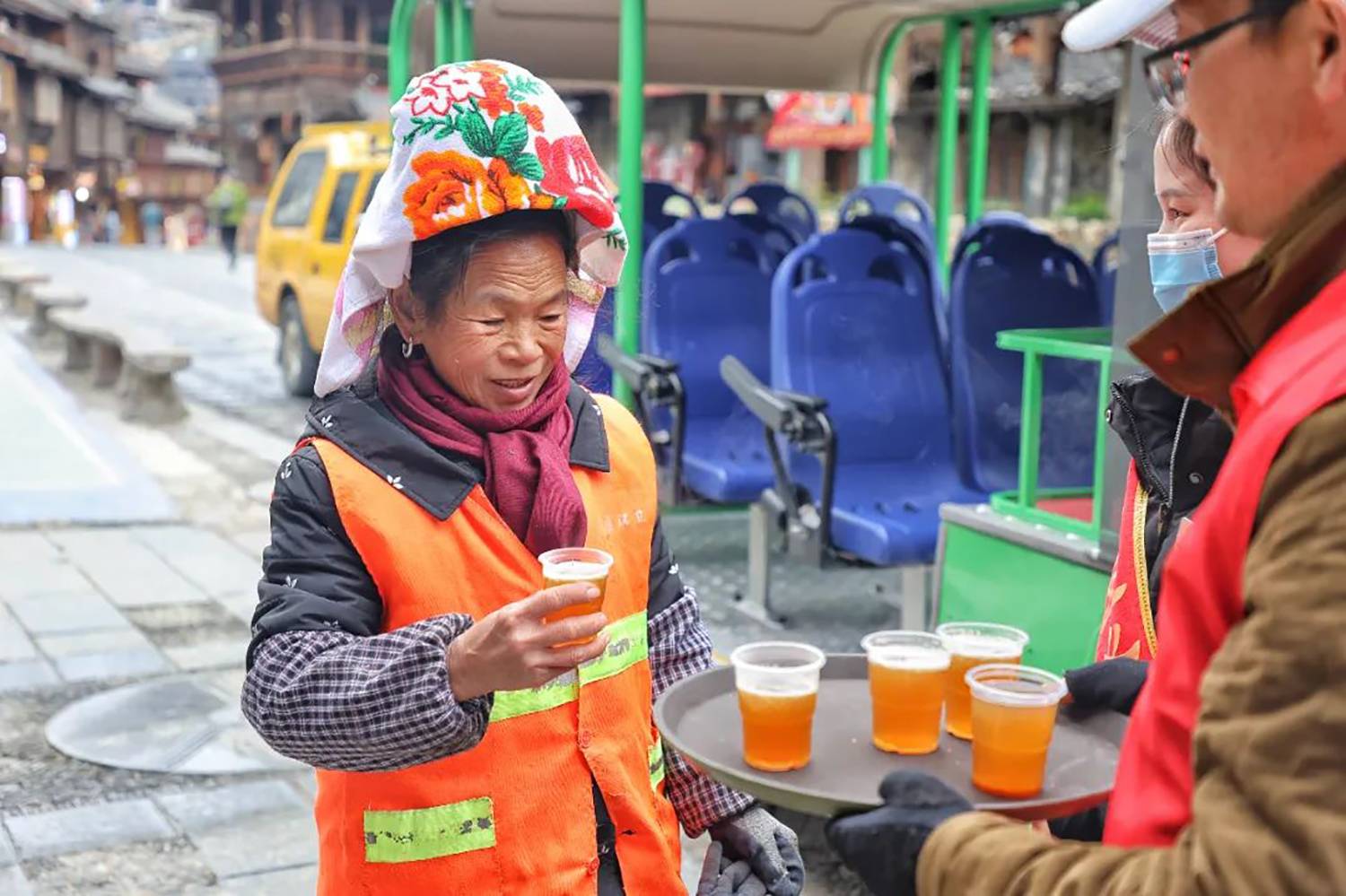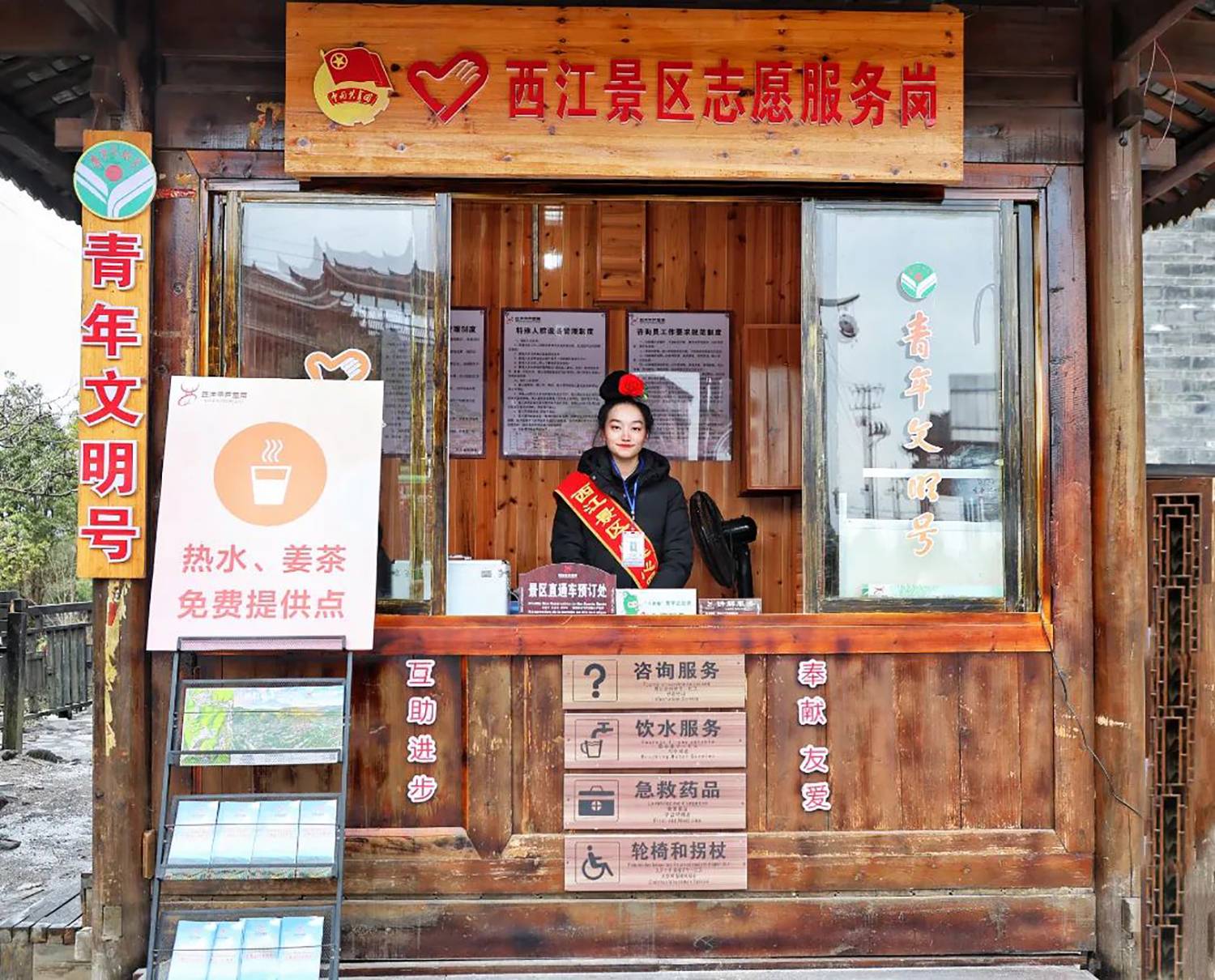 今年的冬天,气温总是“断崖式”下降,为保障游客出行安全,西江千户苗寨景区在游客服务中心、各咨询岗点及人流较多的地方设立了免费送热水、姜茶服务站,为游客免费送姜茶,给广大游客送去温暖,获得游客们的一致好评。
