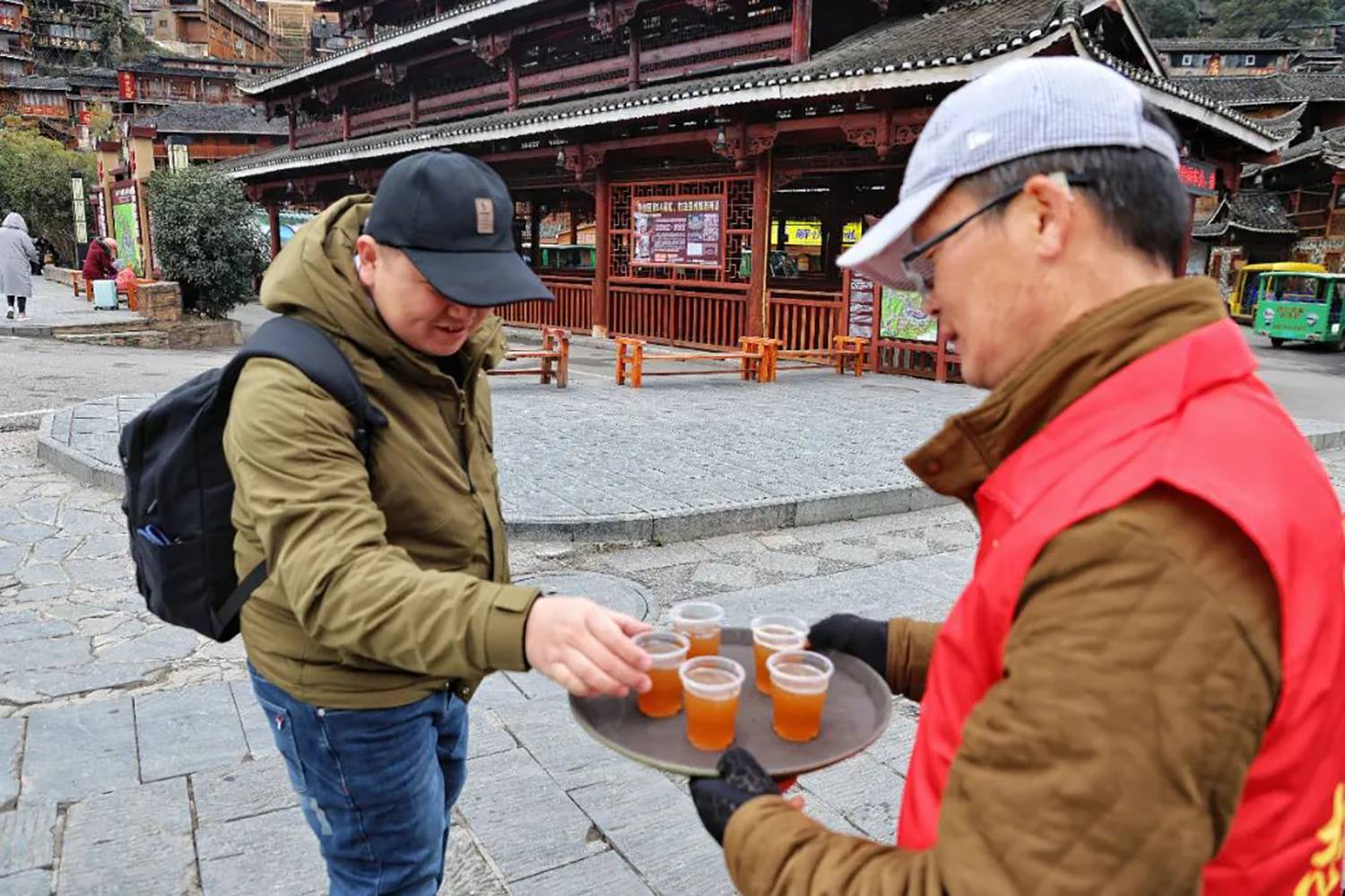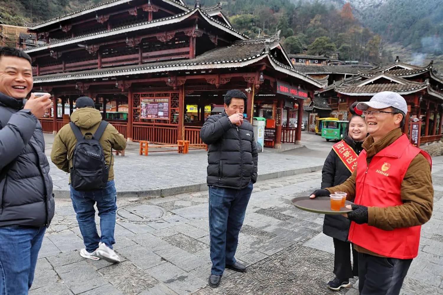 “喝杯姜茶暖暖身子吧。”清早,西江千户苗寨景区的工作人员就在忙碌着给游客们送姜茶,一杯接一杯,他们传递的不仅仅是热乎乎的姜茶,更是暖暖的爱心。随着天气转寒,给游客送上一杯杯热气腾腾的姜茶,只为了帮他们抵御风寒。