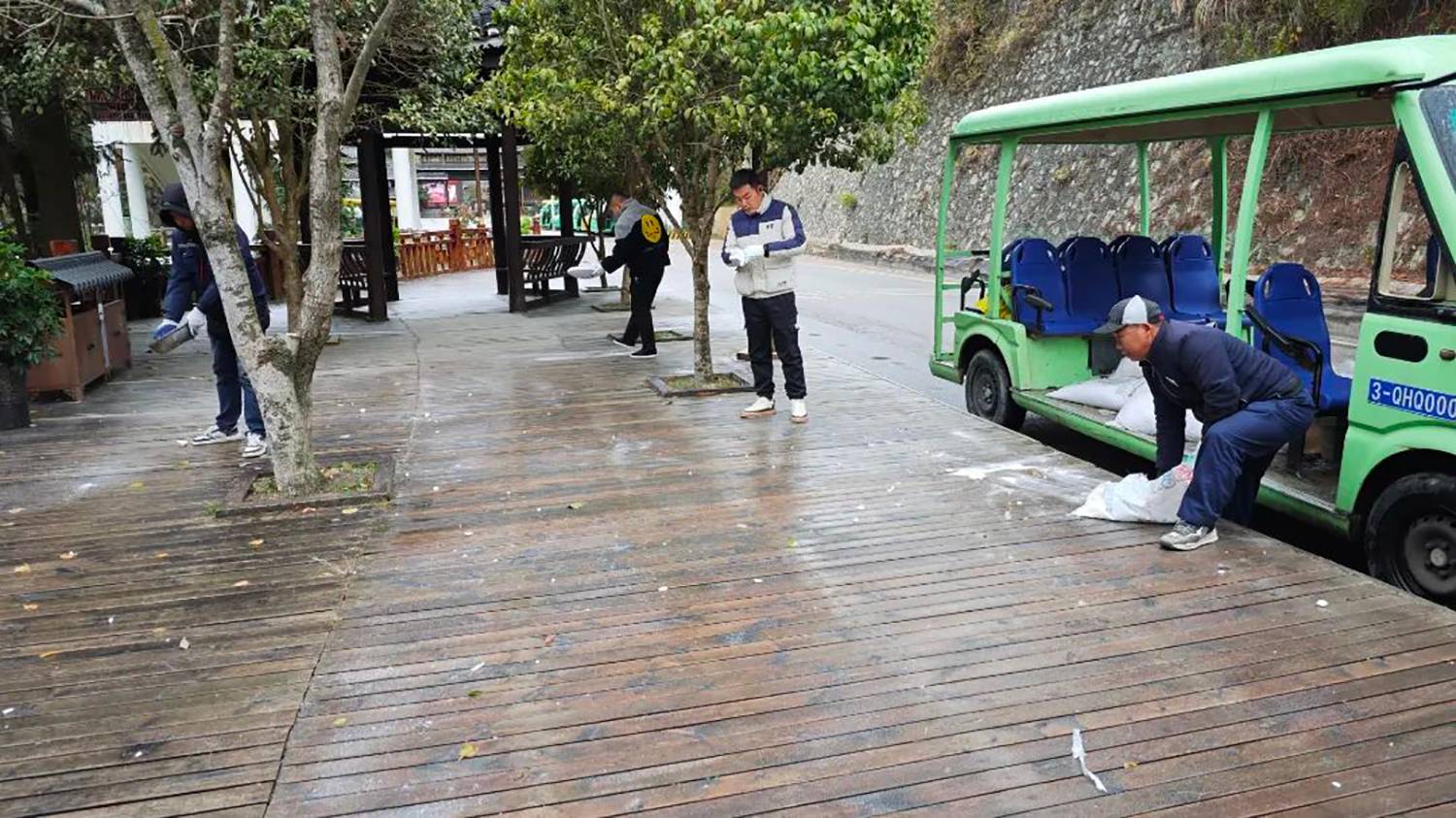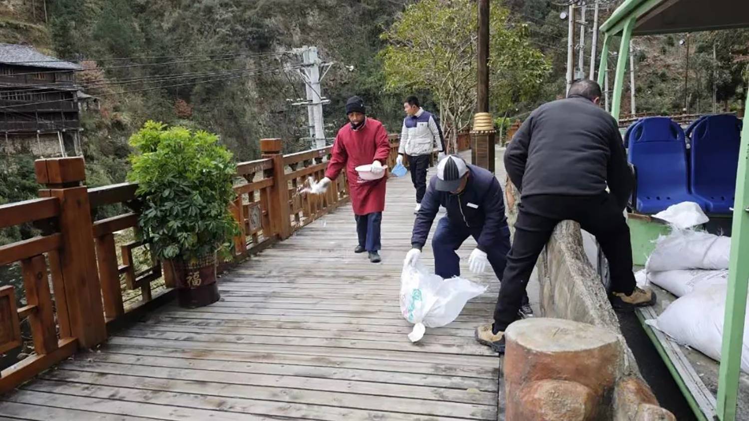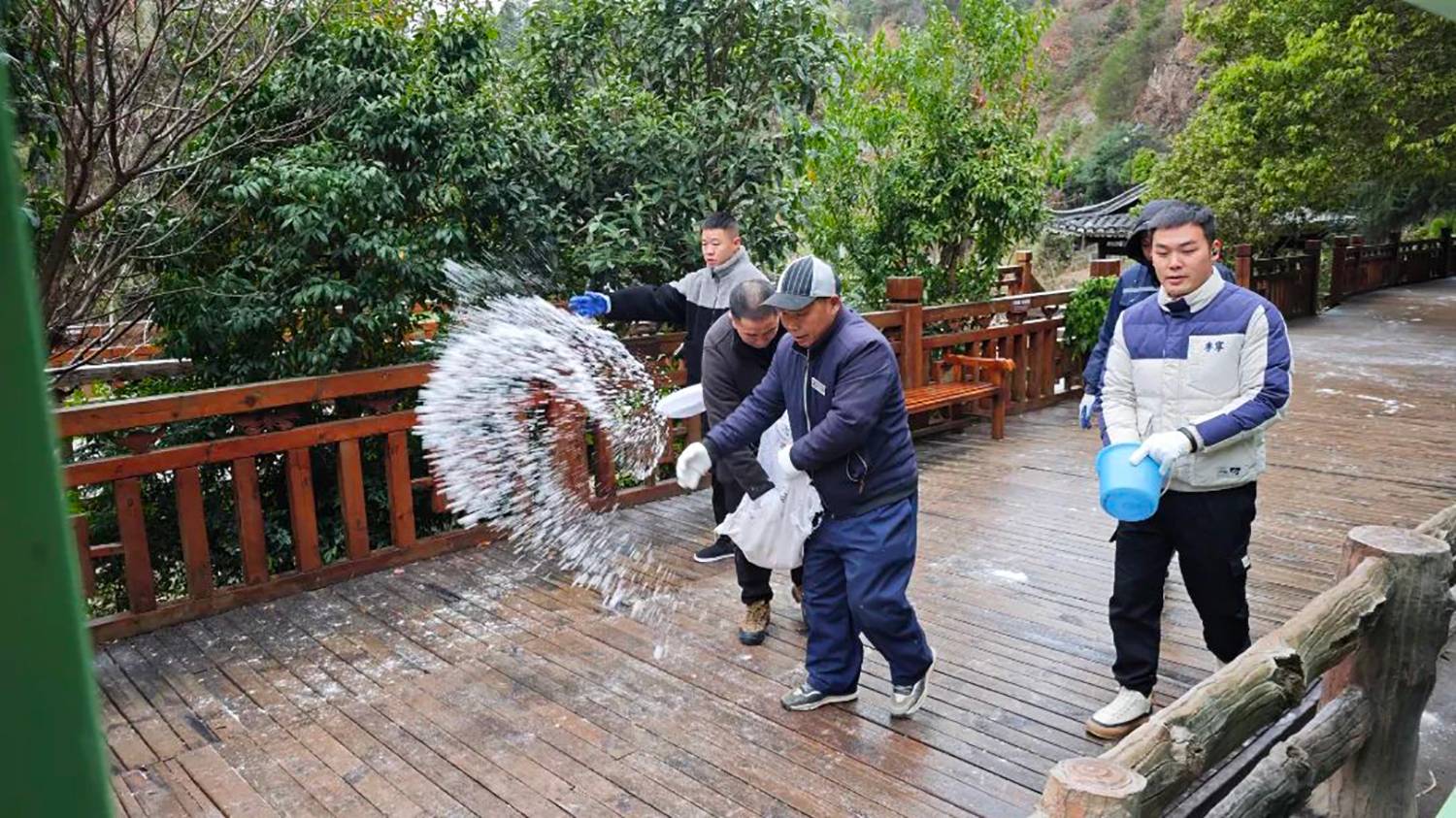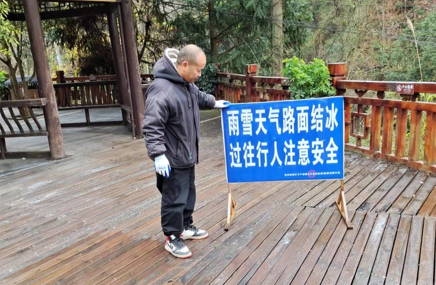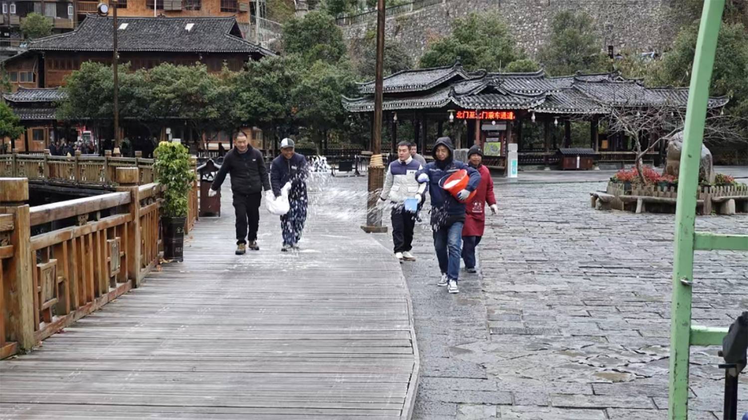 为给游客打造一个安全游览环境,西江千户苗寨景区提前做好风雪抗寒准备,落实寒潮防冻工作部署,以最快的反应速度投入到防寒潮除冰雪的行动当中。在景区内风雨桥道路,田园观光区道路,观景台道路,西门道路等多处撒盐融雪,同时确保各类必需的物资和设备都充足、完备。另外还在重要道路旁放置安全警示牌,逐一排查沿岸安全护栏,消防装置等。