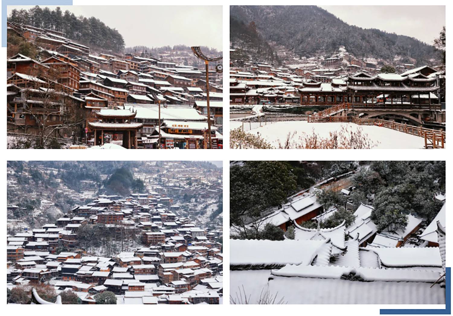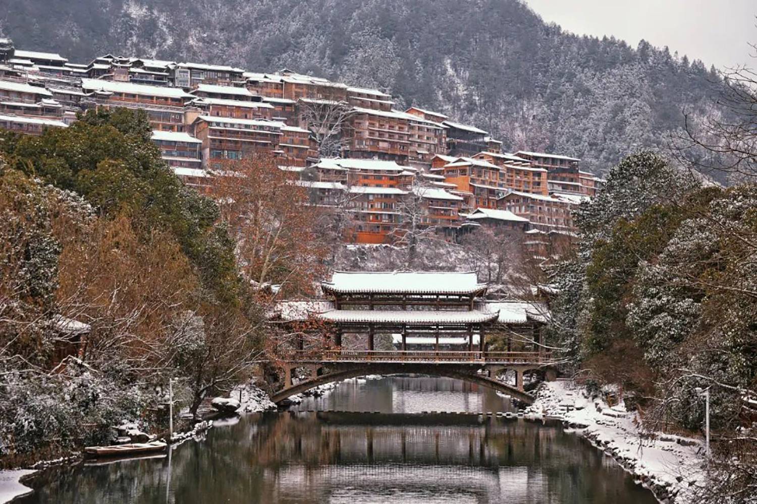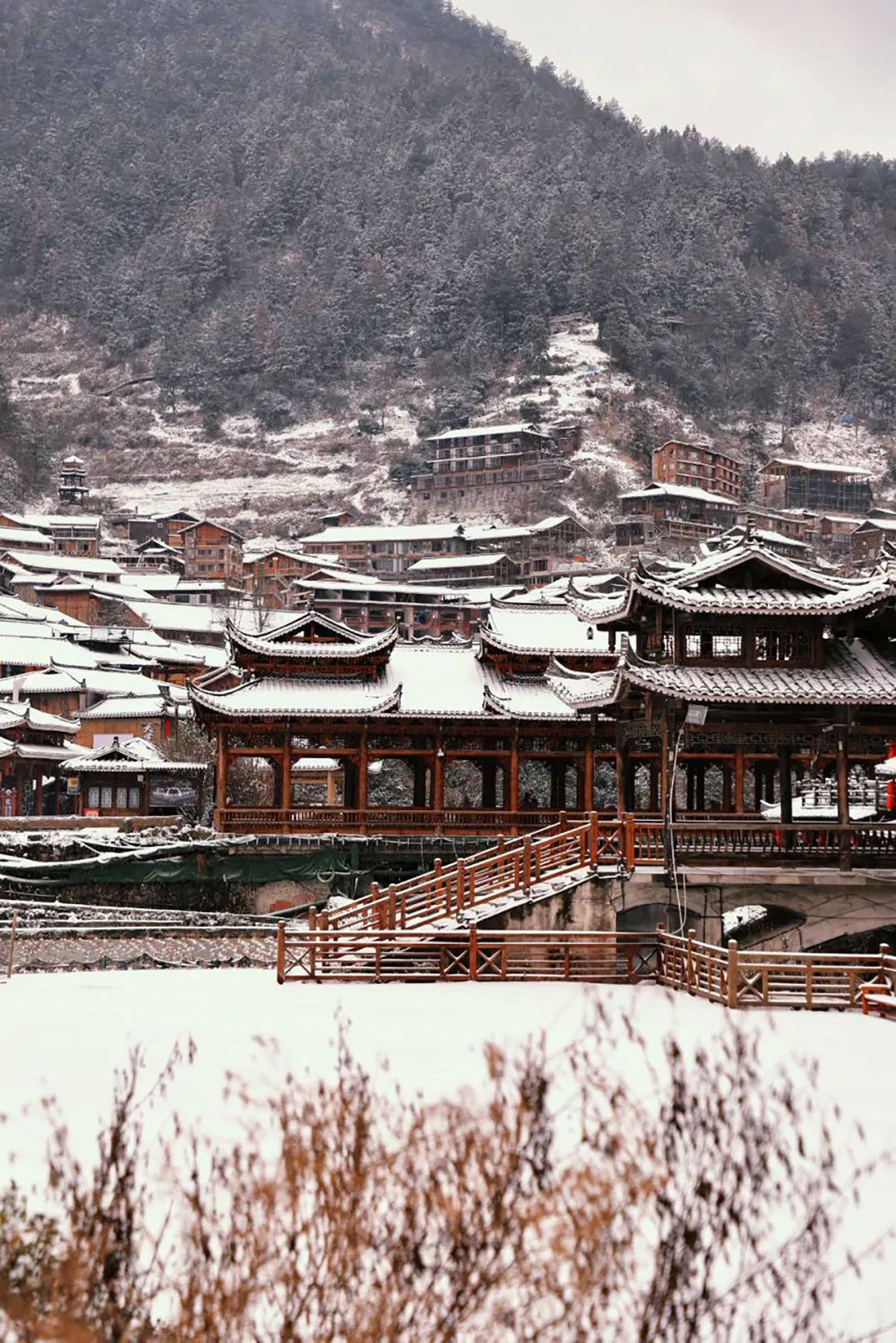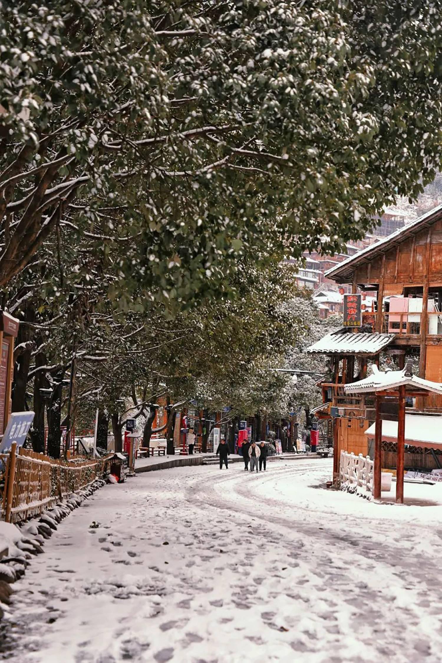 感受吊脚楼、风雨桥在斑驳雪影下的古韵,