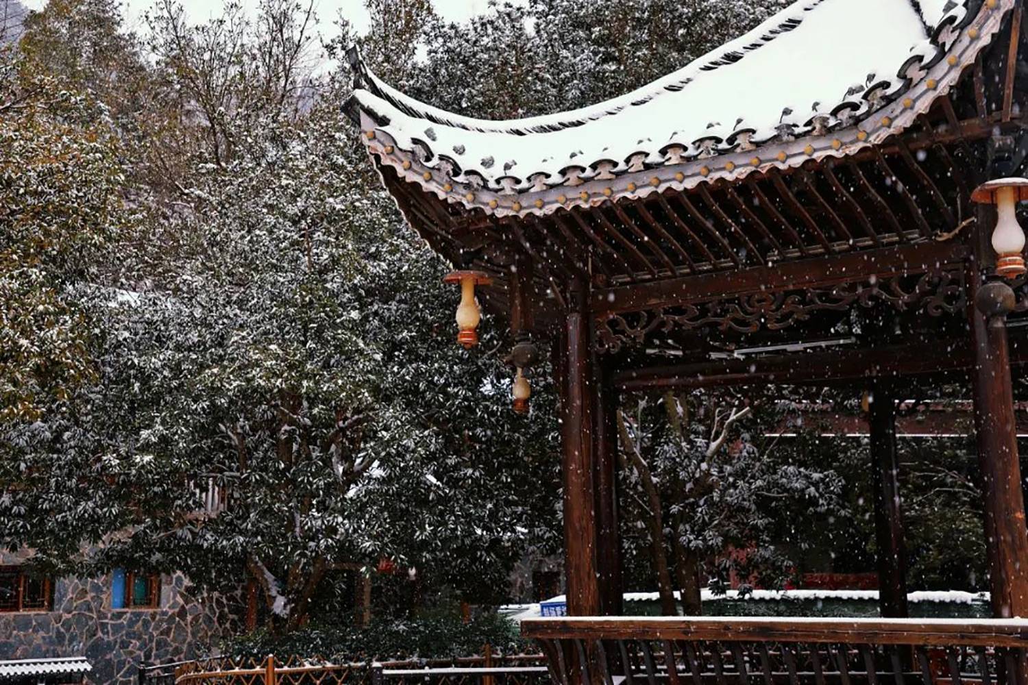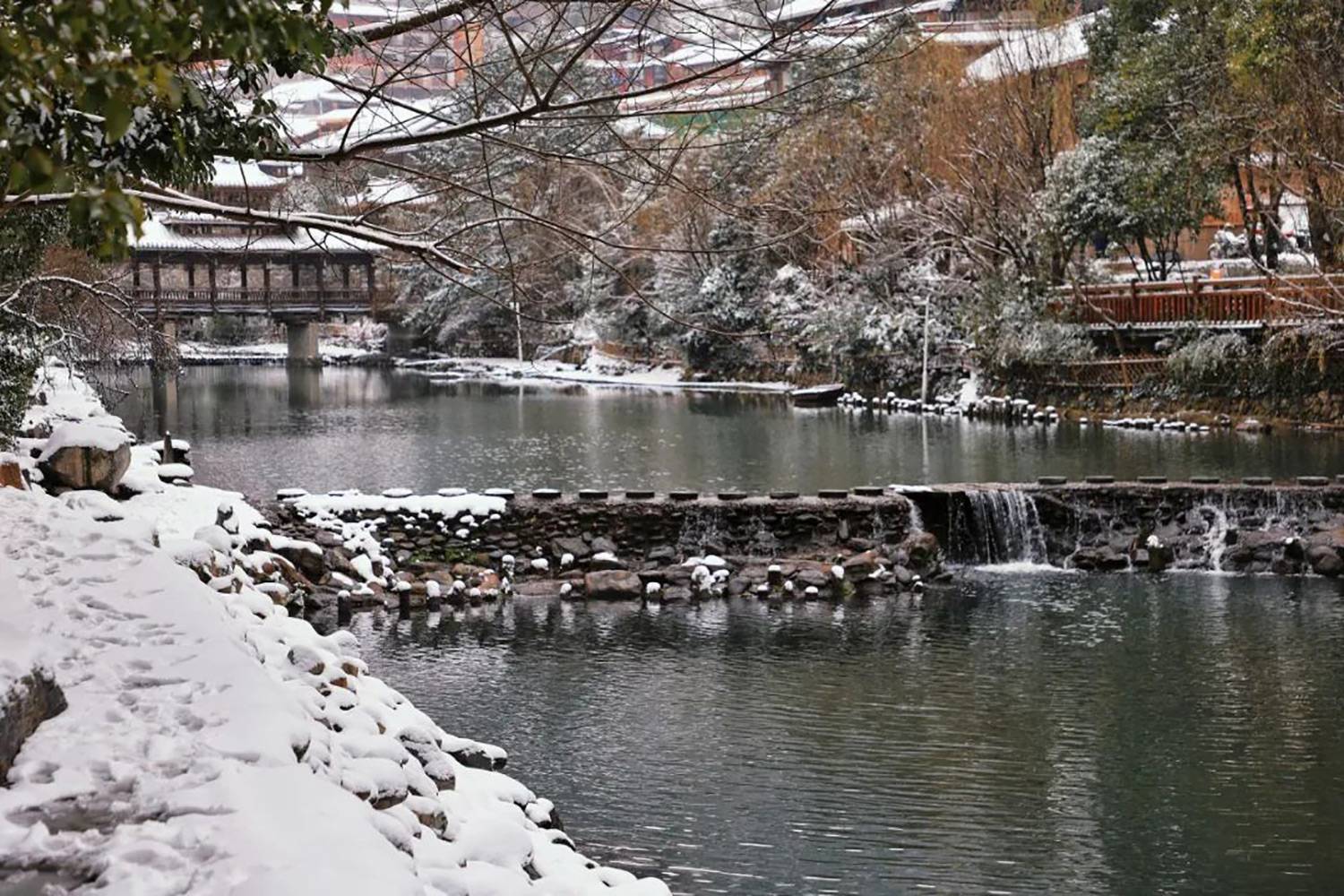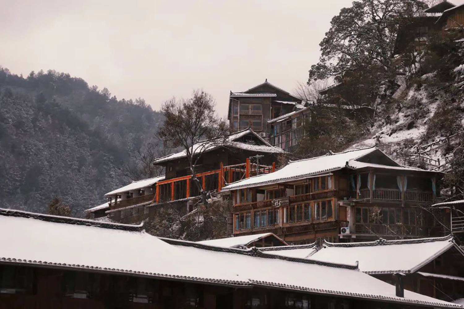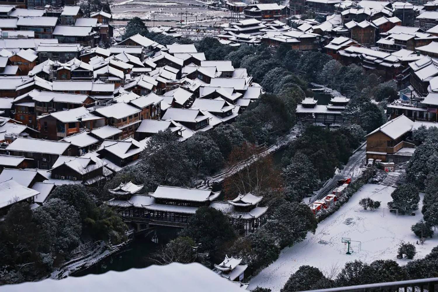 感受吊脚楼、风雨桥在斑驳雪影下的古韵,