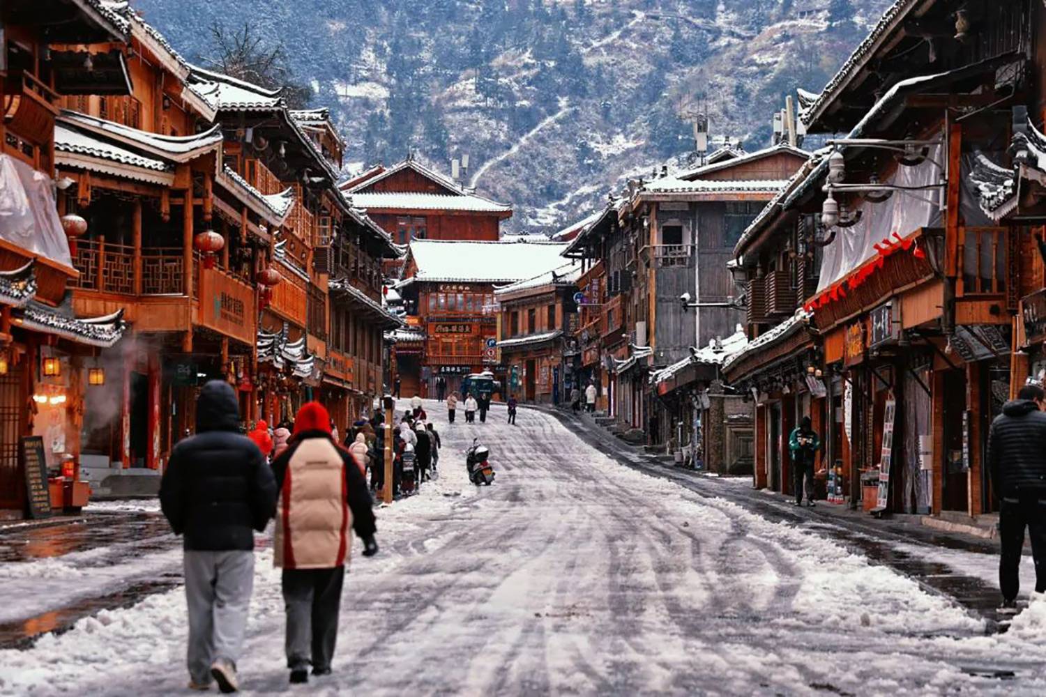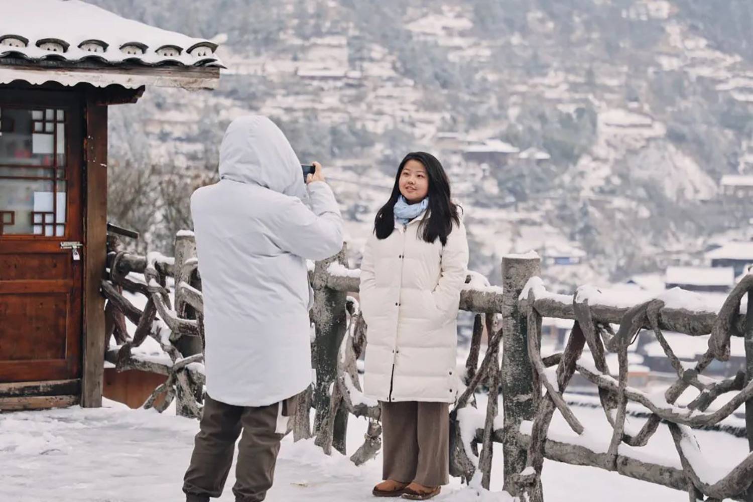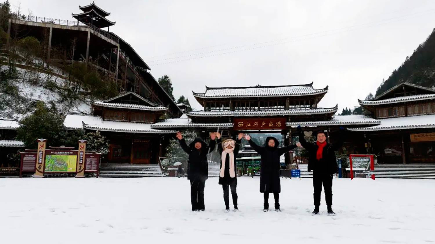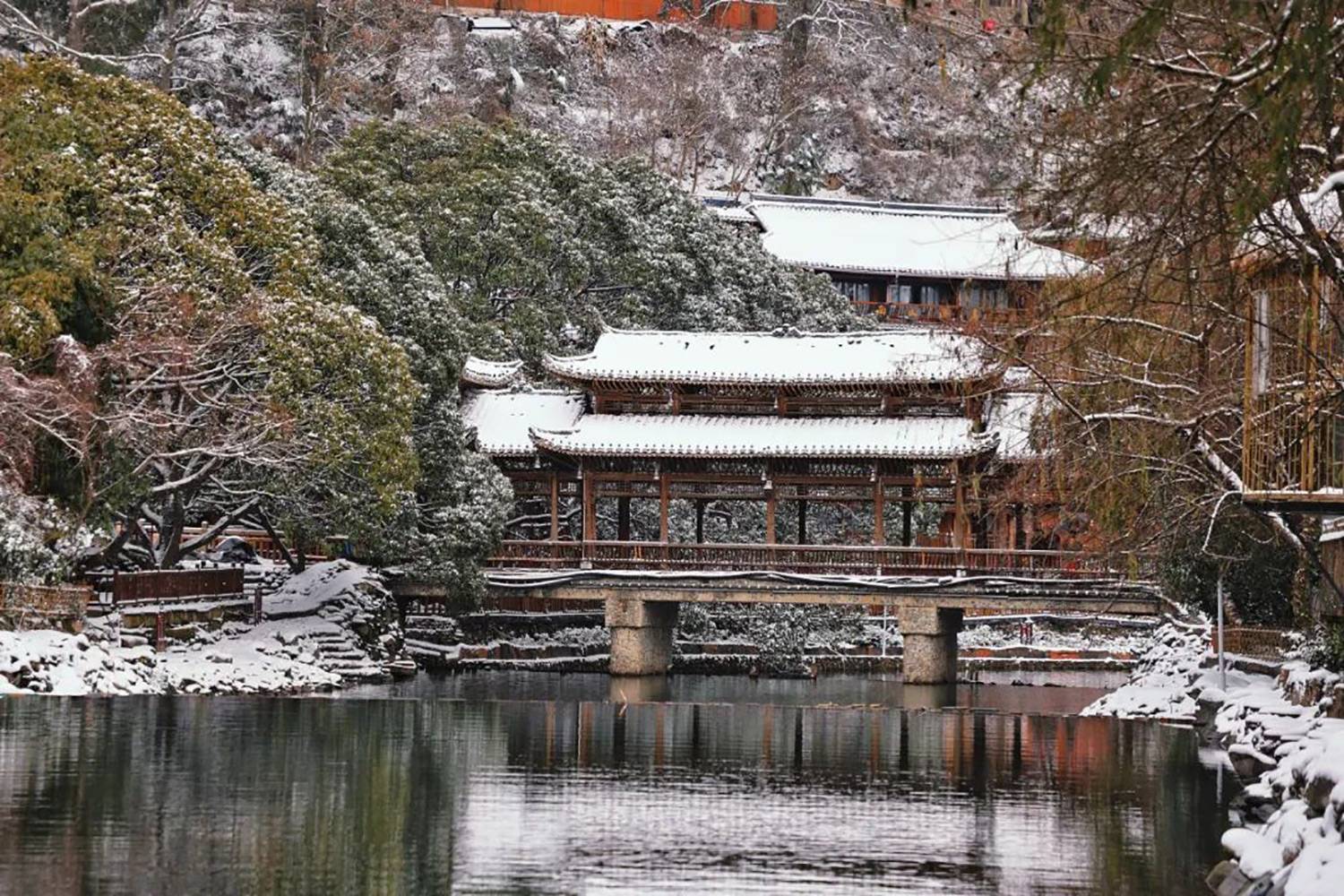 感受吊脚楼、风雨桥在斑驳雪影下的古韵,