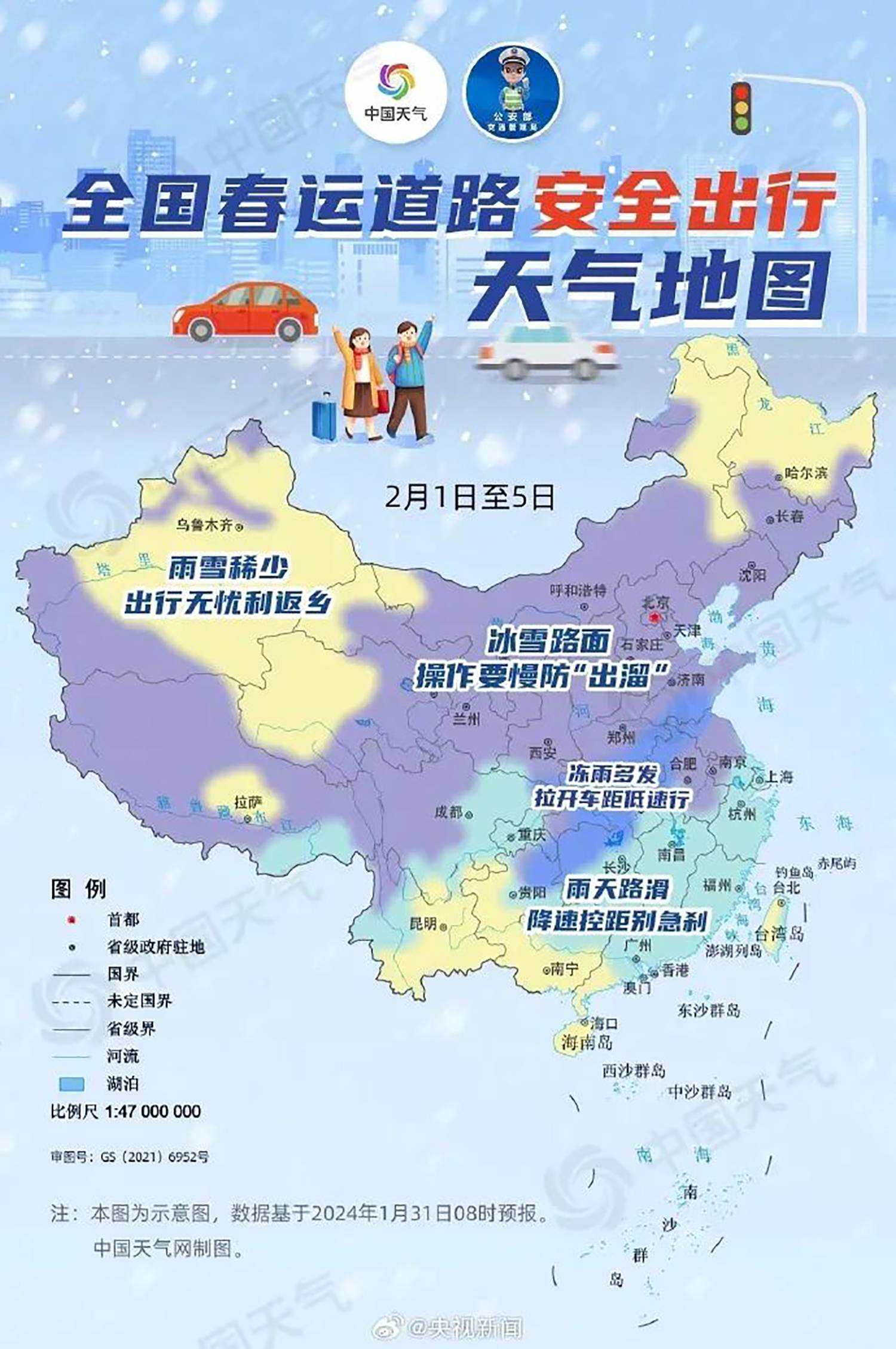 2月1日至5日全国春运道路安全出行天气地图(来源:央视新闻)