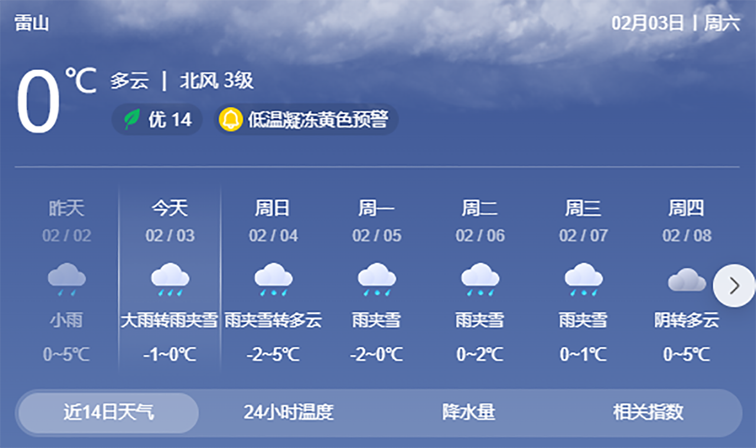 根据气象预报,受冷空气持续补充影响,预计本周末到下周7日全县多阴雨(雪)天气,2日到3日、5日到7日全县以阴雨(雪)凝冻天气为主。其中3日夜间阴天有小到中雨,部分乡镇雨或冻雨转雨夹雪,高海拔地区部分路段有道路结冰;4日雨雪止转多云气温有所回升,雨雪天气暂歇: 5日多云转阴天有小雨,夜间高海拔地区有冻雨或雨夹雪:6日到7日阴天有小雨,高海拔地区有冻雨或雨夹雪,部分路段有道路结冰;8日到9日雨(雪)止转多云气温明显回升,雪凝天气结束。日最低气温-3~1C,将出现在4日或5日清晨,日最高气温 10~12C,将出现在9日白天。为全力做好低温雨雪凝冻灾害防范应对工作,雷山县减灾委已于2月2日21时启动低温雨雪凝冻灾害IV级应急响应。
