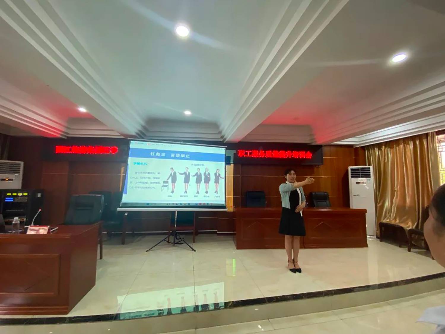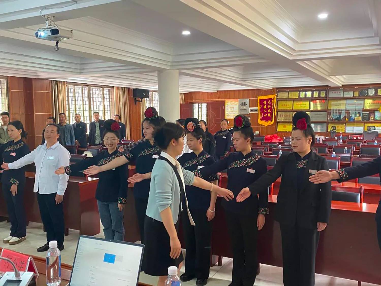 (课上老师指导学员纠正礼仪手势)