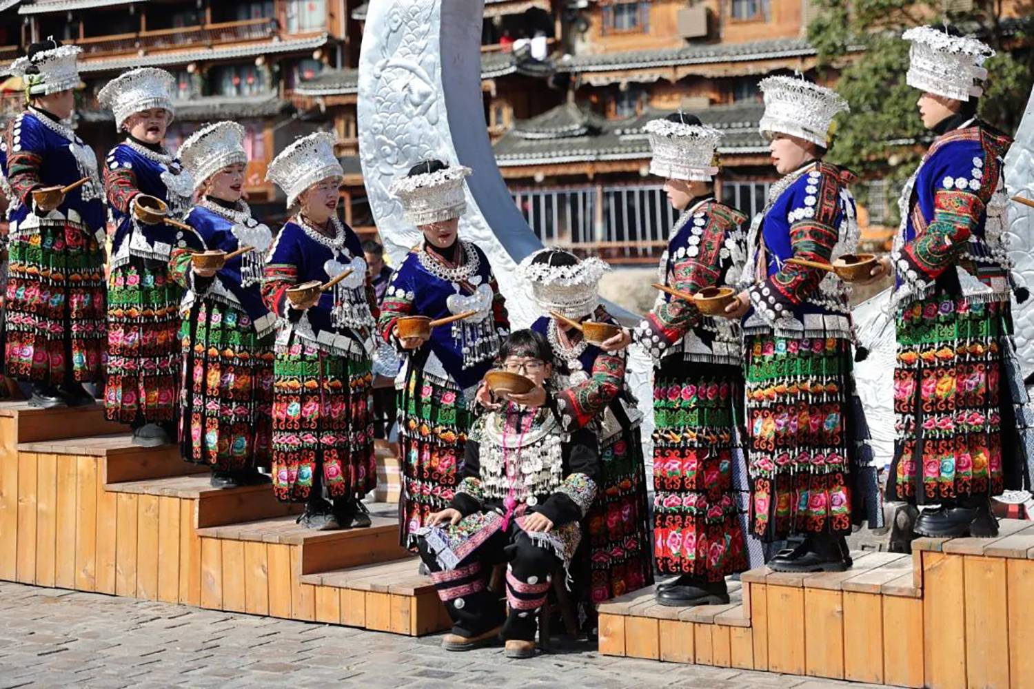 身着盛装的苗家姑娘们以苗族最高礼仪敬酒迎宾仪式——十二道迎宾酒/茶喜迎八方来客。