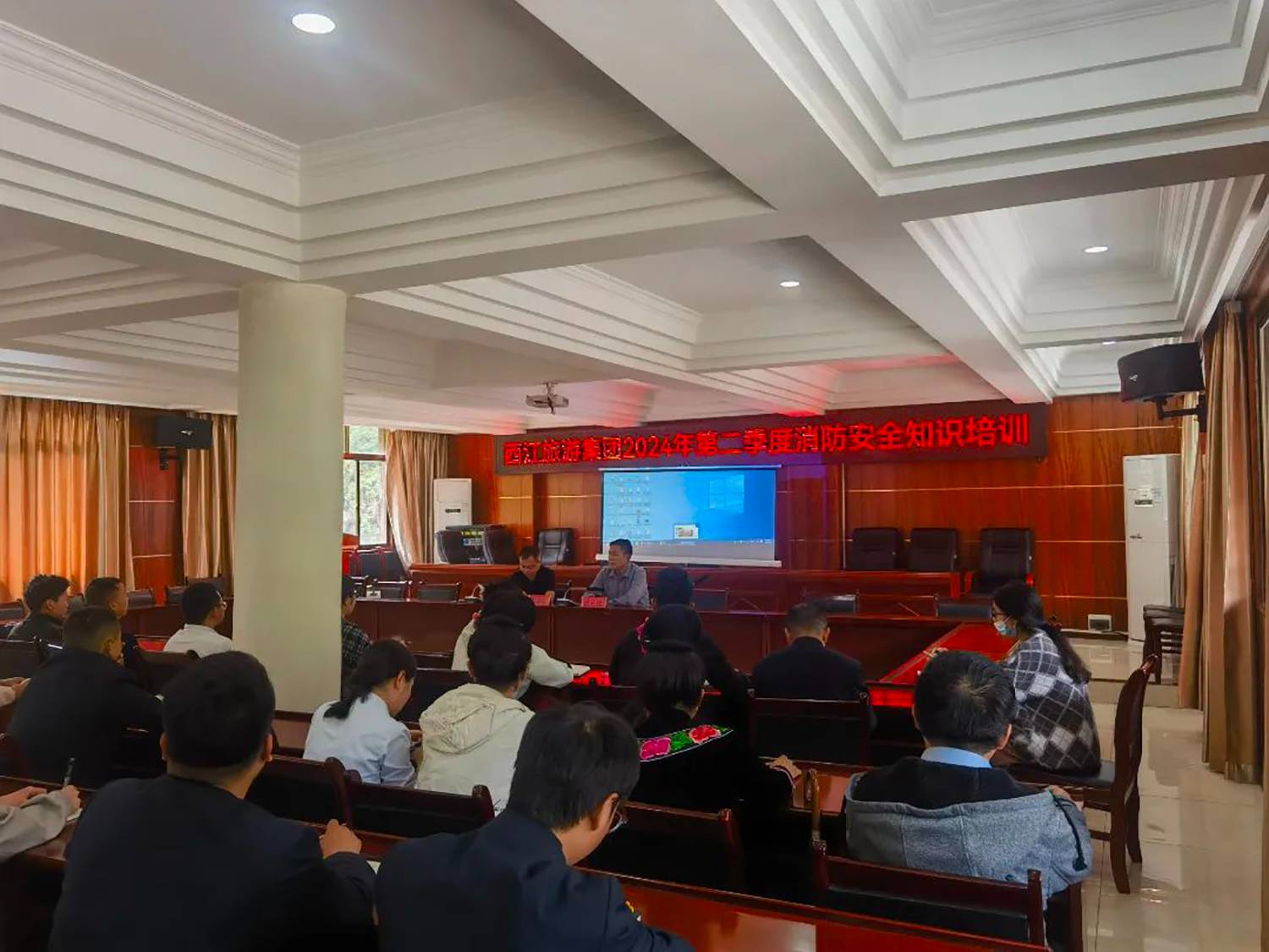 为进一步提高西江旅游集团全体职工消防安全知识及灭火技能,贯彻“预防为主、防消结合”的消防工作方针,2024年4月23日下午,西江旅游集团于公司二楼会议室开展“西江旅游集团2024年第二季度消防安全知识培训”。本次培训会特邀请贵州安全知识科普中心陈应德教官进行授课,西江旅游集团党委委员、副总经理覃海军同志主持并发言。