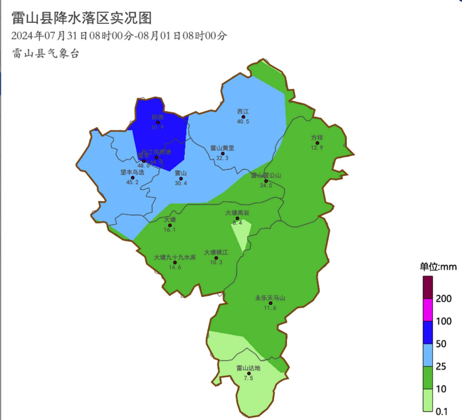 据气象监测,31日8时至8月1日8时全县阴天间多云有阵雨或雷雨,共出现3站暴雨(鸡勇塘64.0、郎德61.9、龙塘55.5)、5站大雨、6站中雨、2站小雨。8月1日8时全县阴天有小雨,气温21.9℃(西江)~22.6℃(郎德);丹江:阴天有小雨,气温22.4℃,偏北风0.2m/s,相对湿度97%。