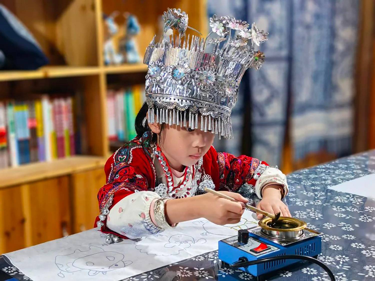 课程内容:苗族古歌说“榜香眉毛变木蓝,摘来泡在木缸中,制成青靛蓝又蓝,染衣染布我们穿。”在蜡染劳动馆,亲手触摸那些承载着苗族文化记忆的古老工具,通过熔蜡、画蜡、洗蜡,一步步揭开蜡染的神秘面纱。