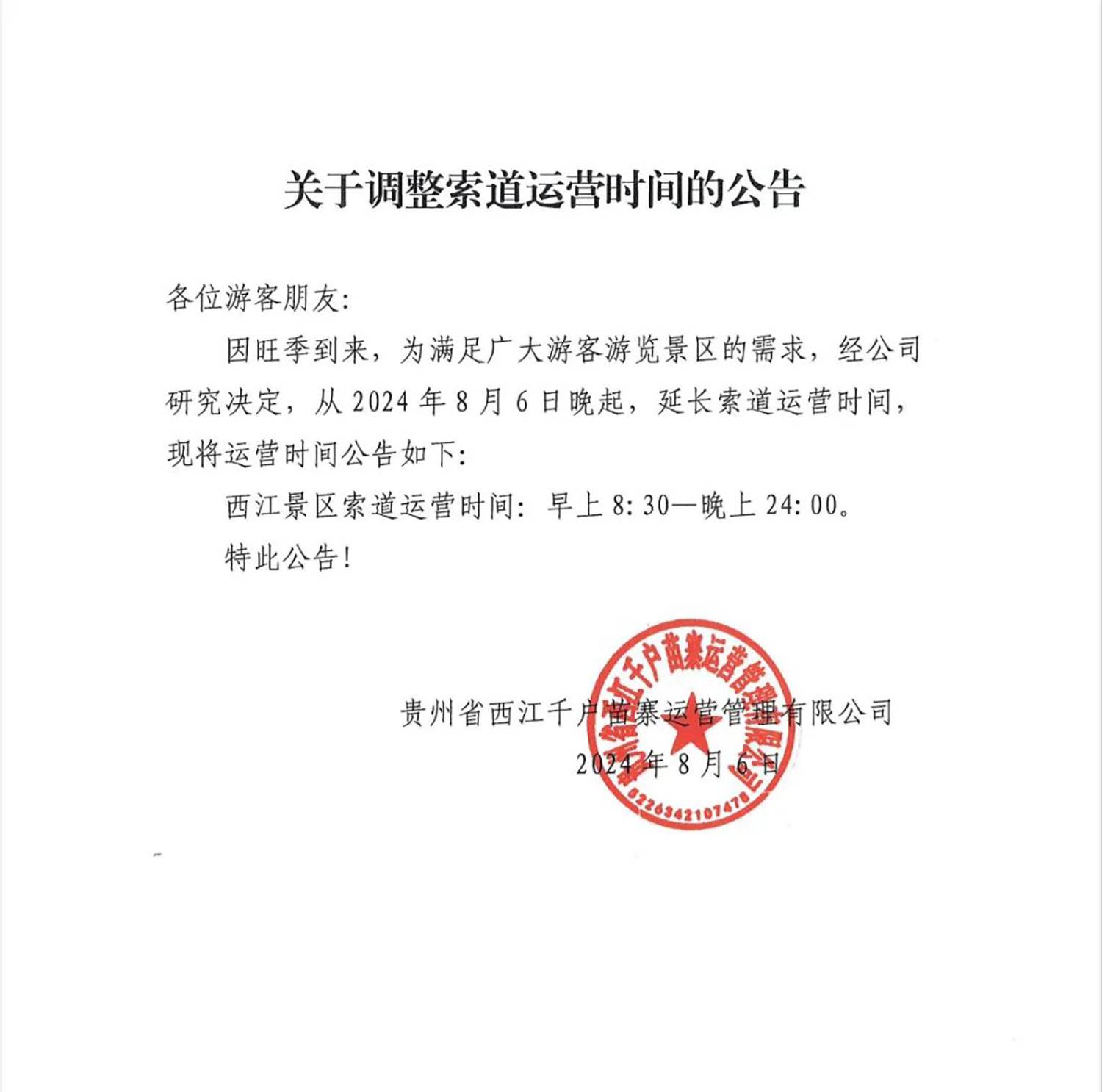 因旺季到来,为满足广大游客游览景区的需求,经公司研究决定,从2024年8月6日晚起,延长索道运营时间,现将运营时间公告如下: